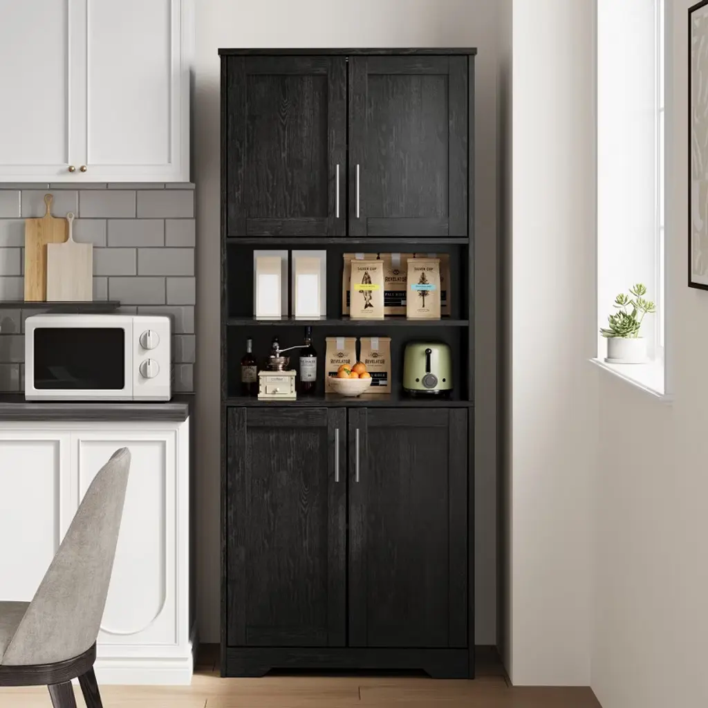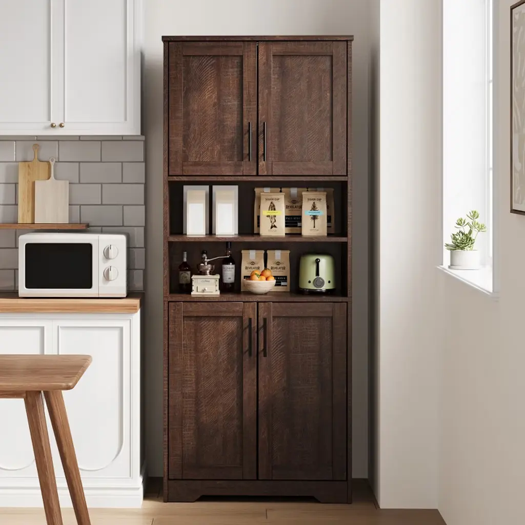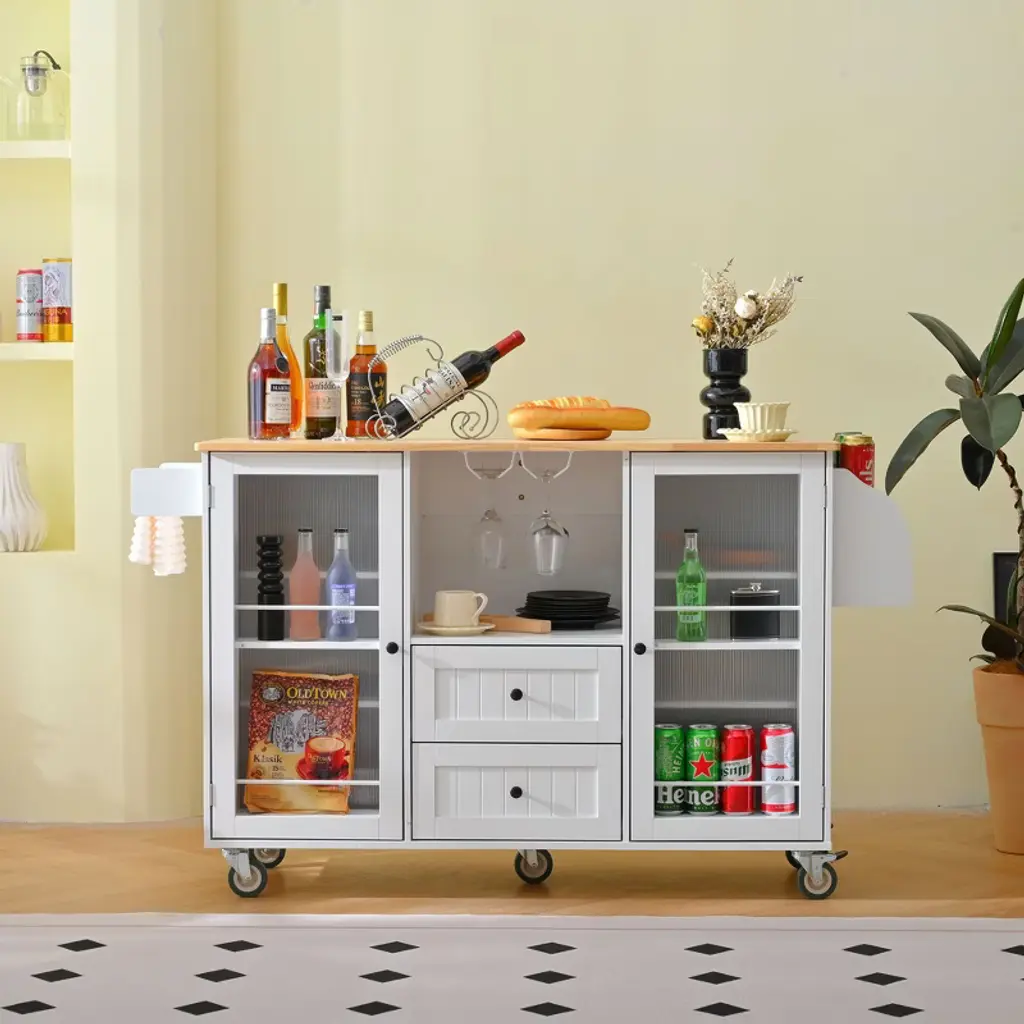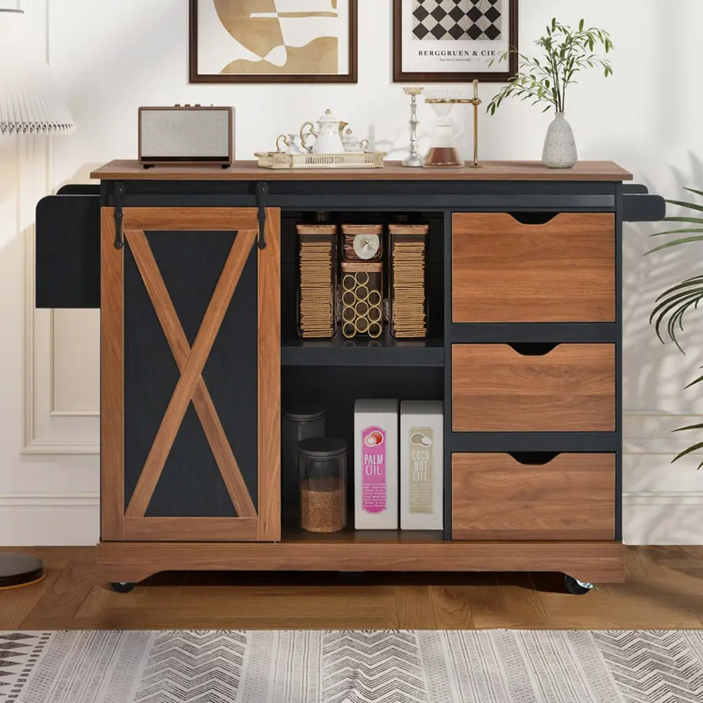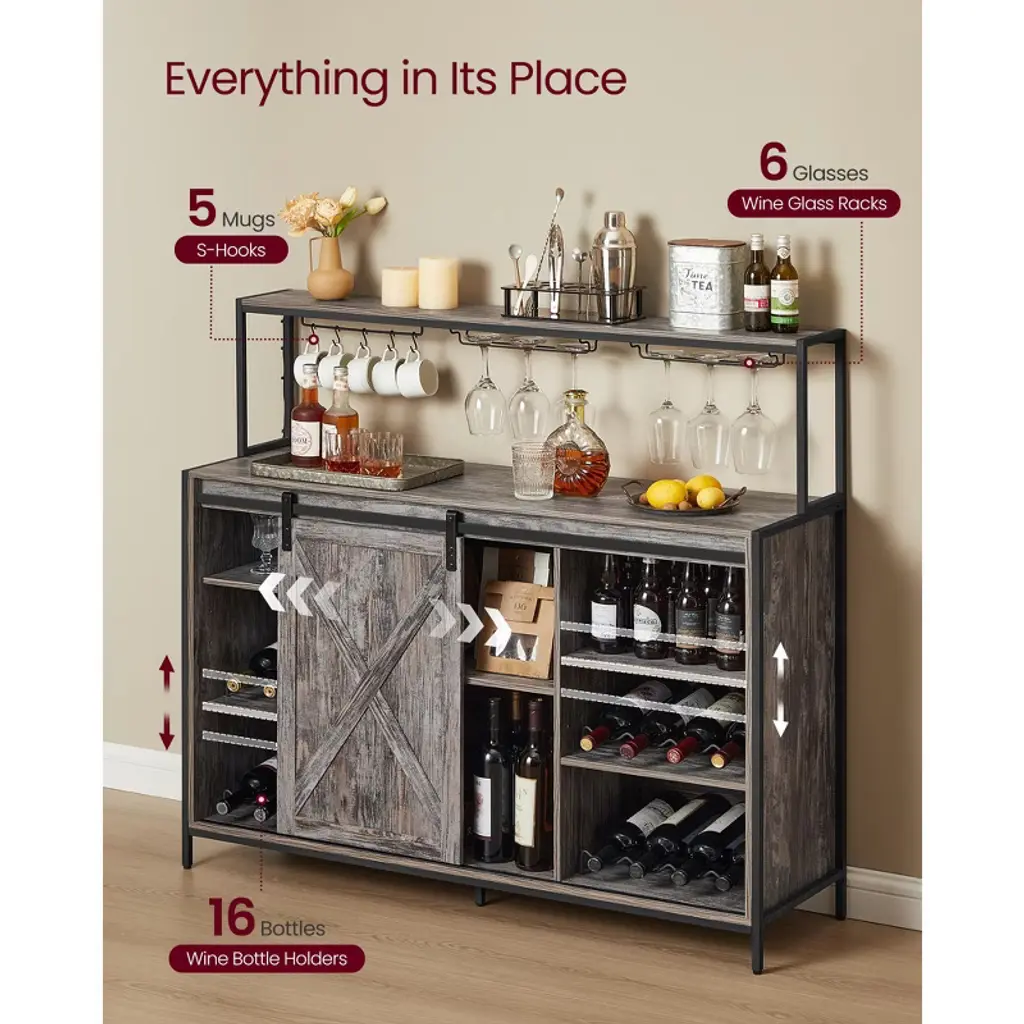 Transform your space with this multifunctional coffee bar cabinet. The finish with sliding barn doors adds contemporary farmhouse charm to any room. Offering specialized storage including wine glass racks (6 capacity), bottle holders (16 bottles), S-hooks for mugs, and multiple compartments, this premium MDF and steel construction supports up to 540 lbs. Complete with anti-tip safety hardware and tool-free assembly, it's perfect for creating your dream coffee station or home bar in living rooms, kitchens or dining areas. Material: MDF (Medium Density Fiberboard), Particleboard, Steel Product Size: 14.2"D x 47.2"W x 44.9"H (36 x 120 x 114 cm) Product Weight: 69.7 lb (31.6 kg) Max. Static Load Capacity of the Top Shelf: 66 lb (30 kg) Max. Static Load Capacity of the Worktop: 143 lb (65 kg) Max. Static Load Capacity per Hook: 2 lb (1 kg) Max. Static Load Capacity per Wine Glass Rack: 11 lb (5 kg) Max. Static Load Capacity per Side Adjustable Shelf: 33 lb (15 kg) Max. Static Load Capacity of the Middle Adjustable Shelf: 44 lb (20 kg) Total Max. Static Load Capacity: 540 lb (245 kg)
