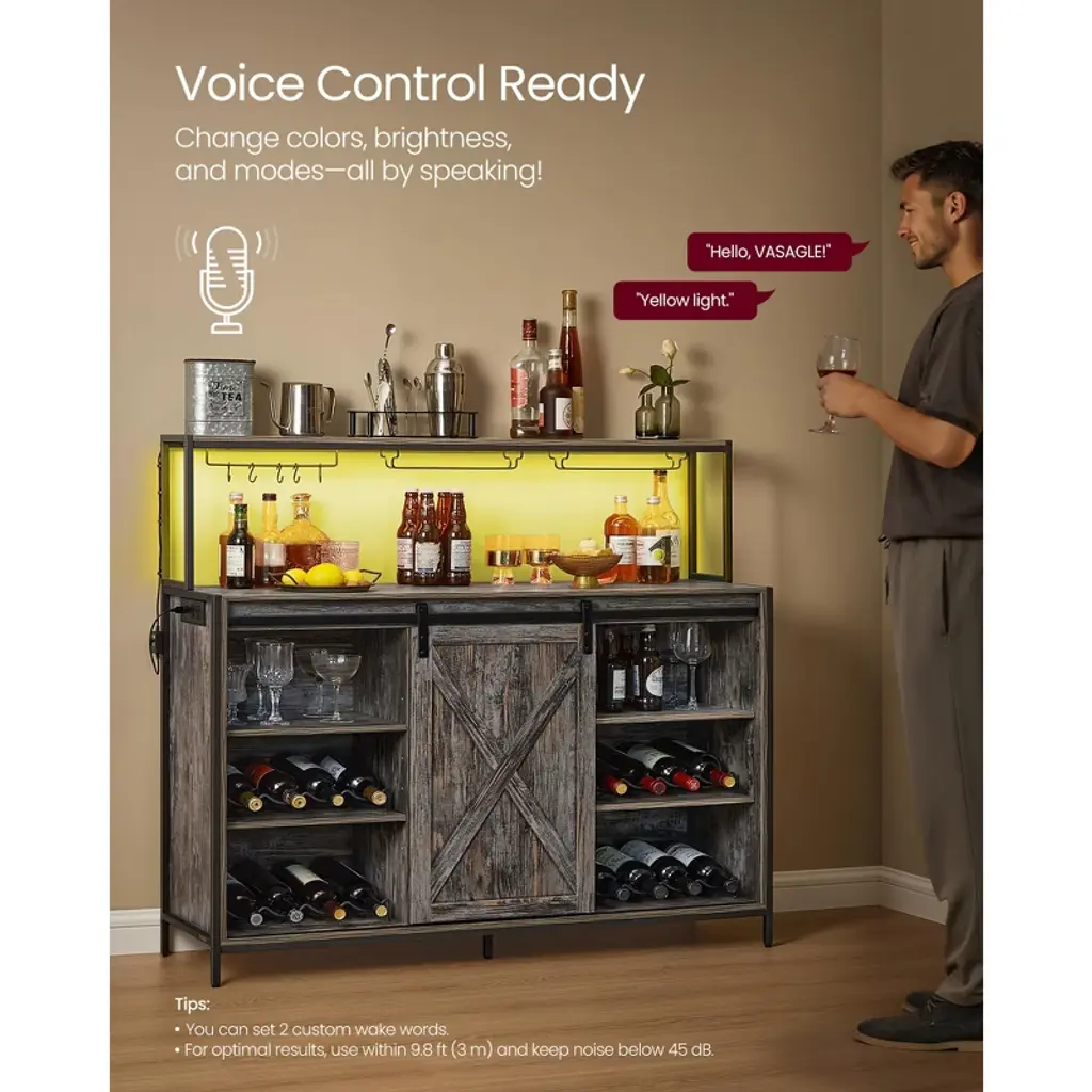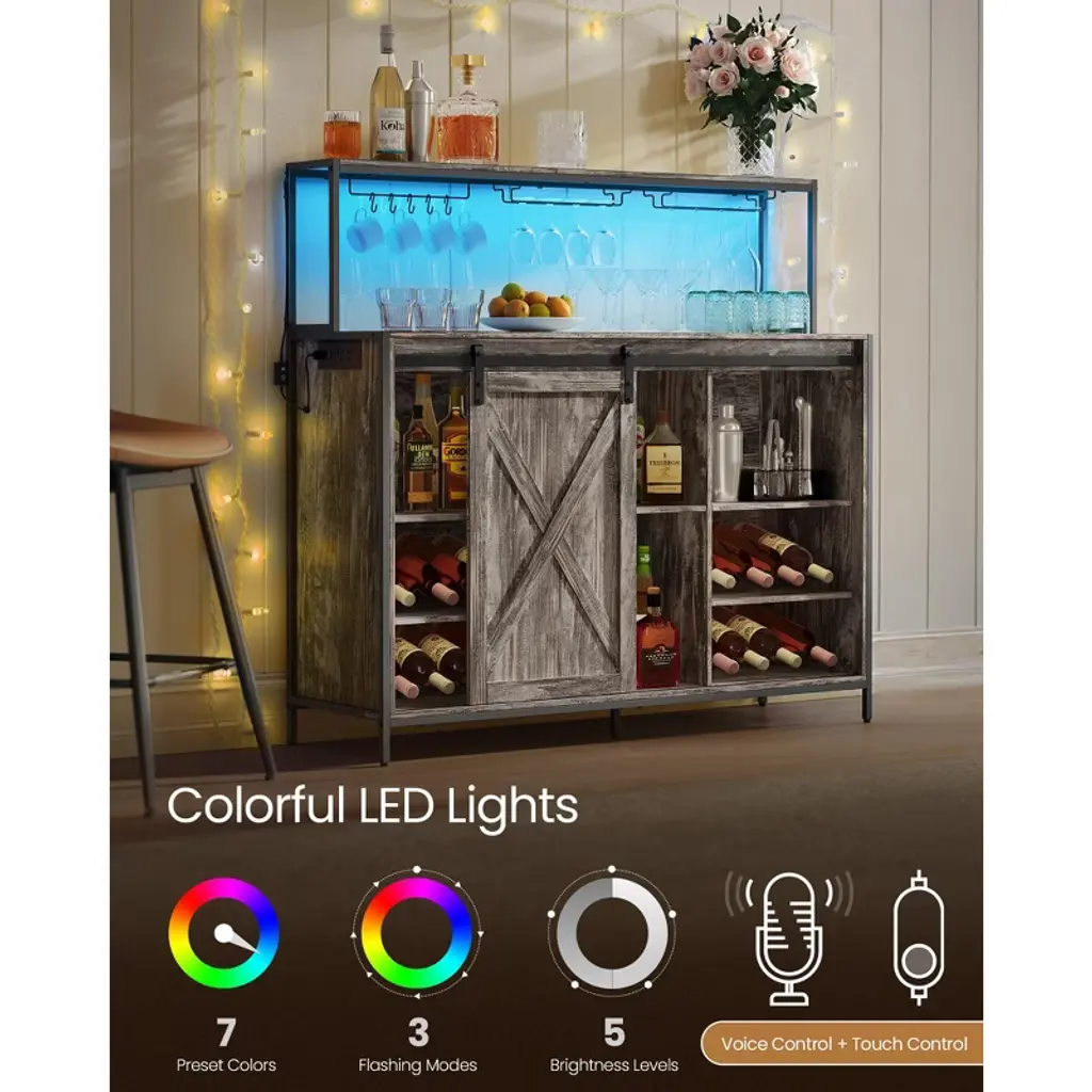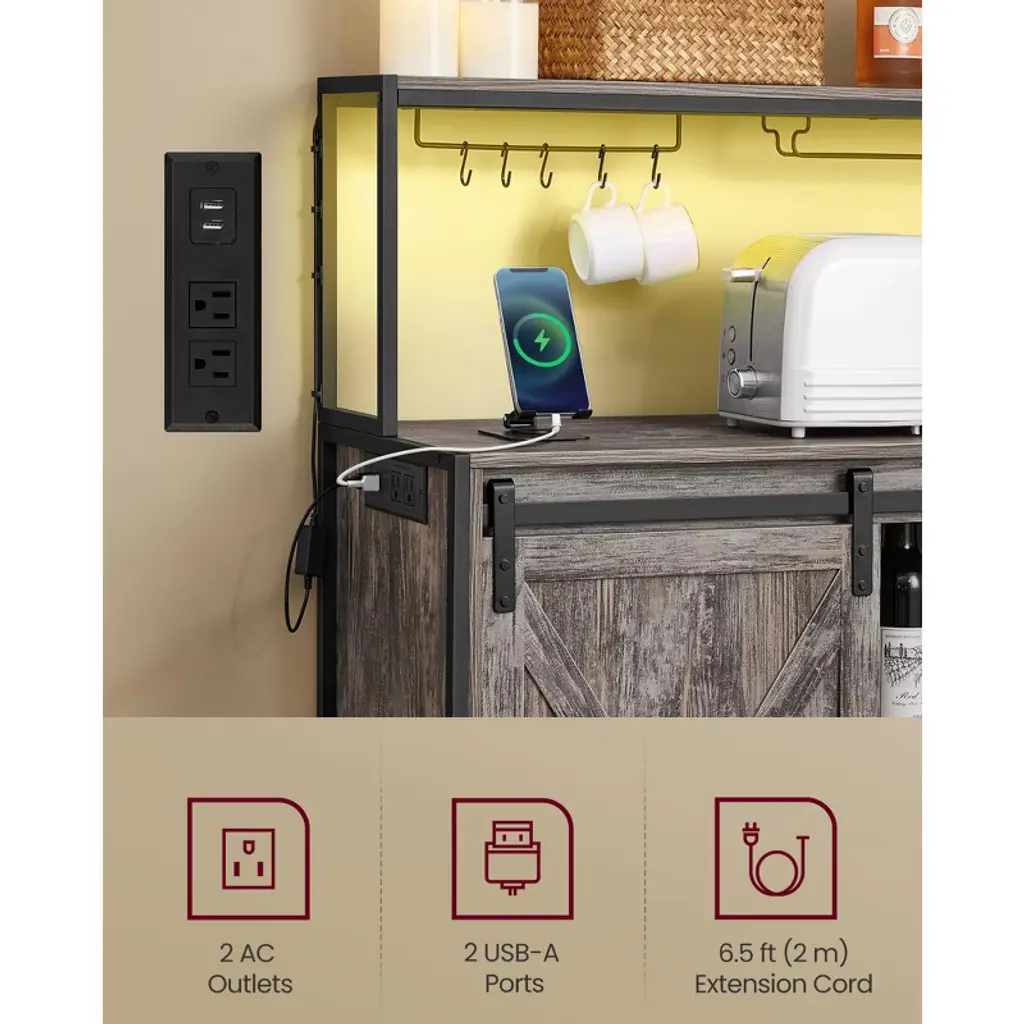 Coffee Bar Cabinet With Smart Led Light, Sliding Barn Doors, S Hooks, Wine Storage, Maple Gray