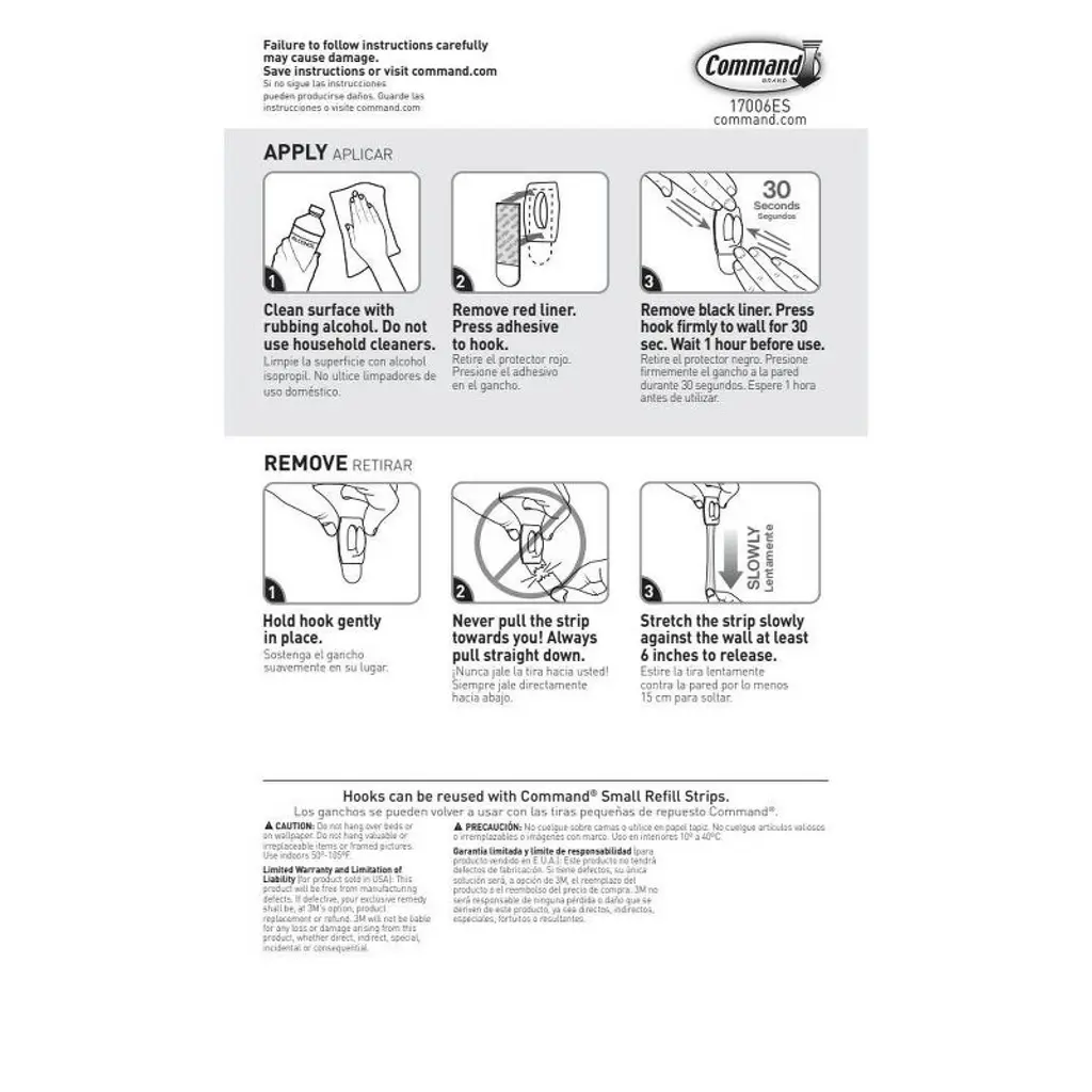 Command™ Hooks are available in a wide range of designs to match your individual style and decor. They also come in a variety of sizes and hold a surprising amount of weight up to seven and a half pounds! Forget about nails, screws and tacks, Command™ Hooks are fast and easy to hang! Using Command™ Adhesive, stick to many surfaces, including paint, wood, tile and more. Yet, they also come off leaving no holes, marks, sticky residue or damage. Rehanging them is as easy as applying a Command™ Refill Strip, so you can take down, move and reuse them again and again!