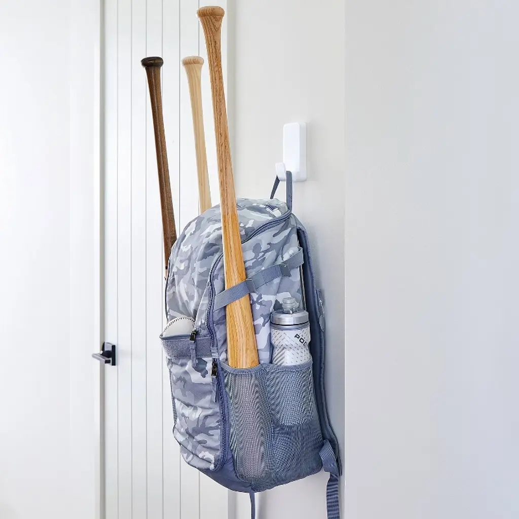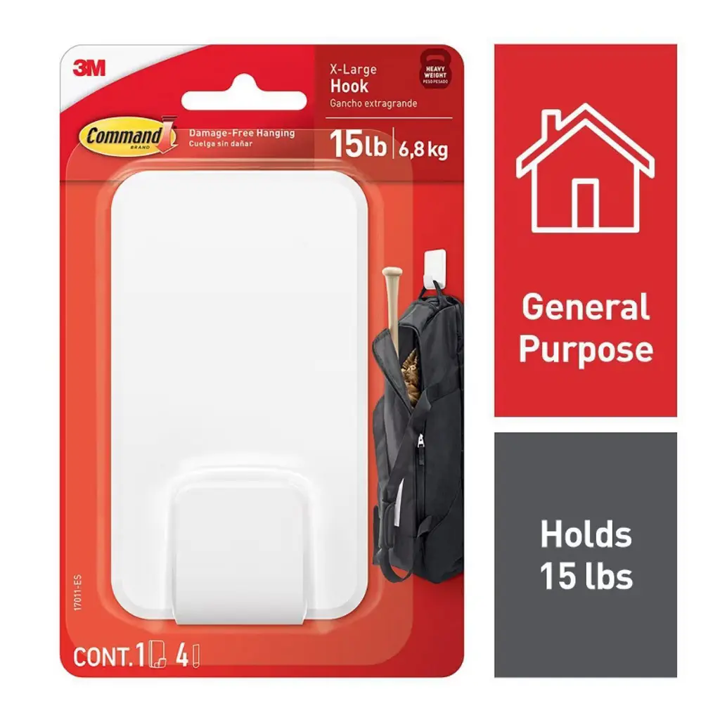 Command 15 Lb White XL Heavyweight Wall Hook lets you decorate and organize how you want, when you want, without damaging your walls and surfaces. A great home improvement item, this nail free wall hanger hook sticks on a variety of smooth surfaces without leaving holes, marks or sticky residue. Use this hanging hook to hang heavy duty backpacks, ironing boards, stepladders, clipboards, brushes, dog leashes, kitchen utensils, and accessories that weigh up to 15 lbs. Simply mount this no tools self adhesive hook on painted walls, painted concrete cinder blocks and concrete surfaces and enjoy the damage free hanging of your favorite decorations and organizers. Perfect for home renovators and college students, use this 3M Hook in your home, office, apartment or dorm room to elevate the appearance of your living or working space without tools. Directions are included; follow the directions closely to use the wall hook as intended. Prior to mounting, clean the surface with rubbing alcohol to allow the wall hanger to maintain a strong bond with the surface. Lightly hold the top of the heavy duty Command Hook and slowly pull it straight down towards the floor to remove and prevent surface damage. A clever decorating and organizing solution that doesn’t damage surfaces, this extra large wall hook will help you fearlessly change your space. One package contains two white wall hooks and eight large Command Strips. Each single wall hook can hold up to 15 pounds. Decorate, organize and celebrate damage-free with Command.