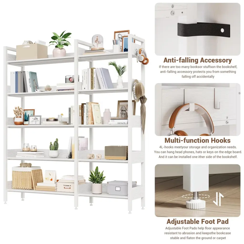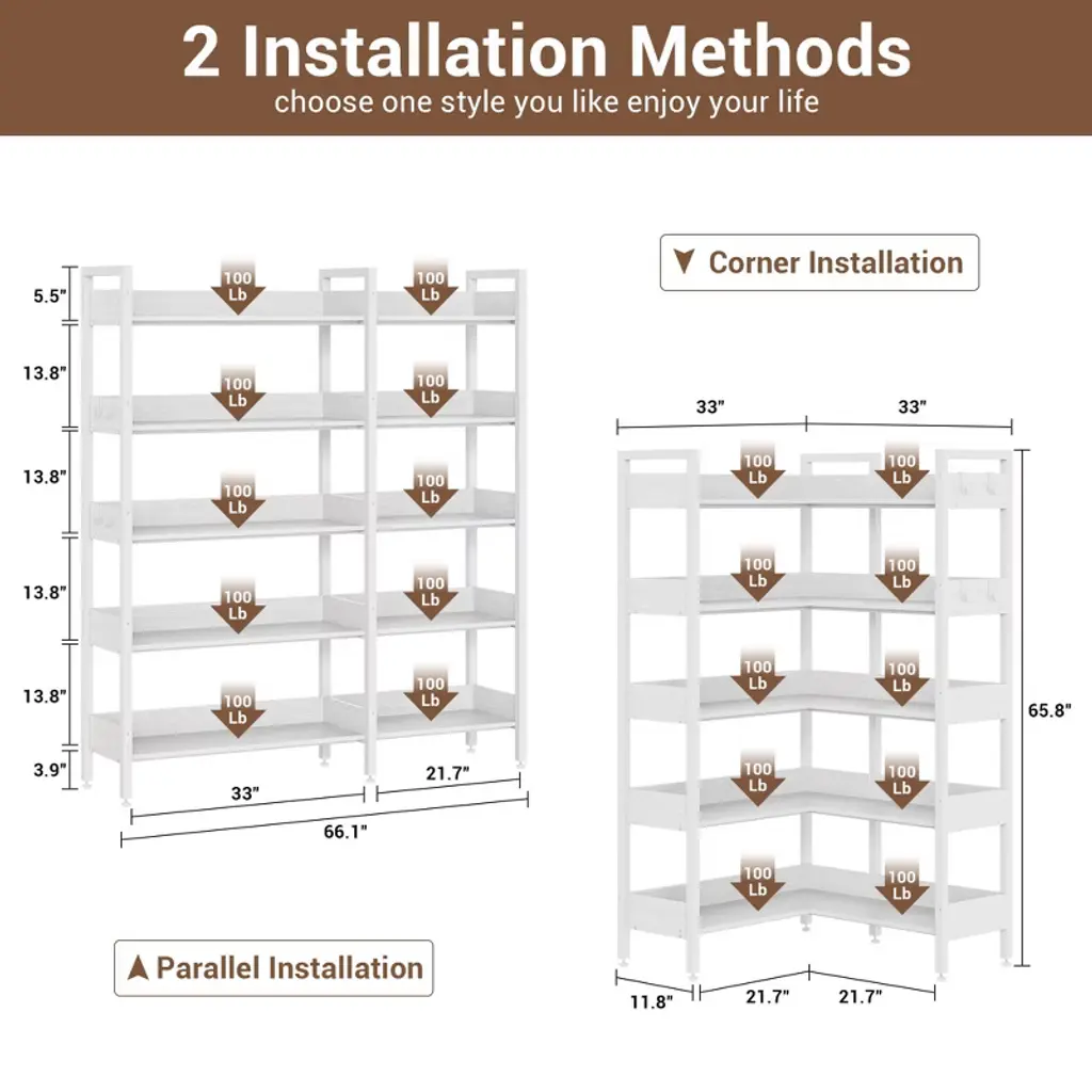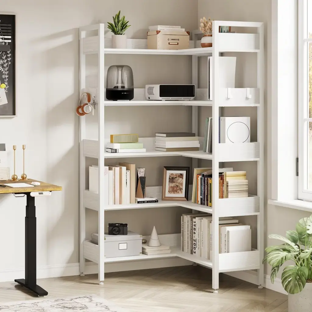 Corner Bookshelf, 5-tier Bookshelves With 4 Hooks, Convertible Bookshelf With Open Shelves And Metal Frame For Living Room, Bedroom, Home Office