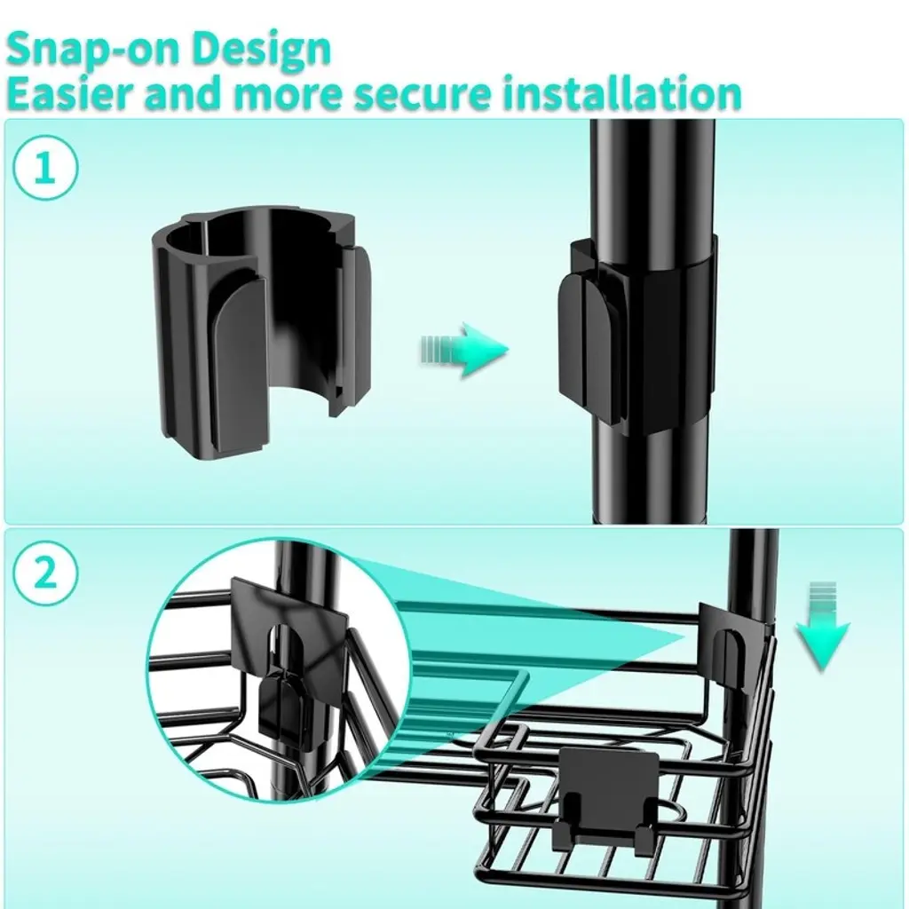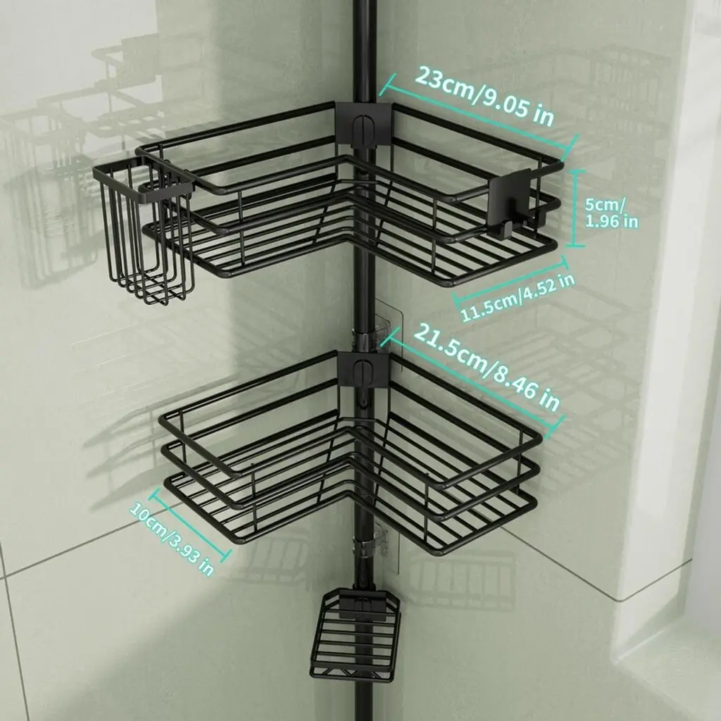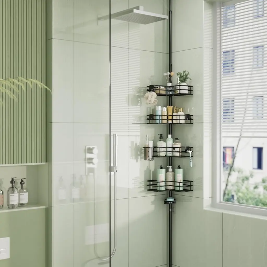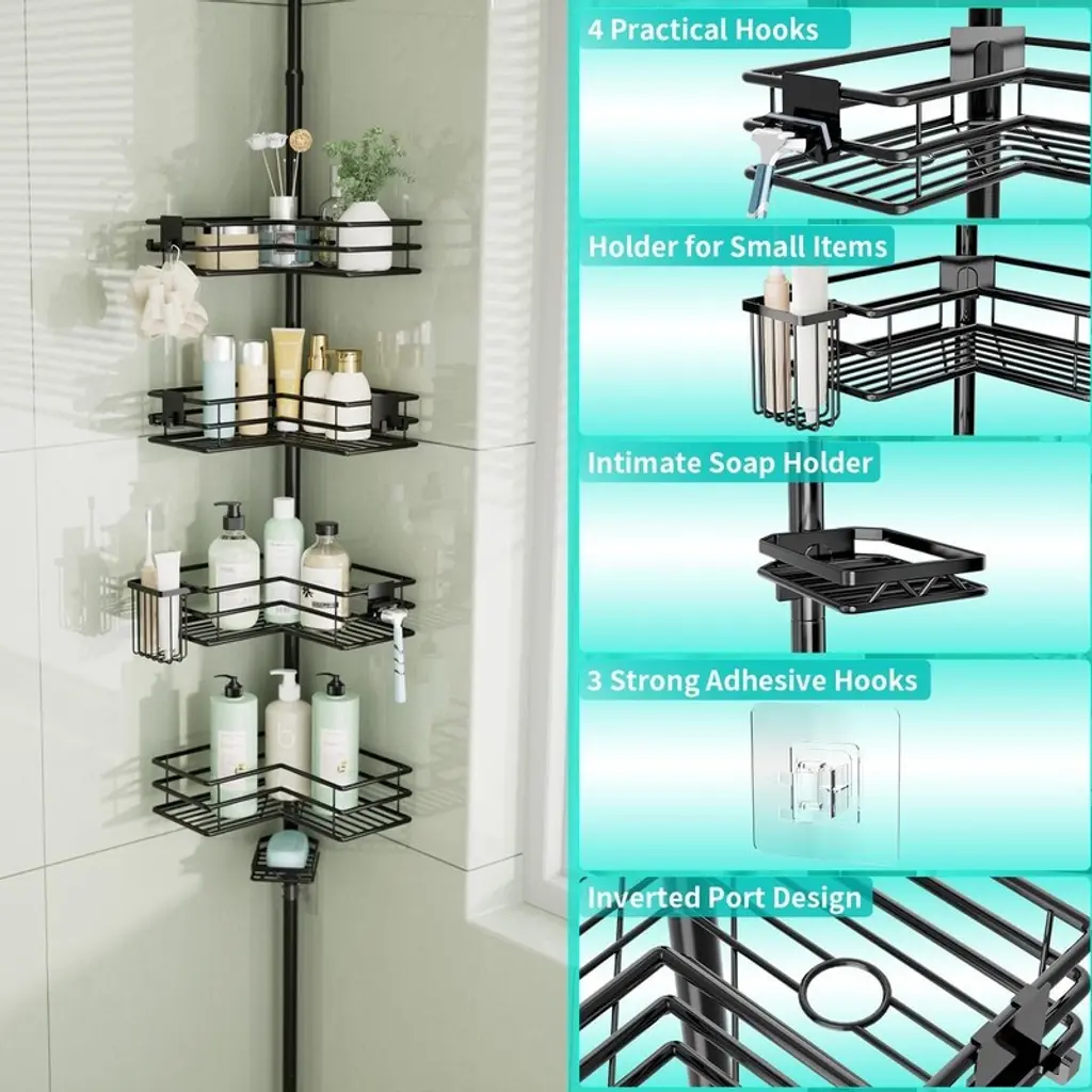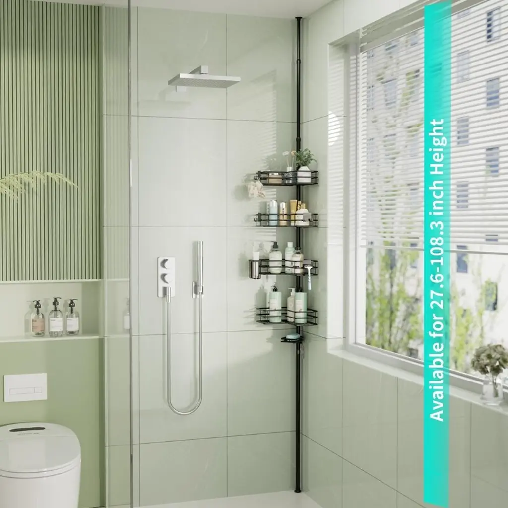 This corner shower caddy fits neatly into bathroom corners. Its 4 - tier shelf design provides ample space to store all your toiletries in one convenient location.The shower caddy’s snap - on design enables quick and effortless installation, ensuring the corner shelf remains sturdy. It also allows for convenient height adjustment between shelves.The tension pole of the shower caddy features a unique spring design, adjustable to fit spaces ranging from 27.6 to 108.3 inches, allowing you to customize its length as needed.Constructed from 304 stainless steel, the corner shower caddy is waterproof and rustproof, ensuring long - term use without rusting, even in continuously wet conditions.The hollow design of the corner shower shelf promotes rapid water drainage from the rack and toiletries, maintaining a clean and fresh bathroom environment.The shower shelf for inside shower comes with non - slip end caps, providing stability while preventing damage to bathroom floors and ceilings. Three adhesive hooks are also included to further enhance stability.This shower storage includes 4 hooks and 1 toothbrush holder, offering storage for towels, bathrobes, razors, and other bathing accessories, enhancing your overall shower experience.