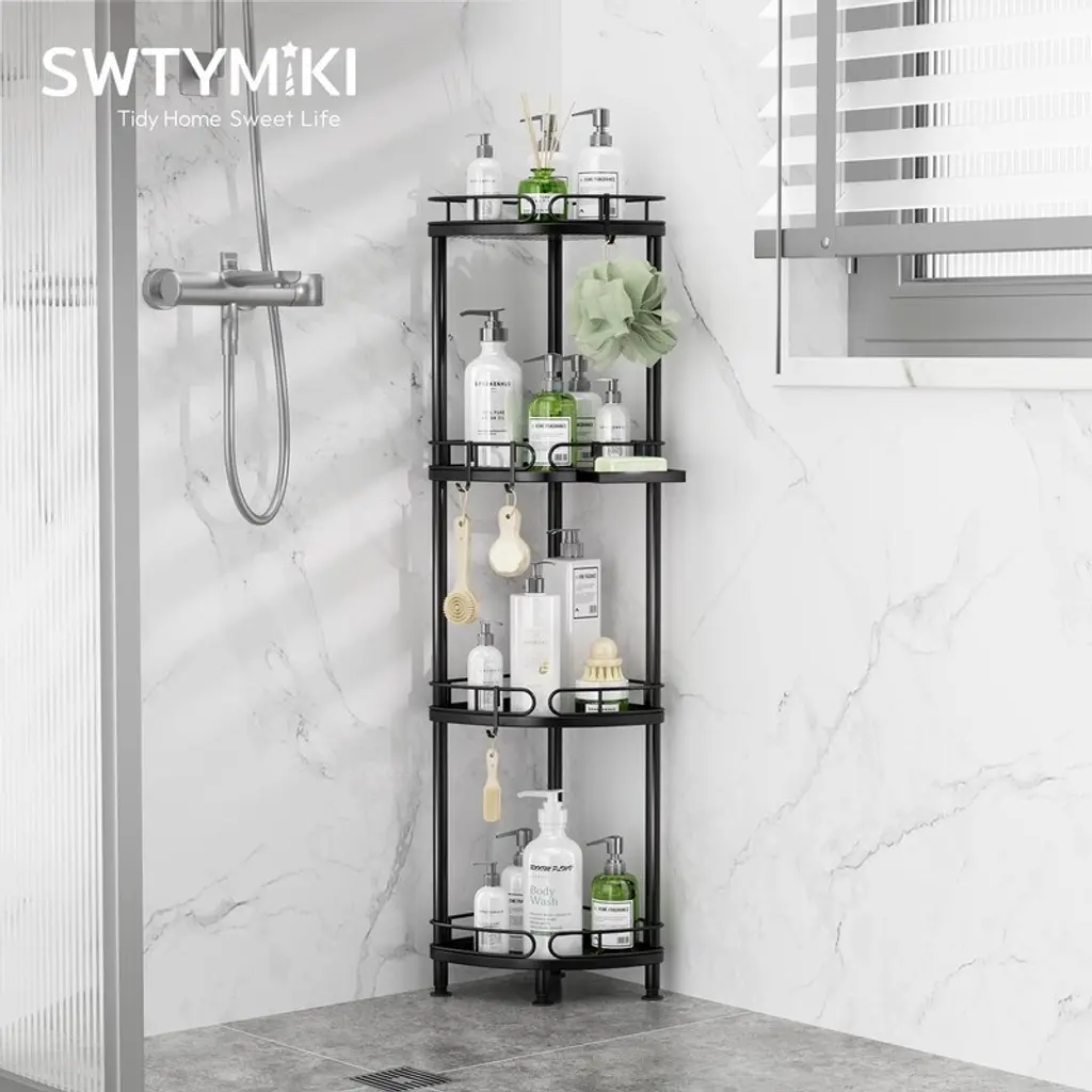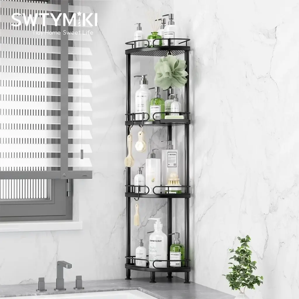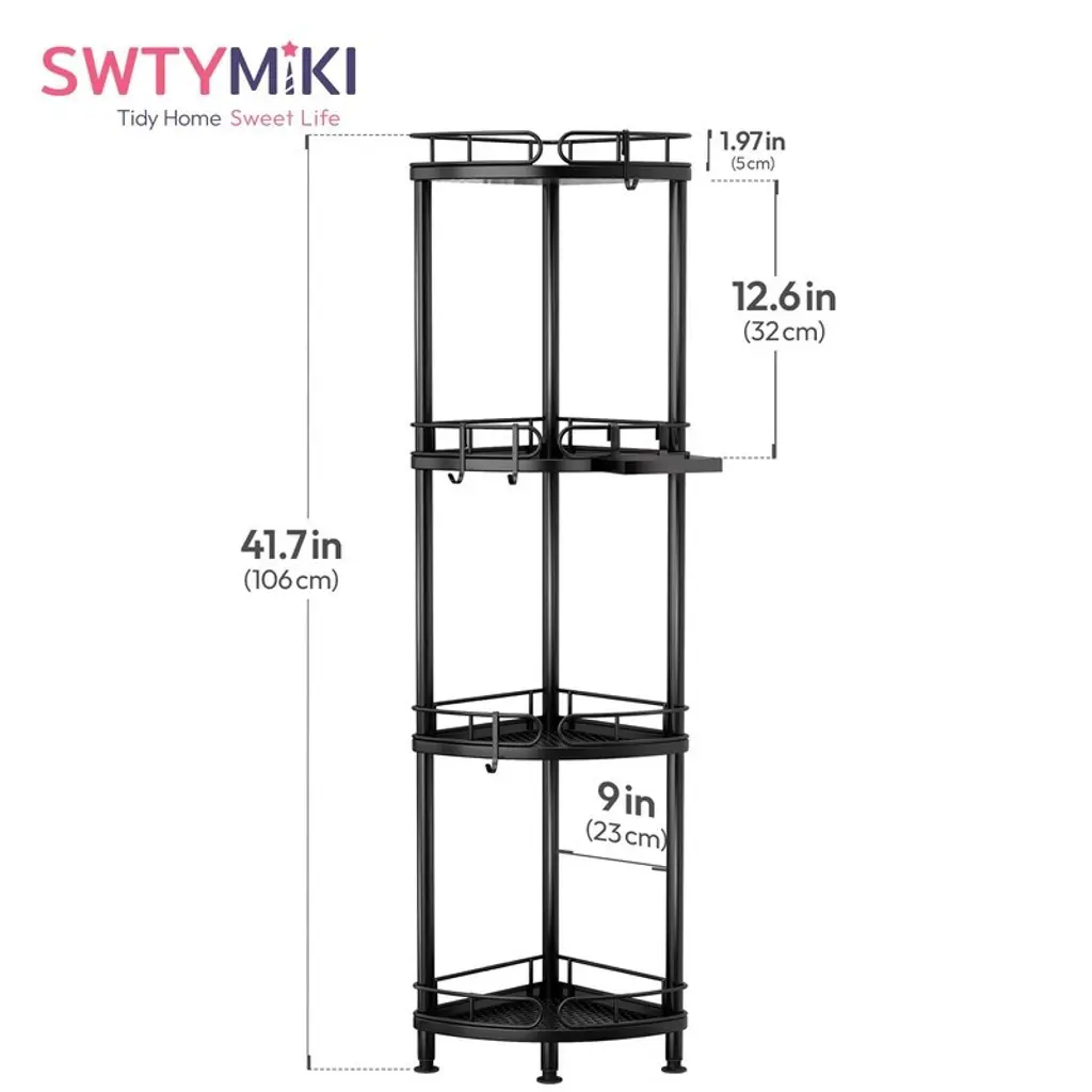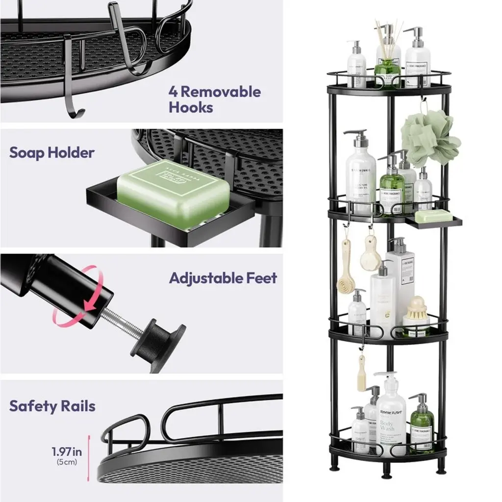 Corner Shower Caddy Standing Stainless Steel Shower Organizer Stand With 4 Hooks & Soap Holder - Black4-Tier - 9"d X 9"w X 41.7"h