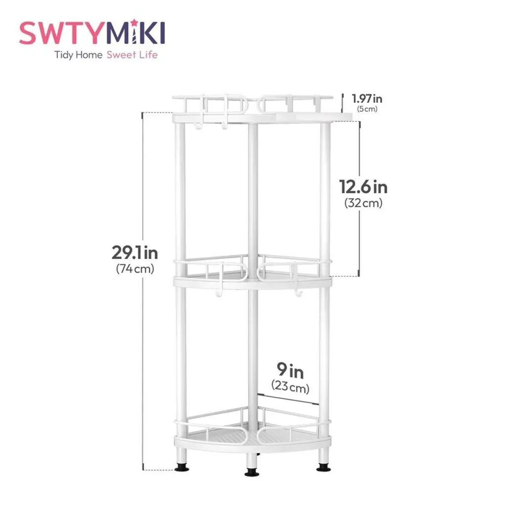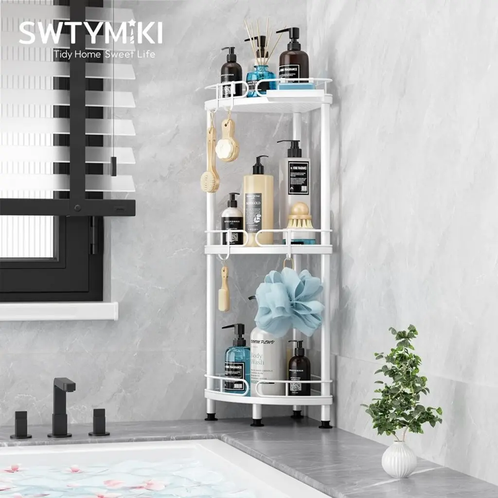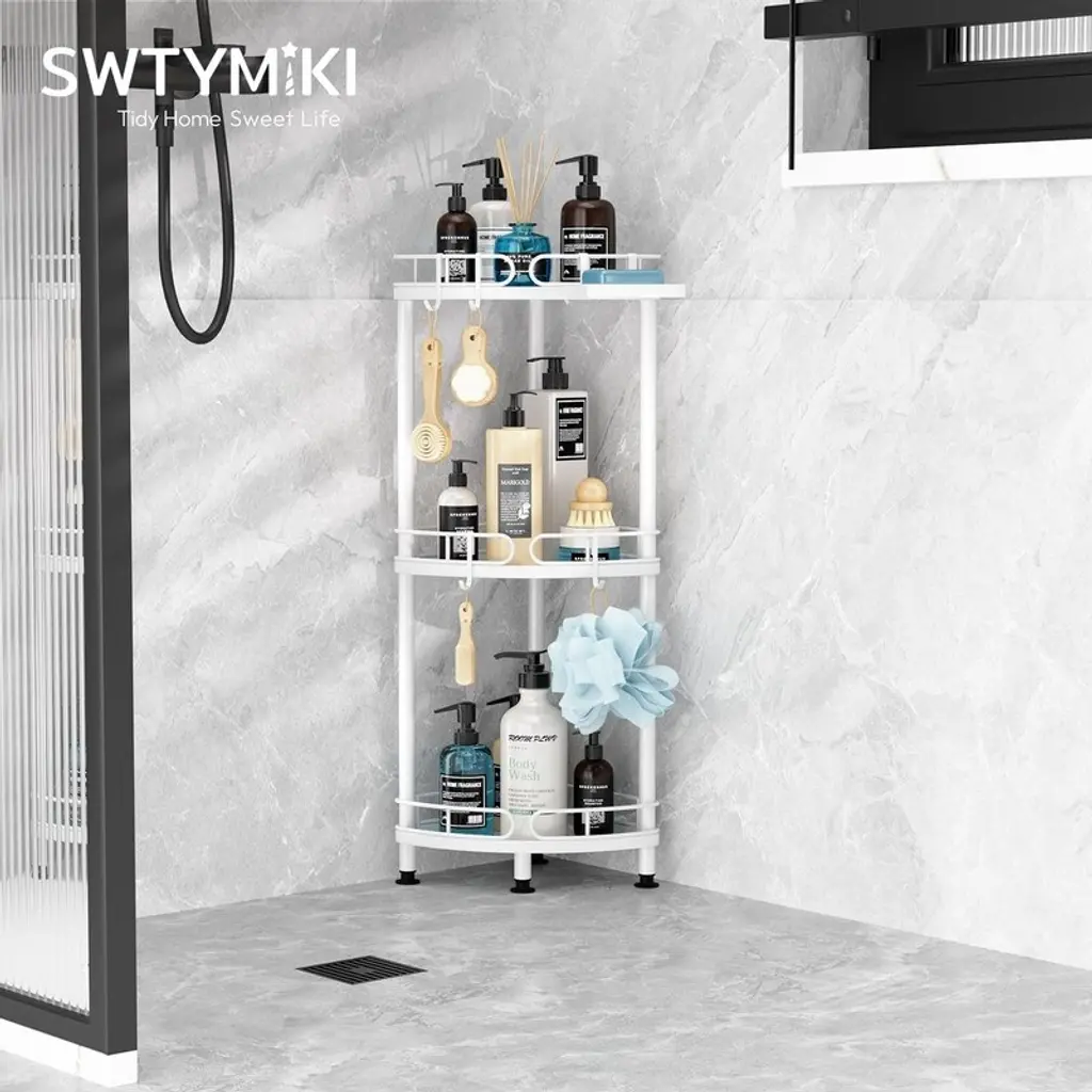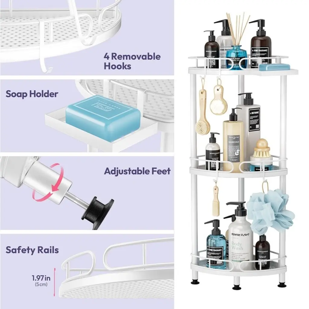 Constructed from high-grade stainless steel with precision polishing, this shower caddy boasts a lustrous, rust-resistant finish that withstands humid bathroom conditions. The sturdy metal framework provides reliable support for all your shower essentials while maintaining its sleek appearance over time. Beyond functionality, this corner caddy enhances your bathroom's aesthetic with its elegant, modern design. The thoughtful construction prevents items from slipping off while adding a touch of sophistication to your shower space. Assembly requires no tools and takes just minutes, with an intuitive design that adapts to any bathroom configuration. The freestanding unit can be easily positioned wherever needed for optimal convenience. Featuring a practical fan-shaped layout, the caddy offers generous 12.6-inch (32cm) tall shelves that accommodate family-sized shampoo bottles and multiple shower products. The tiered design keeps everything visible and within easy reach during showers. Versatility shines with four additional hooks and a dedicated soap holder, providing specialized storage for items of all sizes. From large conditioner bottles to razors and loofahs, every shower essential has its place. Four adjustable feet with rubberized bases ensure perfect stability on uneven surfaces while protecting your bathroom flooring. The non-slip design prevents shifting during use and safeguards against scratches or water damage. As the ultimate space-saving solution, this vertical organizer maximizes corner space while holding tall bottles upright. Its family-friendly capacity and smart organization transform cluttered showers into streamlined, spa-like retreats.