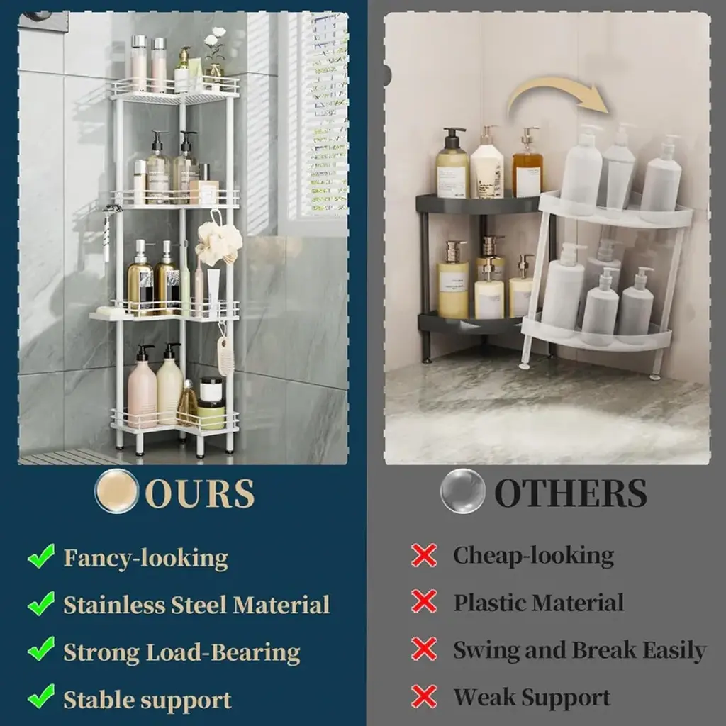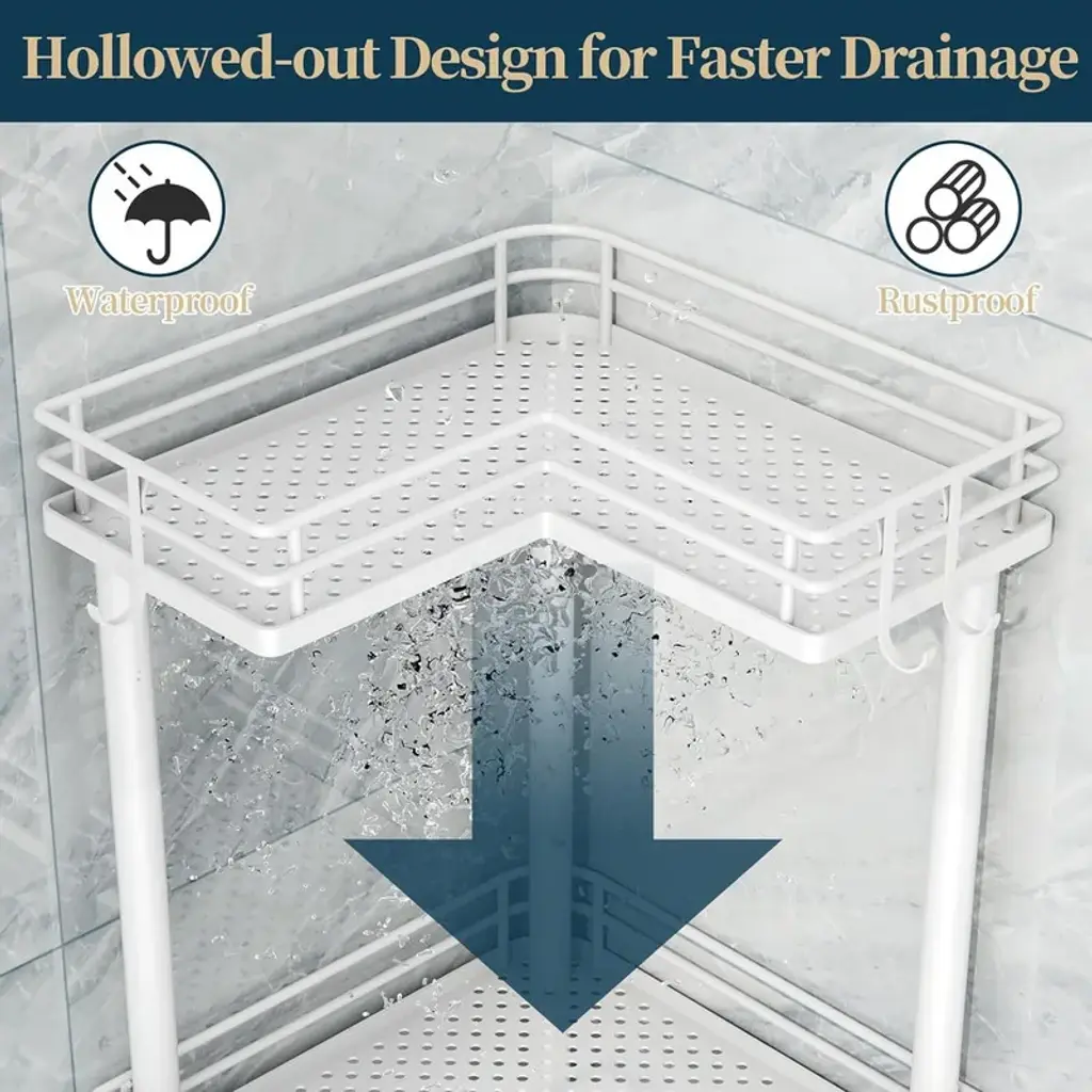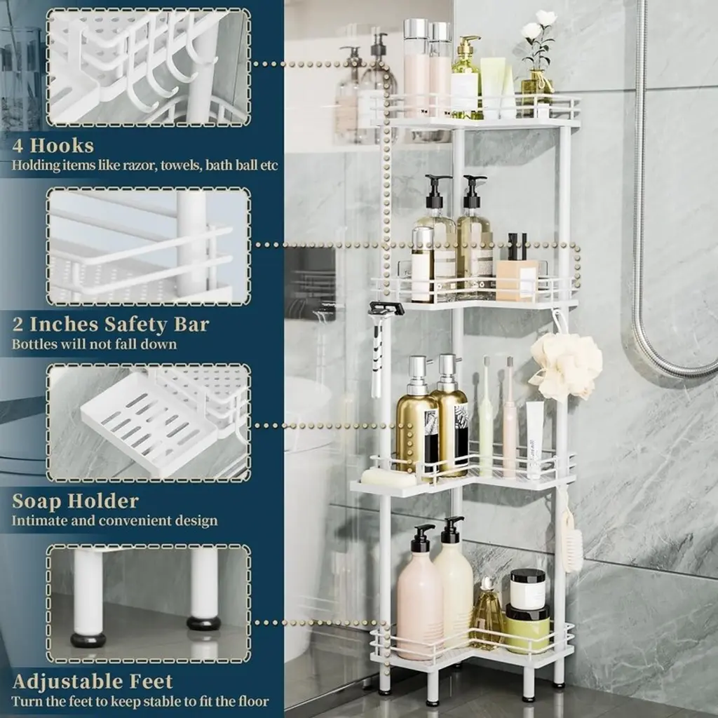 Smart All-in-One Organization:This corner shower caddy combines 4 rust-proof hooks, a dedicated soap tray, to neatly store all shower essentials while keeping them within arm's reach.Premium 304 Stainless Steel:Constructed with commercial-grade stainless steel that resists rust, corrosion, and water damage - ensuring long-lasting performance in wet bathroom environments.Self-Draining Hygienic Design:Features strategically placed drainage holes across all shelves to prevent water accumulation, keeping toiletries dry and minimizing mildew buildup.Secure & Adjustable Stability:Includes 2" protective side rails to prevent slips and 4 adjustable leveling feet that adapt to uneven shower floors for wobble-free use.Tool-Free 3-Minute Setup:Assembles instantly without tools using our intuitive snap-together design - includes clear illustrated instructions for hassle-free installation.
