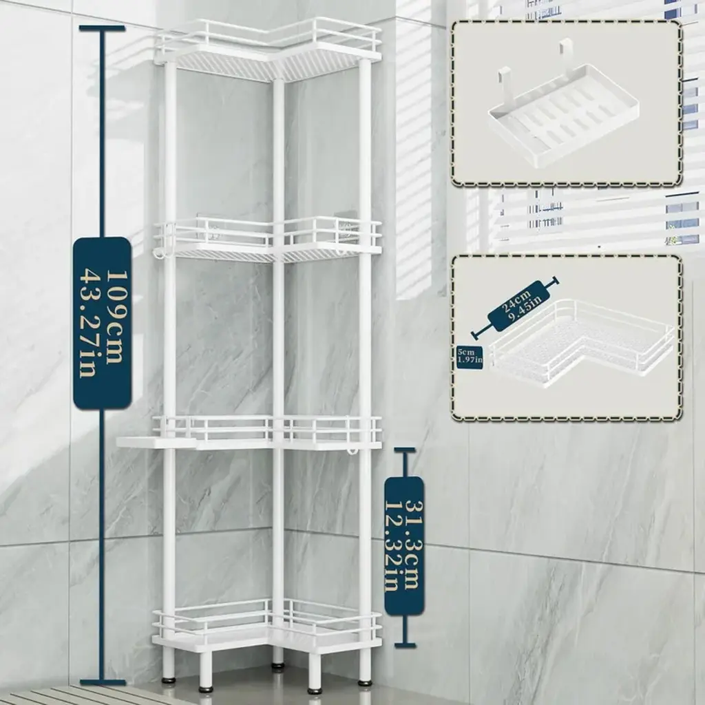 Corner Shower Caddy Standing - Stainless Steel Shower Organizer With Soap Holder And 4 Hooks - 4 Tier White