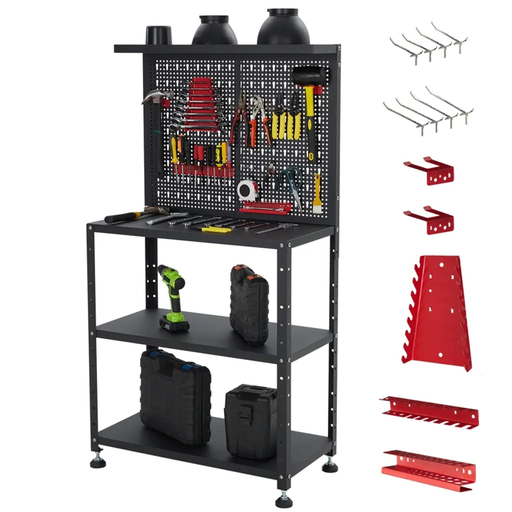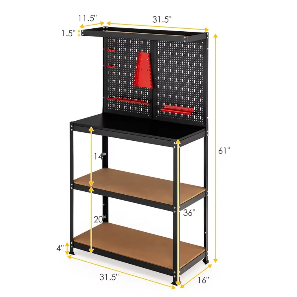 Our tool storage workbench is a perfect choice for your work. It is supported by heavy-duty steel frame, which is also rust resistant, ensuring long service life. The high functionality and nice appearance make it ideal for garage, workshop, office, yard, etc. The height of the tabletop is perfectly suitable and comfortable for work. Ample storage space not only keeps your place tidy, but also reduces time for finding tools. And the workbench also comes with complete hanging accessories to satisfy your different demands. Last but not least, we provide you with clear instructions and necessary hardware to ensure easier assembly.FeaturesAmple and classified storage space for different items Come with 2 pegboards and 14 hanging accessories Reinforced steel frame for high stability Plastic sprayed surface avoids rust Non-slip footpads protect the floor from scratches Easy to assemble with the clear instruction Ideal for tool room, garage, workshop and so onColor: Black Material: Steel, MDF, PB Overall Dimension: 31.5'' x 16'' x 61''(L x W x H) Dimension of Tops Shelf: 31.5'' x 11.5'' (L x W) Weight Capacity of Tabletop: 220 lbs Weight Capacity of Top Shelf: 44 lbs Weight Capacity of Each Lower Shelf: 132 lbs Net Weight: 44 lbs Package Includes: 1 x Workbench with Pegboard 1 x Drill Bit Storage Rack 1 x Wrench Set Rack 3 x Tool Holders 1 x Long Rack 4 x Short Pegboard Hooks 4 x Long Pegboard Hooks 1 x Instruction