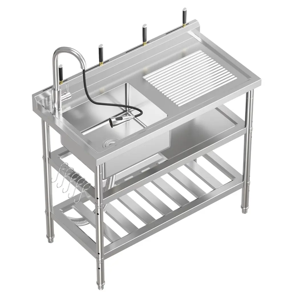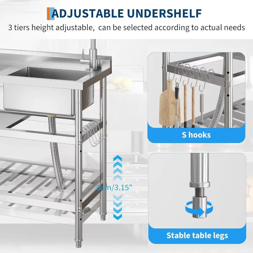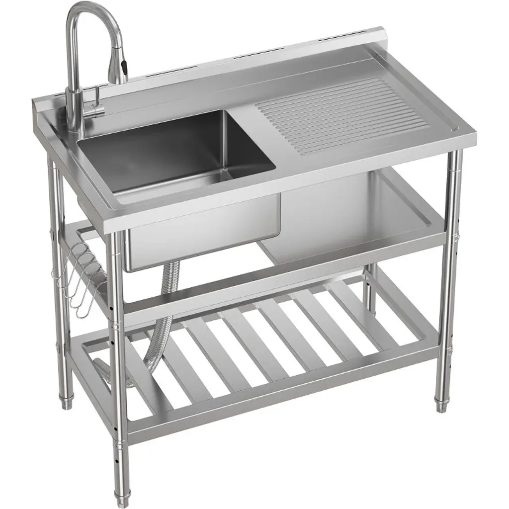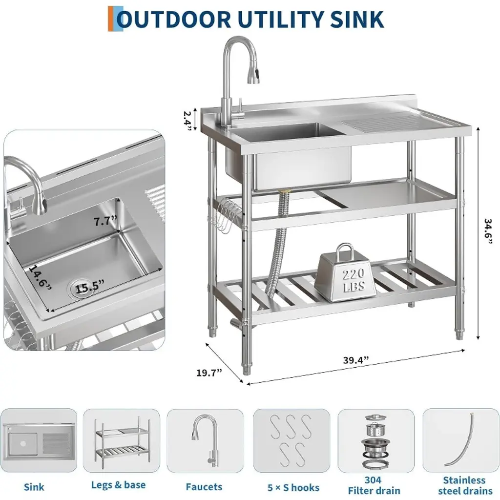 Coucheta Freestanding Single Bowl Utility Sink, 39.4"x19.7"x34.6" Stainless Steel W/ Pull-out Faucet, S-hooks, Shelf, Adjustable Legs