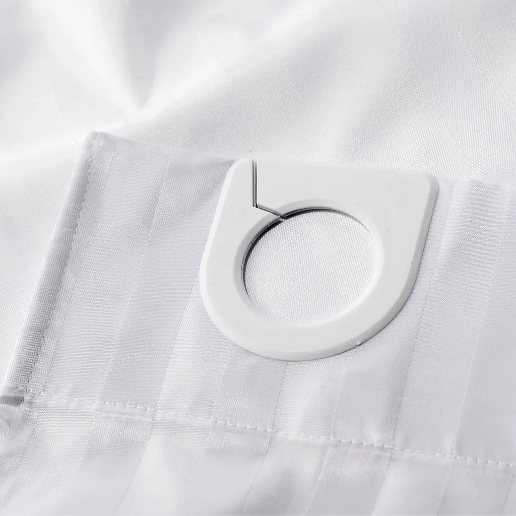 Our bright white striped 'hookless' shower curtain combines the convenience of built-in eyelets with a weighted 'cling-resistant' hem. The integral Hook N Hang eyelets are machine washable and easy to attach to or remove from a shower rod. No more time spent finding hooks that fit or replacing those that tear away from the curtain. Super easy to maintain, the weighted hem and water repellent fabric stops the curtain from clinging when showering. An instant, no hassle refresh to your bathroom.Features: