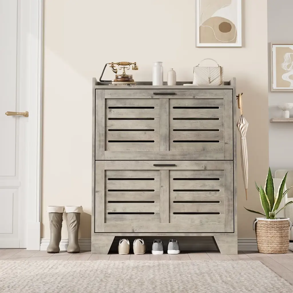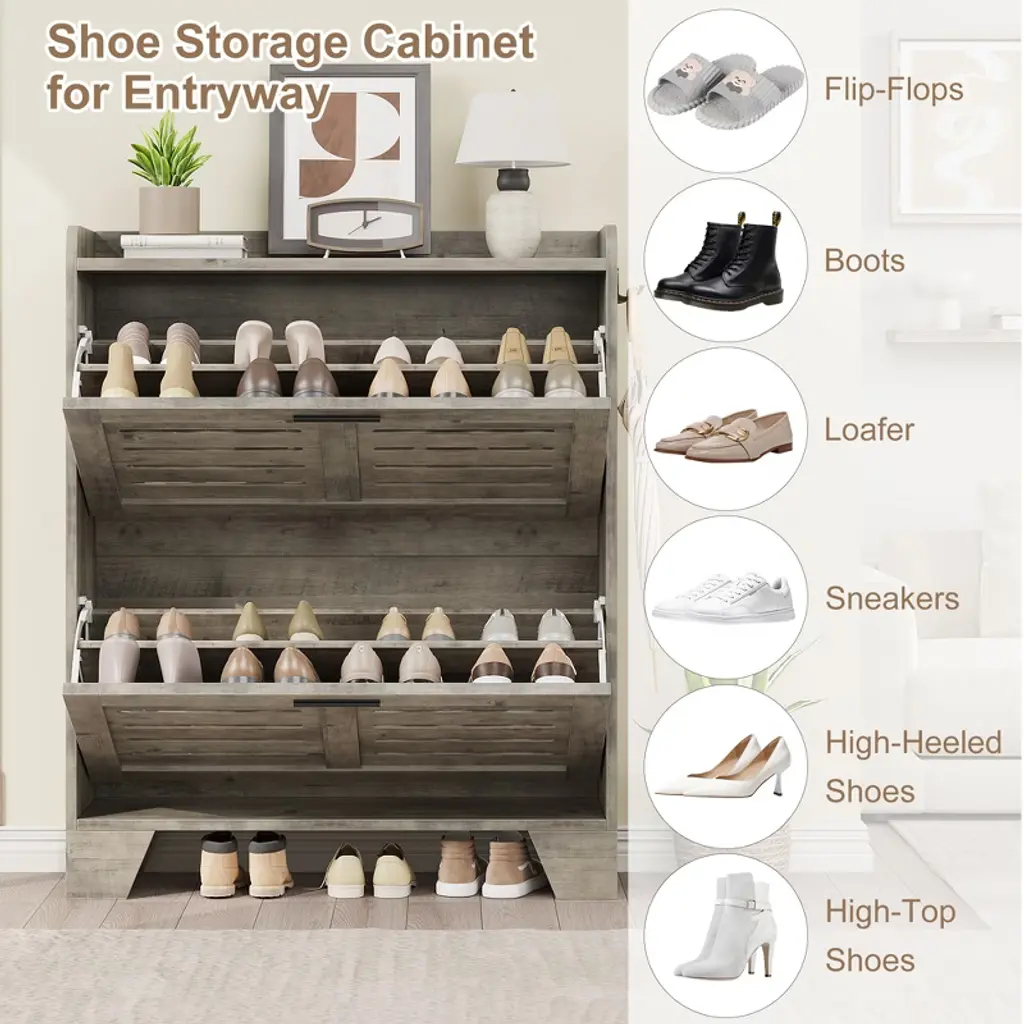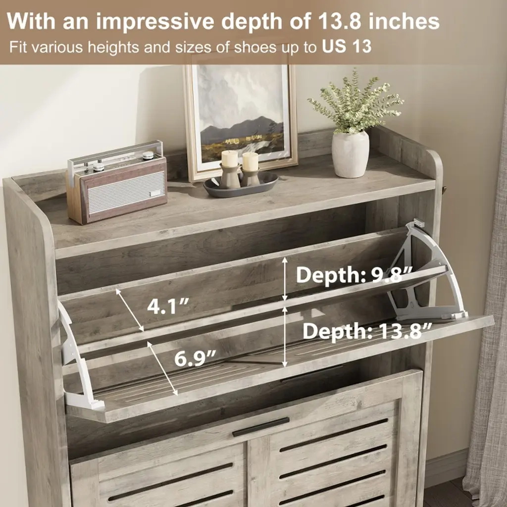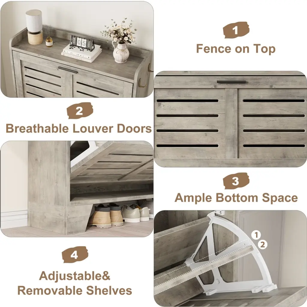 Product DescriptionCuisinSmart versatile flip-top drawer shoe cabinet showcases a minimalist design that fits seamlessly into any space.Perfect for your entryway, hallway, living room, or porch, it keeps your home looking neat and tidy while maximizing space.Product Feature【Adjustable or Removable Partition】With adjustable and removable shelves, you can easily customize the storage space to fit an array of shoe styles, from flats and mid boots to elegant heels, accommodating sizes up to US 13.【Elevated Base】Not only facilitates the storage of slippers but also makes cleaning effortlessly simple, marrying practicality with style beautifully.【Louvered Door Design】Seamlessly combines functionality with stunning aesthetics, promoting optimal airflow to keep your shoes fresh and free from odors.【Storage Hooks】You can choose to install it or not for hanging keys and small items to ensure everything is within reachProduct informationBrand: CuisinSmartColor: Brown, GrayProduct Dimensions: 9.4"D x 31.4"W x 38.2"HItem Weight: 70 PoundsSpecial Feature: Adjustable ShelfAssembly Required: YesPackage List1 x shoe cabinet1 x assembly guide1 x tools bag