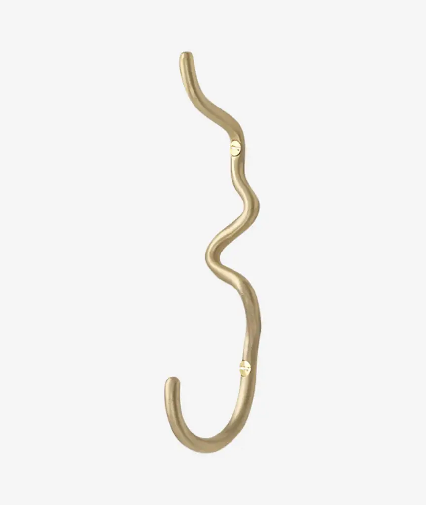 The Curvature family is a series of organically shaped hooks and hangers that have been hand formed in solid brass with a matte finish. The whimsical curves juxtapose the solidity of the material, and make a playful, functional addition to any bedroom, bathroom, hallway or kitchen. This generously sized Double Hook provides you with twice the hanging space. Crafted by hand, no two hooks are identical.