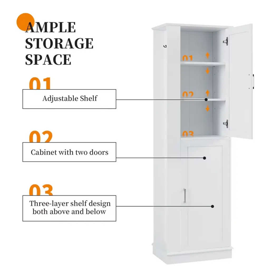 Ample Storage There are two closed storage spaces above and below, with a total of six layers, providing you with a variety of storage space Adjustable Shelves There are two adjustable shelves on the top and bottom of the cabinet, which can be adjusted to three different heights according to your needs, suitable for storing bathroom supplies of different heights. Side Hook Design The two metal hooks on the side provide space for hanging in your bathroom. You can choose to hang mops or towels, etc.