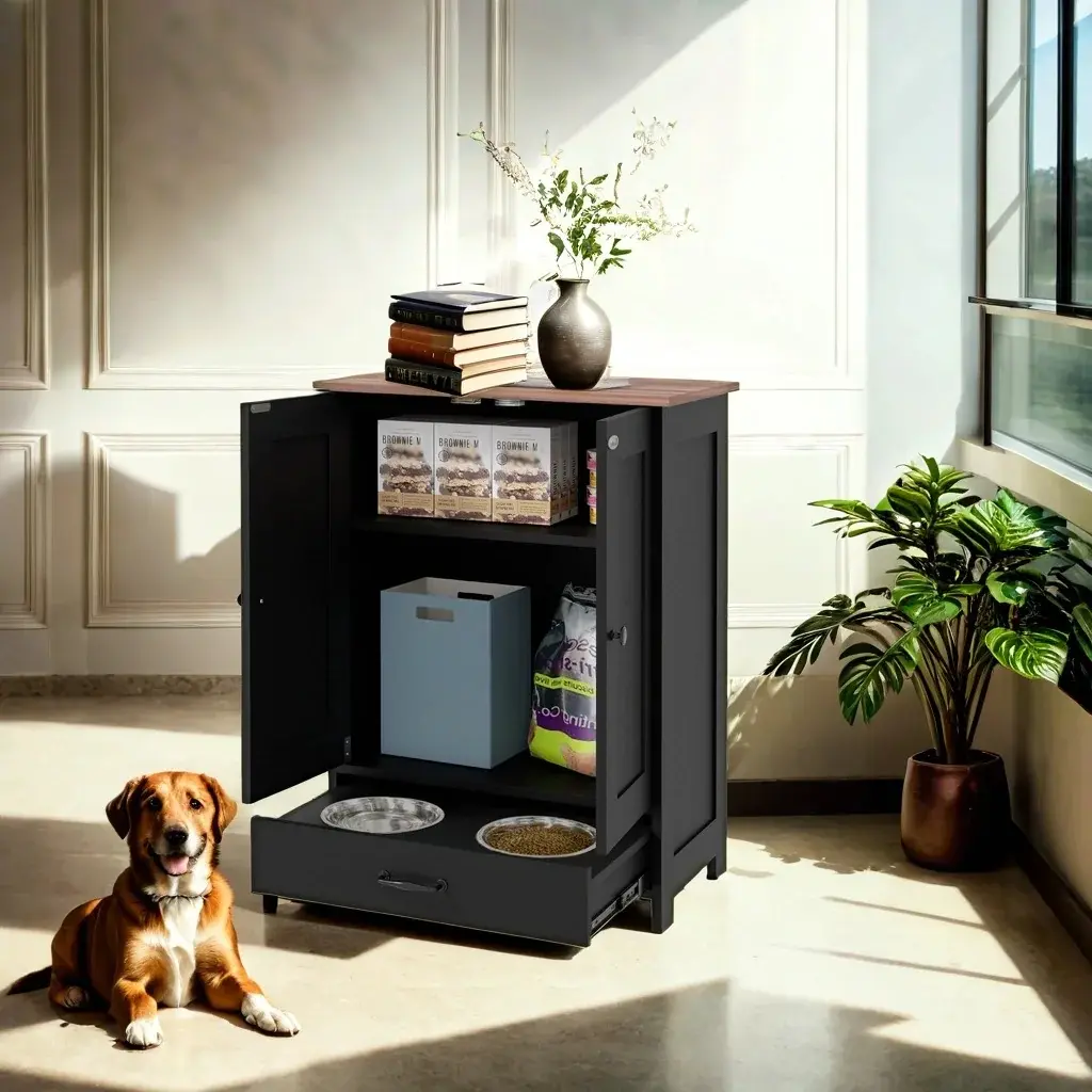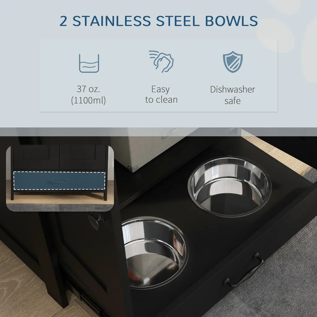 Dog Feeding Station Furniture With Storage Cabinet And Hooks - Large - Black