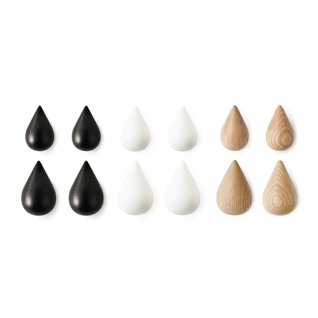 Dropit hooks are wooden, drop-shaped wall hooks designed for Normann Copenhagen by Asshoff & Brogård. With a strong visual expression and exquisite finish, Dropit is a joyful piece of art for your wall. Hang a single drop on the wall or create a pattern using several hooks – Dropit is perfect in any room. Dropit is available in two different sizes and one box includes two hooks.