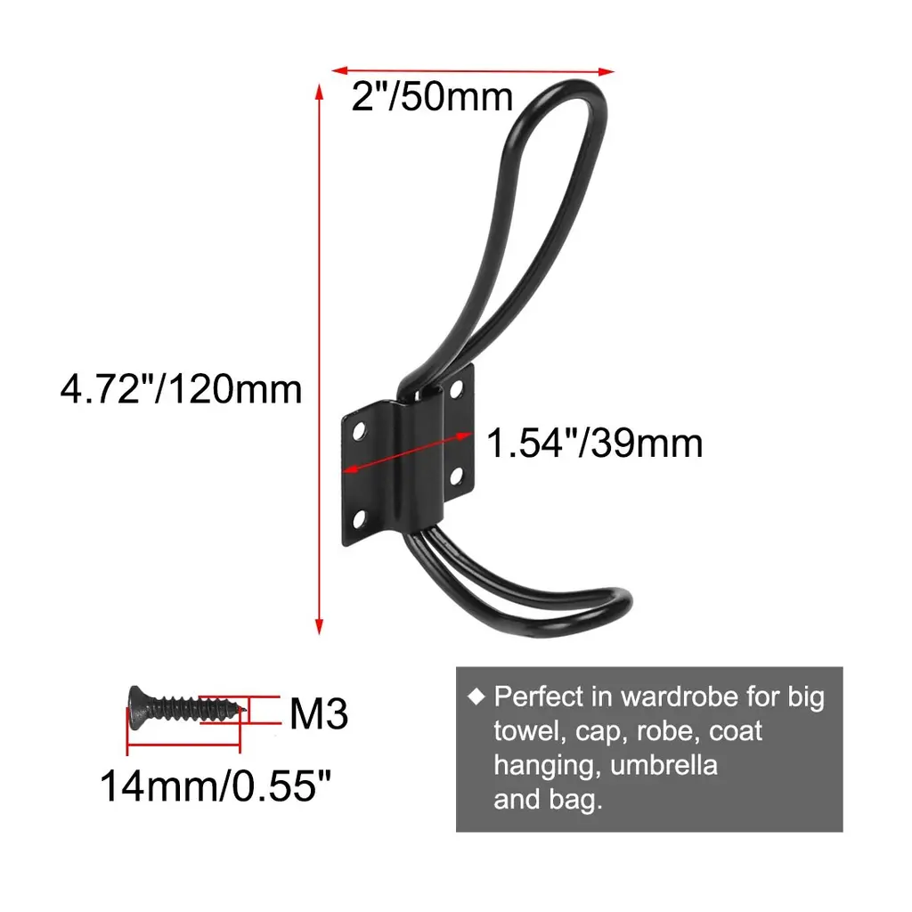 Features:1.High Quality: The wall-mount hooks were made of high-quality iron materials; rust-resistant and durable, can serve for a longer time.2.Simple Looking & Stylish: Simple and stylish towel hook, unique design appearance is great for additional decoration in your home. Make your home have a sense of design and fashion.3.Well Loading Capacity: The robe hooks can provide a good loading capacity, more durable; Fixed with holes, it becomes solid and powerful and don't worry the carrying falling off.4.Easy Installation: The package includes mounting screws, easy and convenient mounting of this practical coat hook to the wall.5.Easy to Clean: These wall hooks are easy to clean, just wipe it slightly; Can be applied in your bathroom, balcony, bedroom, kitchen, hotel and so on.6.Wide Application: Suitable for holding a wide variety of items, like coats, hats, handbags, umbrellas, towels or robes; A good helper for home storage and organization. Available Quantity: 1pcs, 2pcs, 4pcs, 5pcsAvailable Color: Black, Copper Tone Specifications:Product Name: Robe HookMaterial: IronTotal Size: 120 x 39 x 50mm/4.72" x 1.54" x 2"(L*W*H)Top Hook Extends: 50mm/2"Bottom Hook Extends: 65mm/2.56"Hook Distance: 82mm/3.23"Mounting Hole Dia: 4mm/0.16"Mounting Hole Center Diatance: 21mm/0.83", 28mm/1.1"Screw Size: M3 x 14mm/M3 x 0.55"(D*L)Package Included: 1/2/4/5 x Robe Hooks, 4/8/16/20 x Screws Notes:1. Variability of 1-2mm is possible due to the measurement process.2. Due to the shooting and screen setting difference, the color of the item may be slightly different from the pictures.