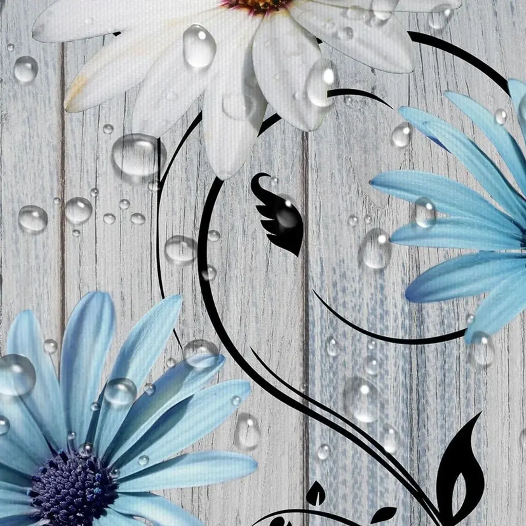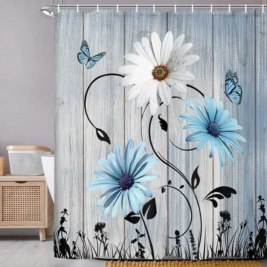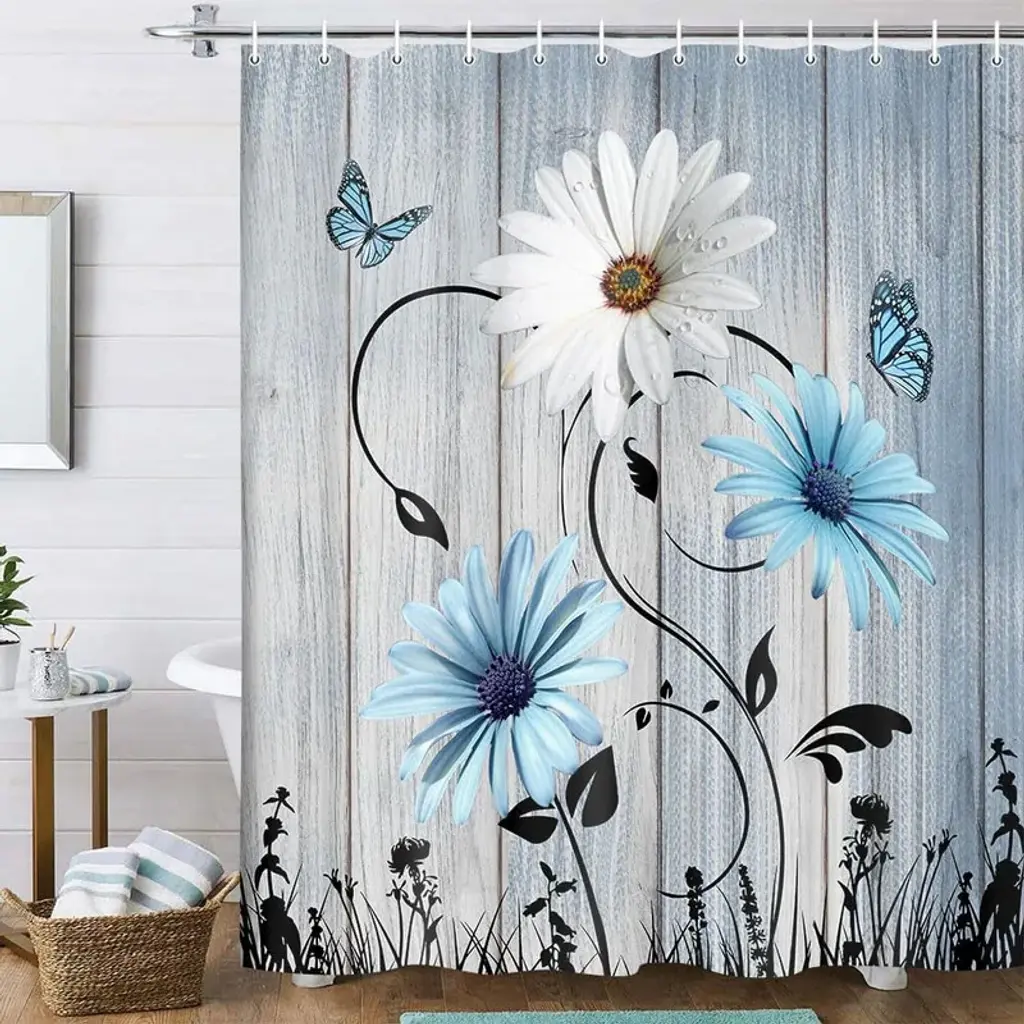 Farm Daisy Floral Butterfly Old Plank Rustic Shower Curtain Accessory Set With Hooks - 47"w X 64"l (Pack Of 1)/blue