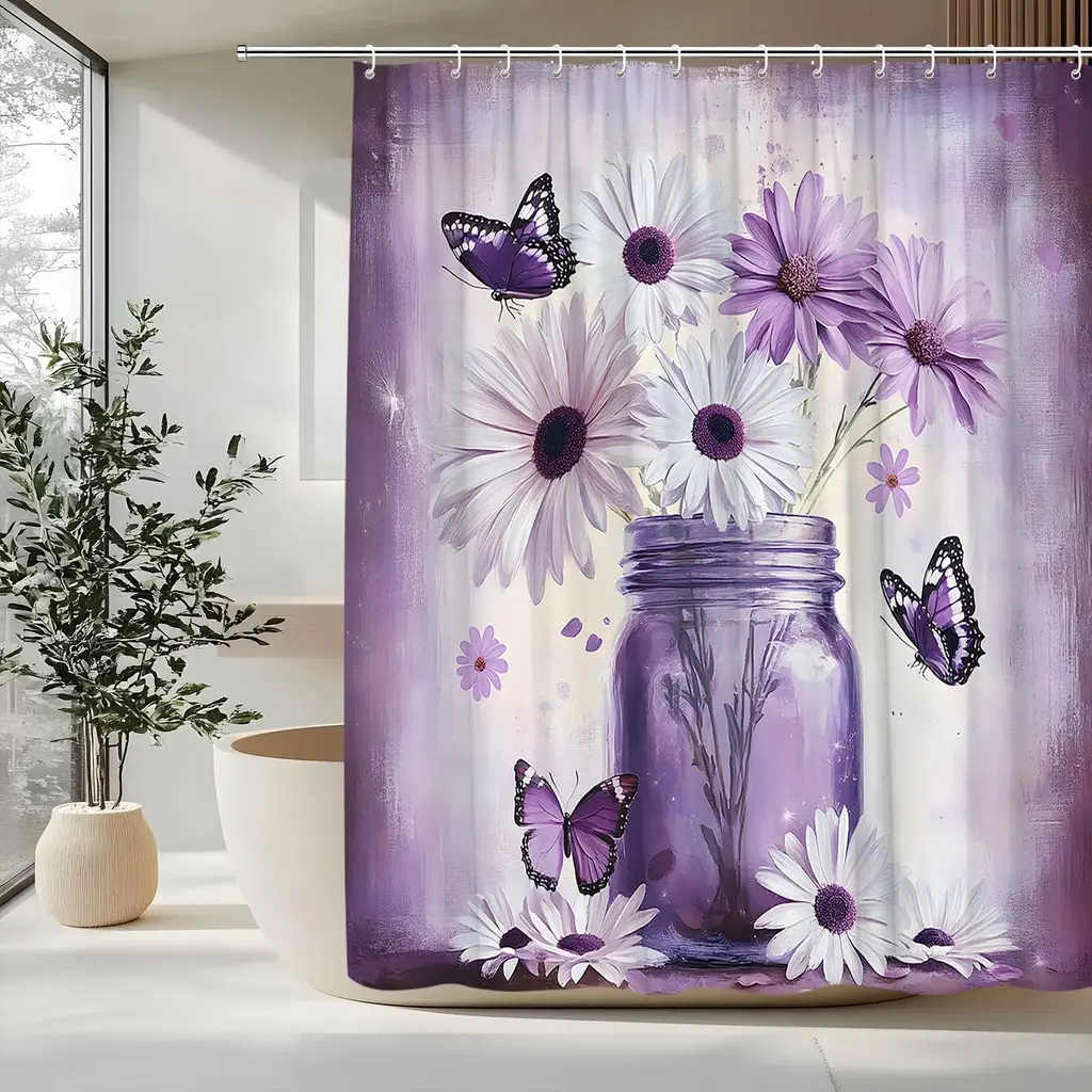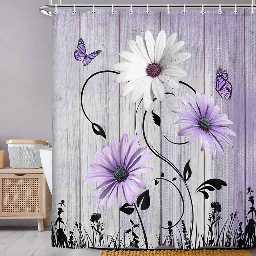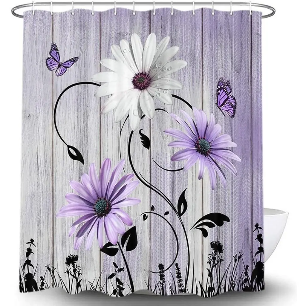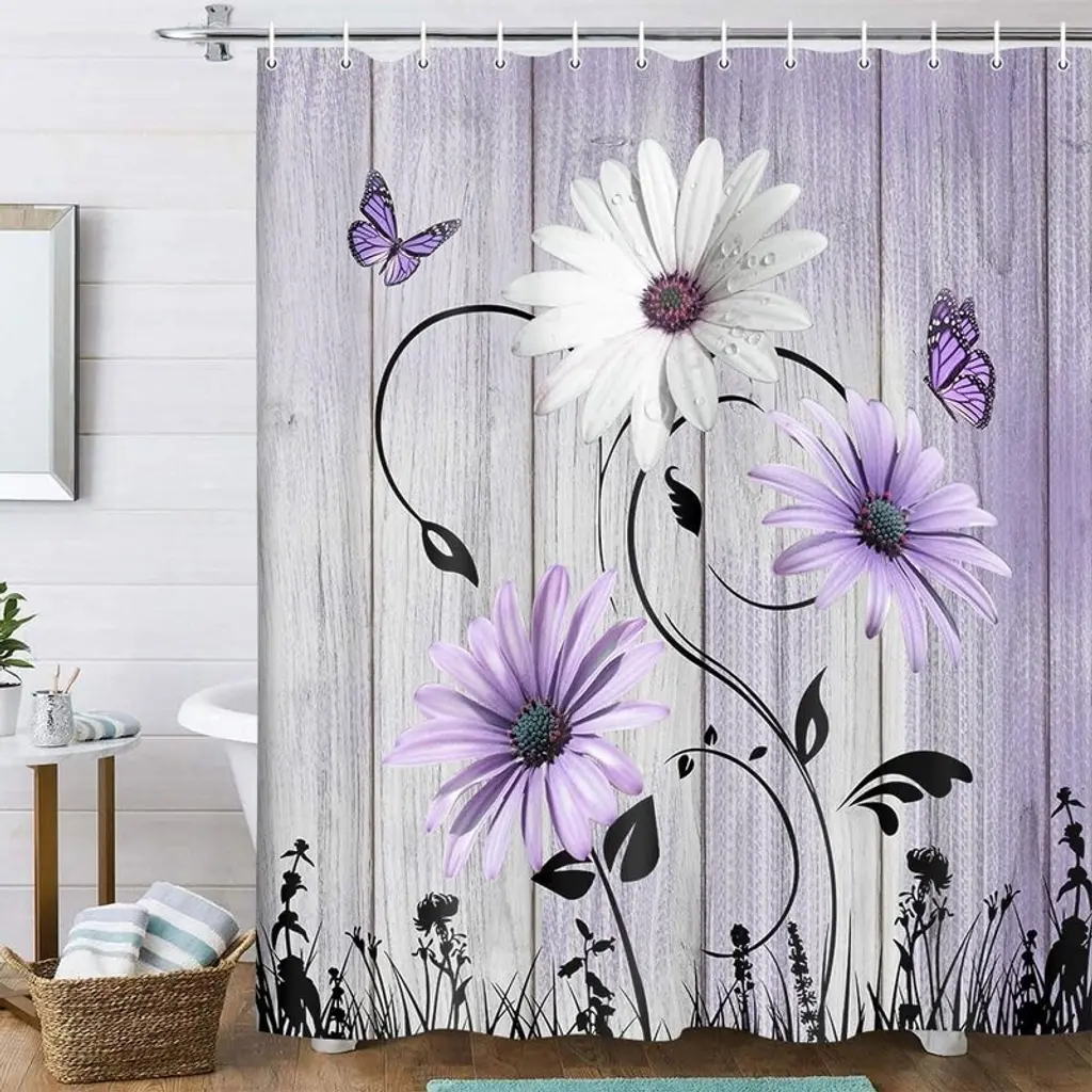 Farm Daisy Floral Butterfly Old Plank Rustic Shower Curtain Accessory Set With Hooks, 69 X 70 - Purple