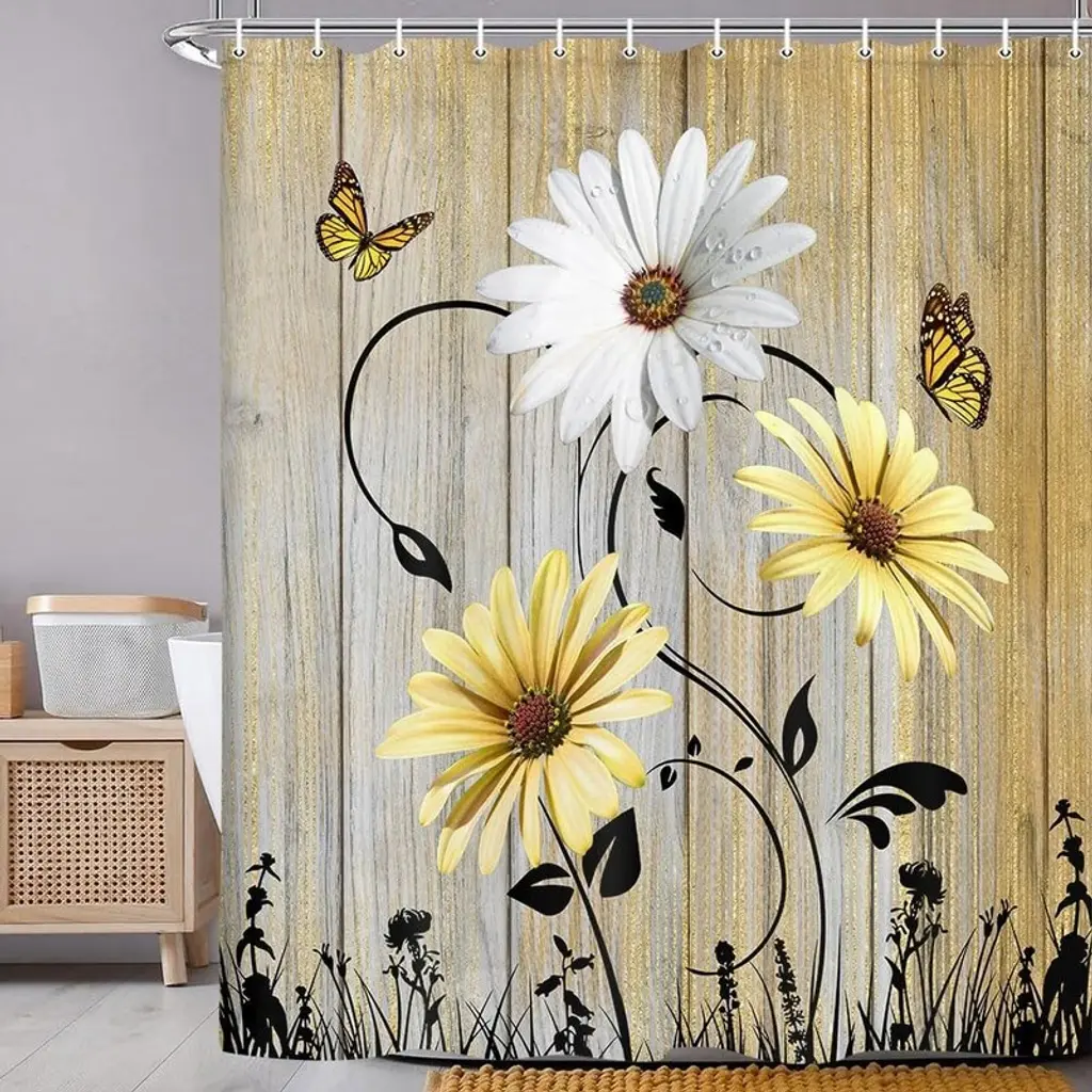 Farm Daisy Floral Butterfly Old Plank Rustic Shower Curtain Accessory Set With Hooks, 69 X 70 - Yellow
