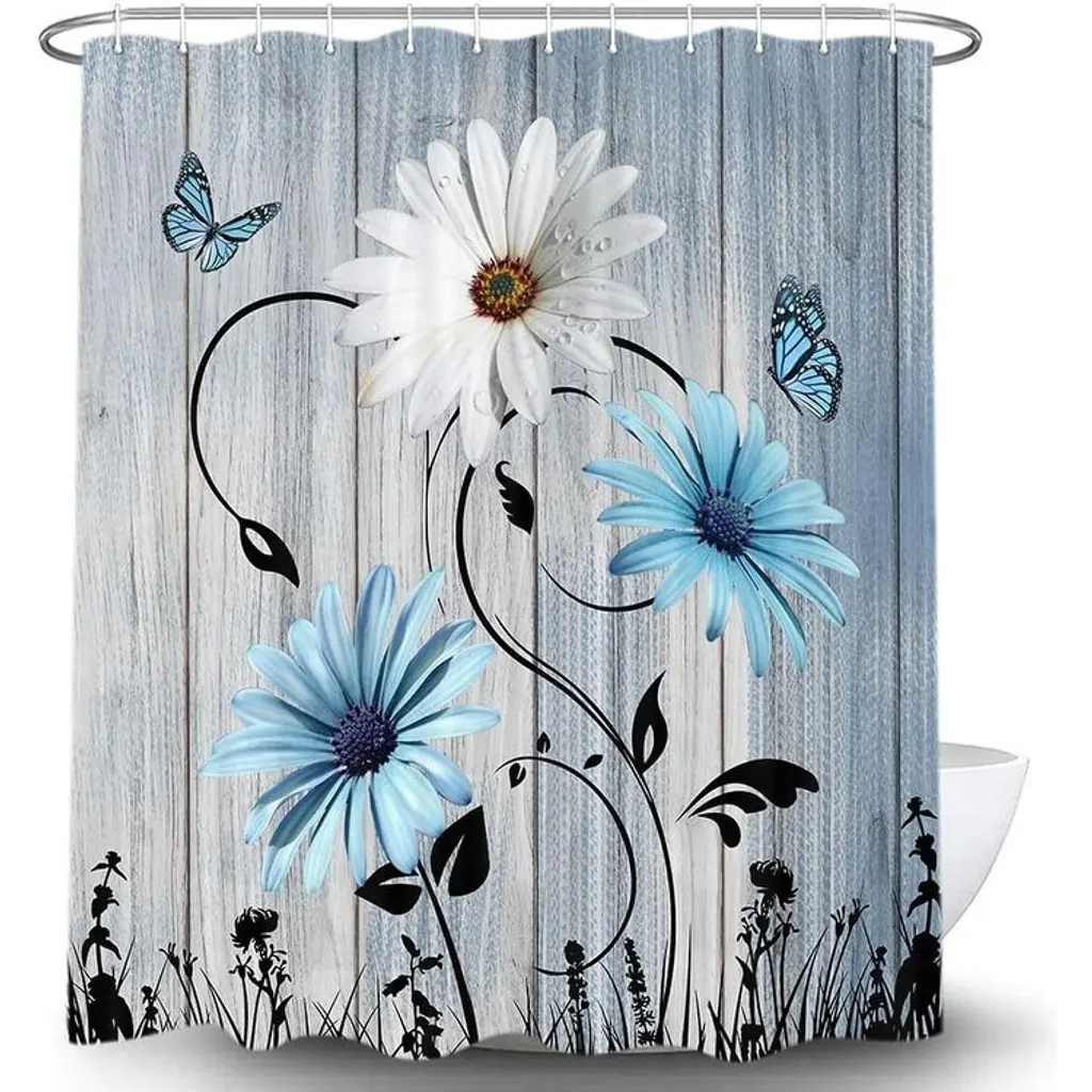 Farm Daisy Floral Butterfly Old Plank Rustic Shower Curtain Accessory Set With Hooks - Size:36"w X 72"l (Pack Of 1)/blue