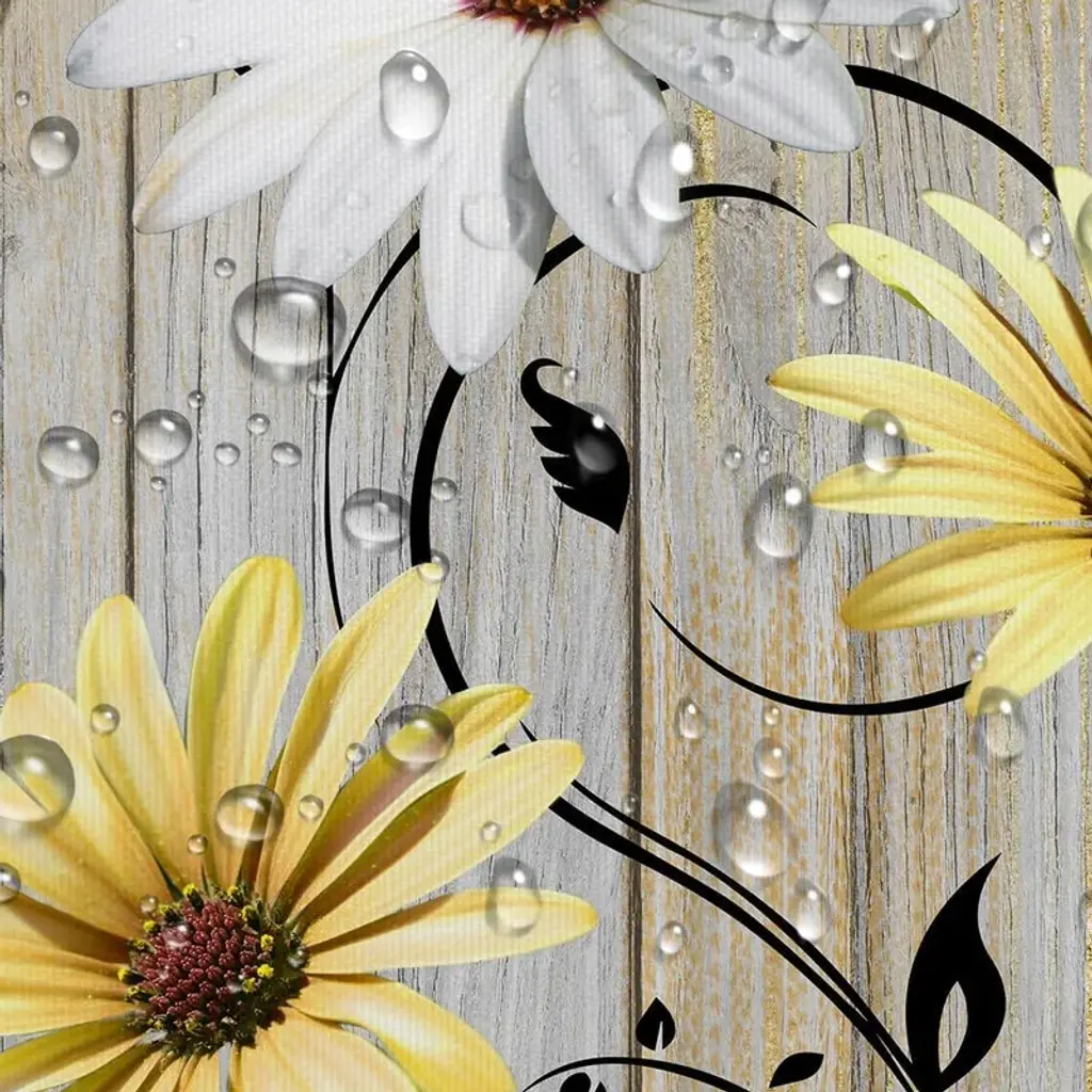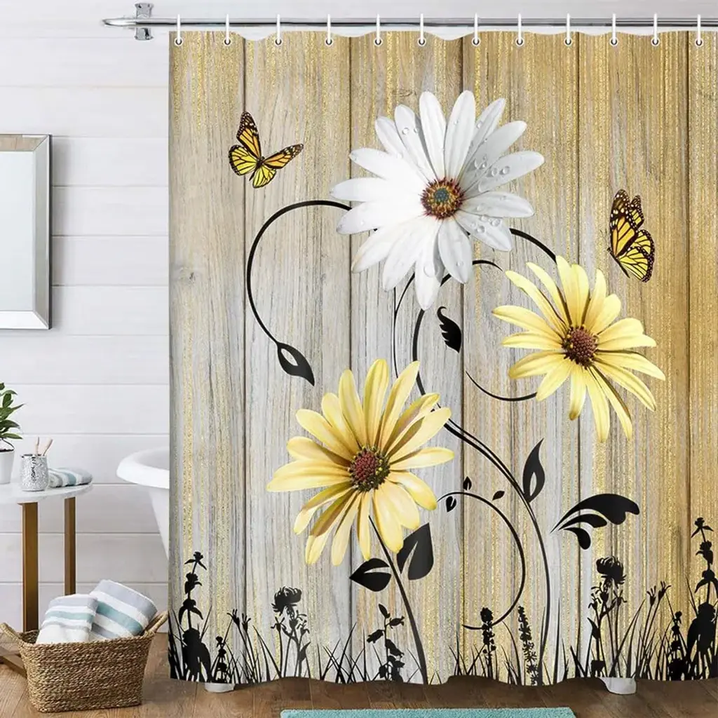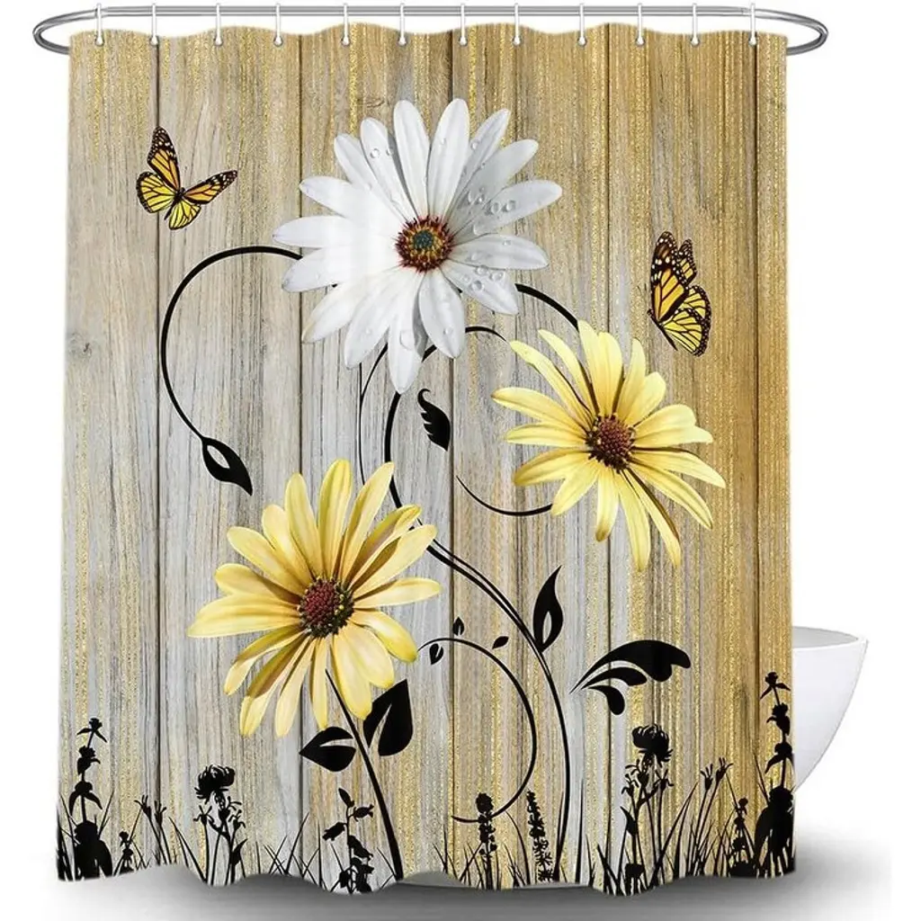Farm Daisy Floral Butterfly Old Plank Rustic Shower Curtain Accessory Set With Hooks - Yellow/47"w X 72"l (Pack Of 1)