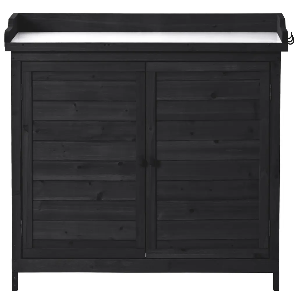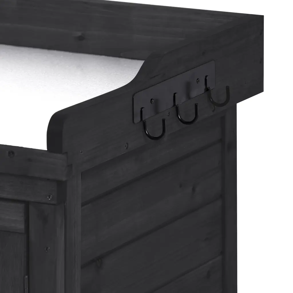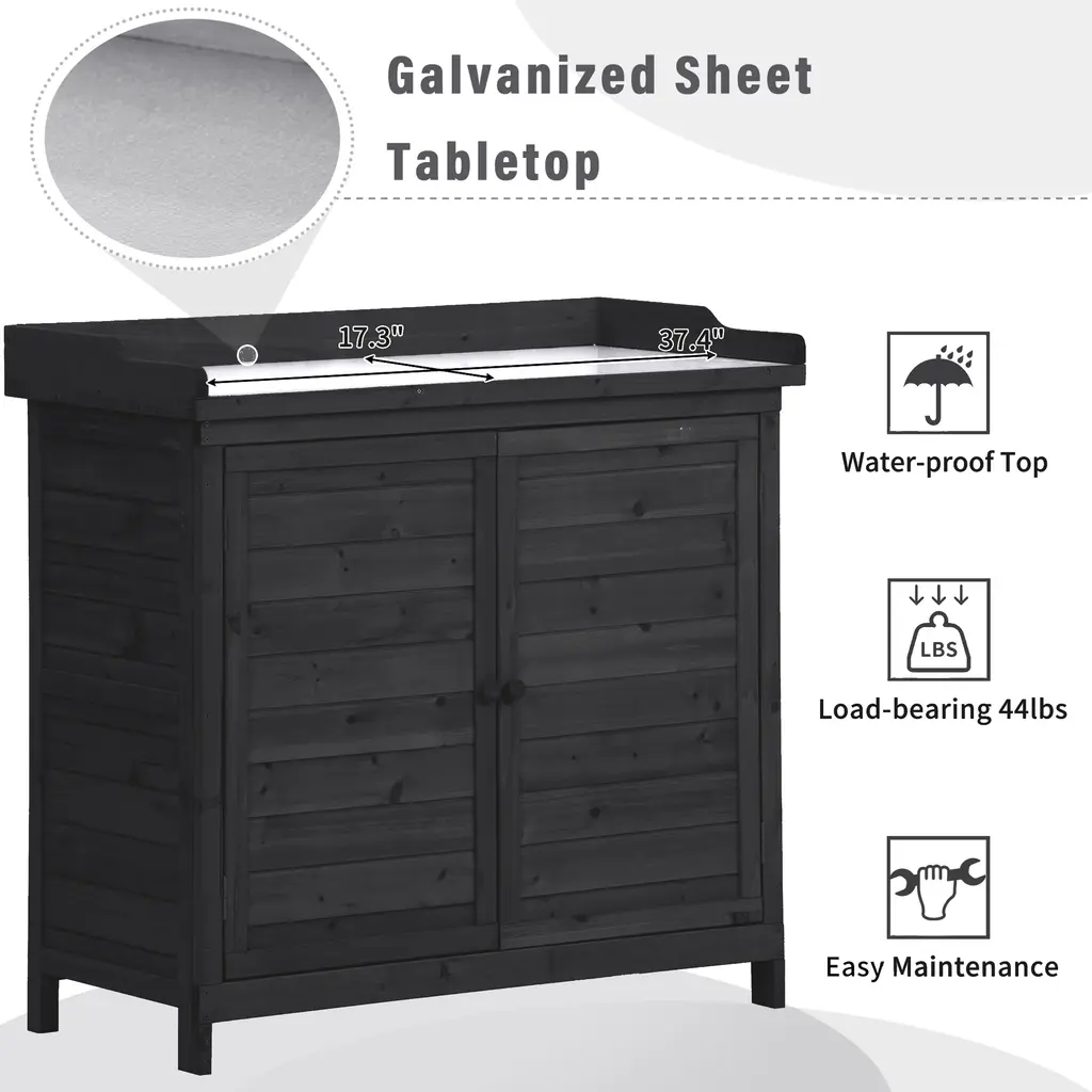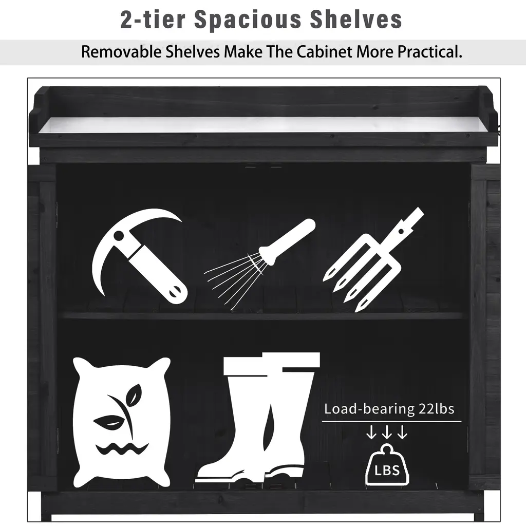 [Premium Fir Wood Potting Bench]Made from 100% fir wood, known for its strength and durability, this potting bench is designed to handle all your gardening tasks. The solid construction ensures stability, with a weight capacity of 44 lbs for the tabletop and 22 lbs for each of the cabinet shelves.[Galvanized Spacious Tabletop]The tabletop is galvanized with zinc, making it water-resistant and easy to maintain. This feature allows you to clean off dirt and debris with ease, and it can even serve as an unconventional buffet table for your patio or deck.[Ample 2-Tier Storage Cabinet]The potting bench includes a 37.4" high cabinet with two spacious shelves to store gardening tools, soil, and pots. The removable shelf design gives you flexibility to organize large and small items without bending or squatting.[Handy Side Hooks]For added convenience, the potting bench comes with 3 side hooks. These can be assembled on either side to store gloves, towels, or small gardening tools, ensuring that everything you need is within easy reach.[Dimensions & Warranty]
