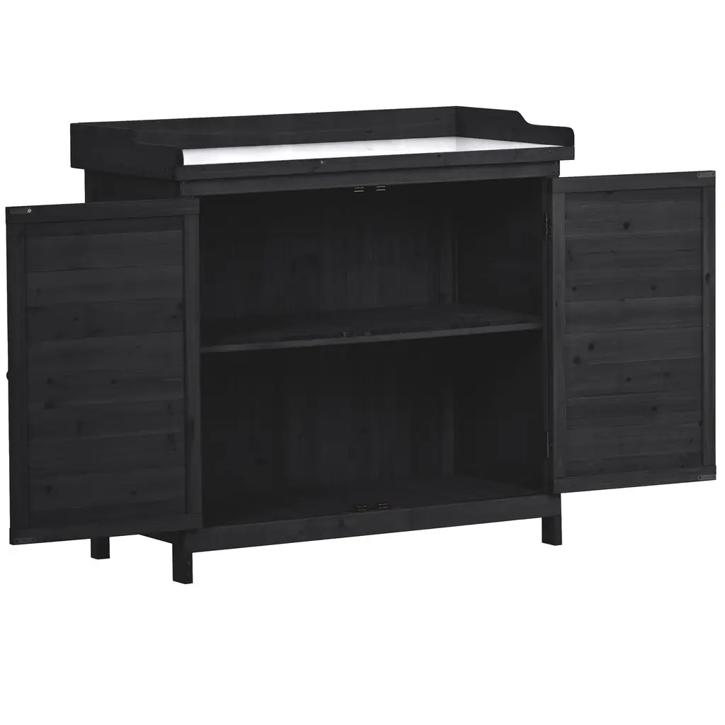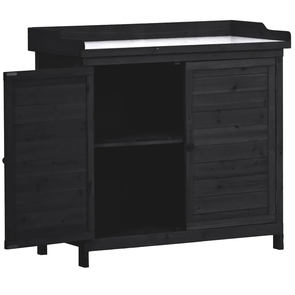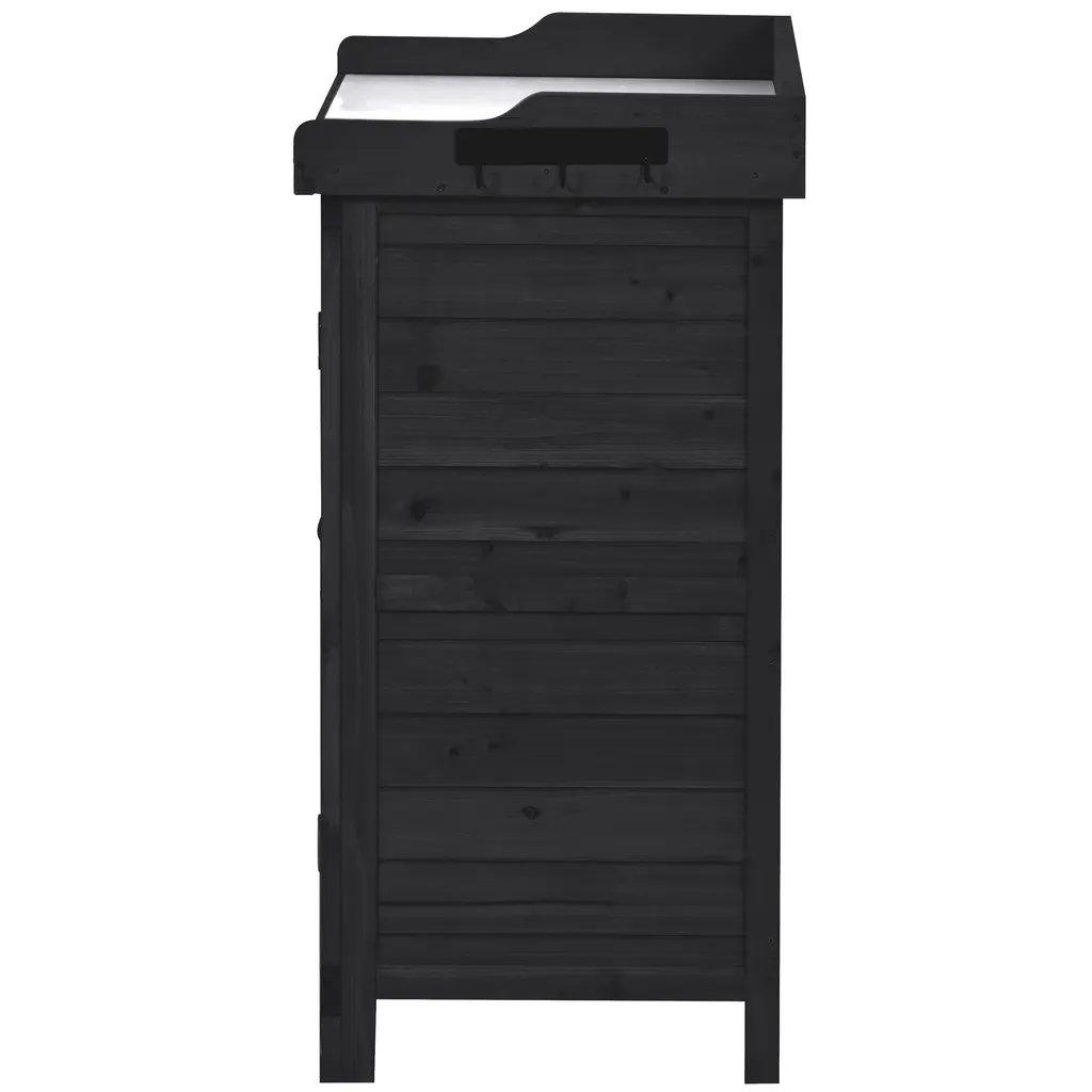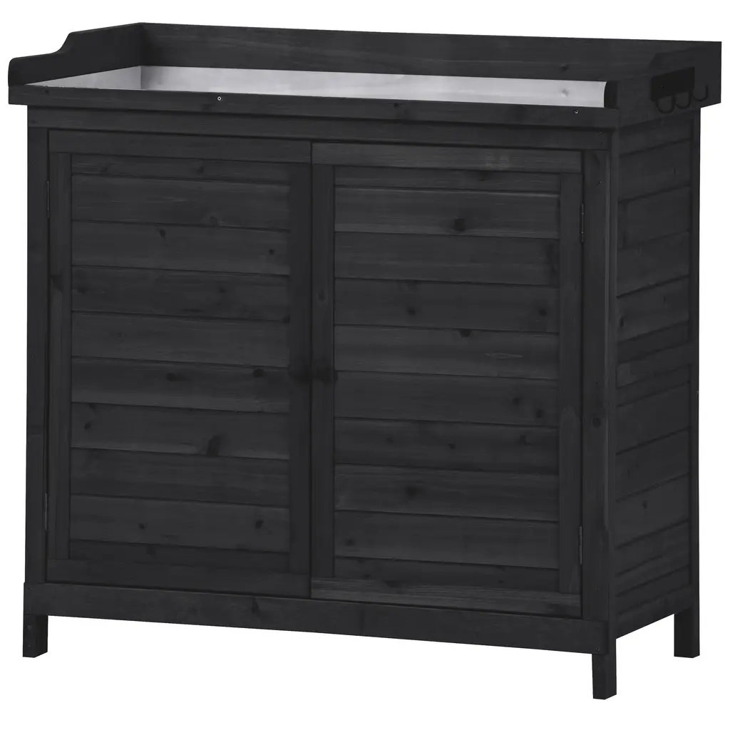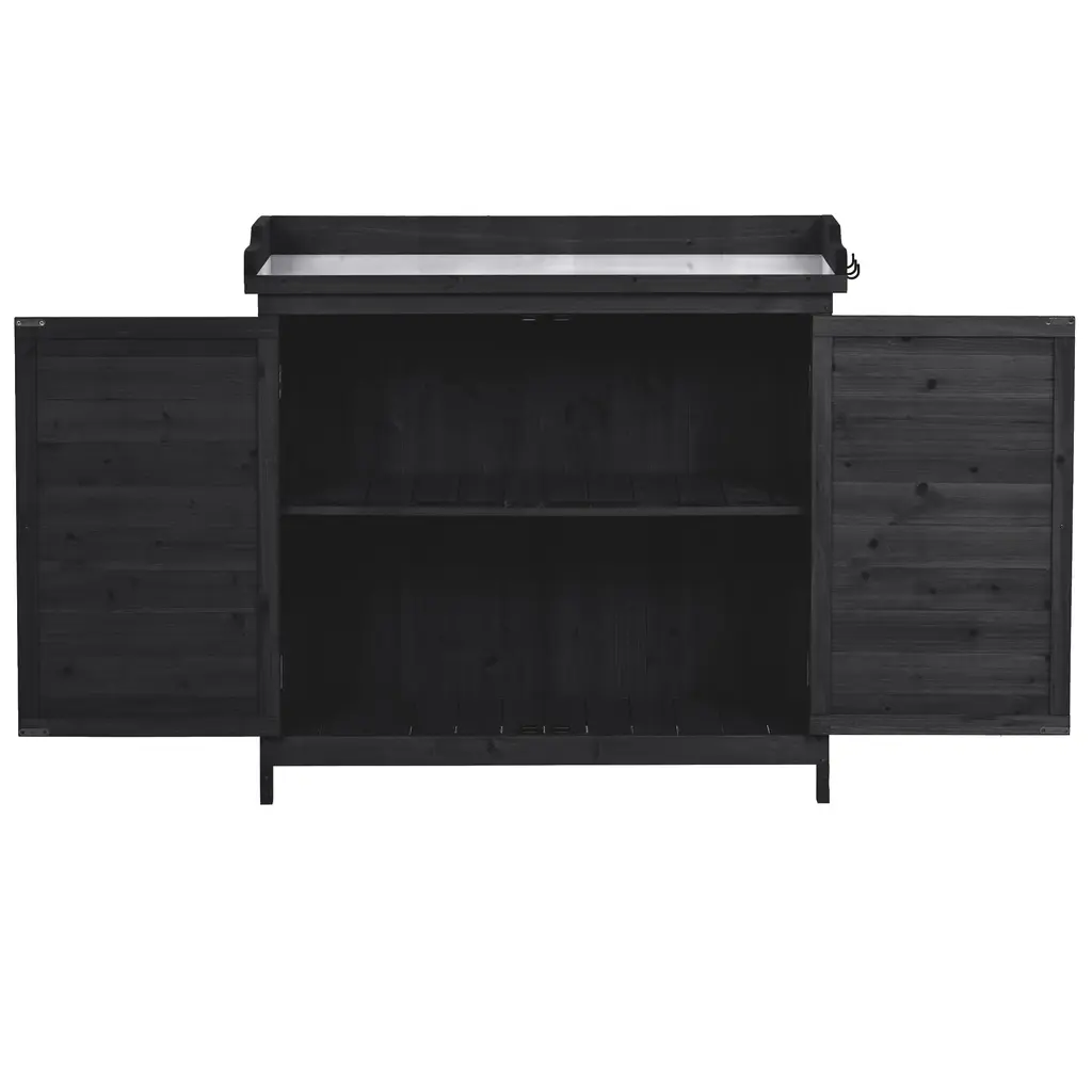 Fir Wood Potting Bench Table With Galvanized Tabletop,2-Tier Storage And Side Hooks - Black