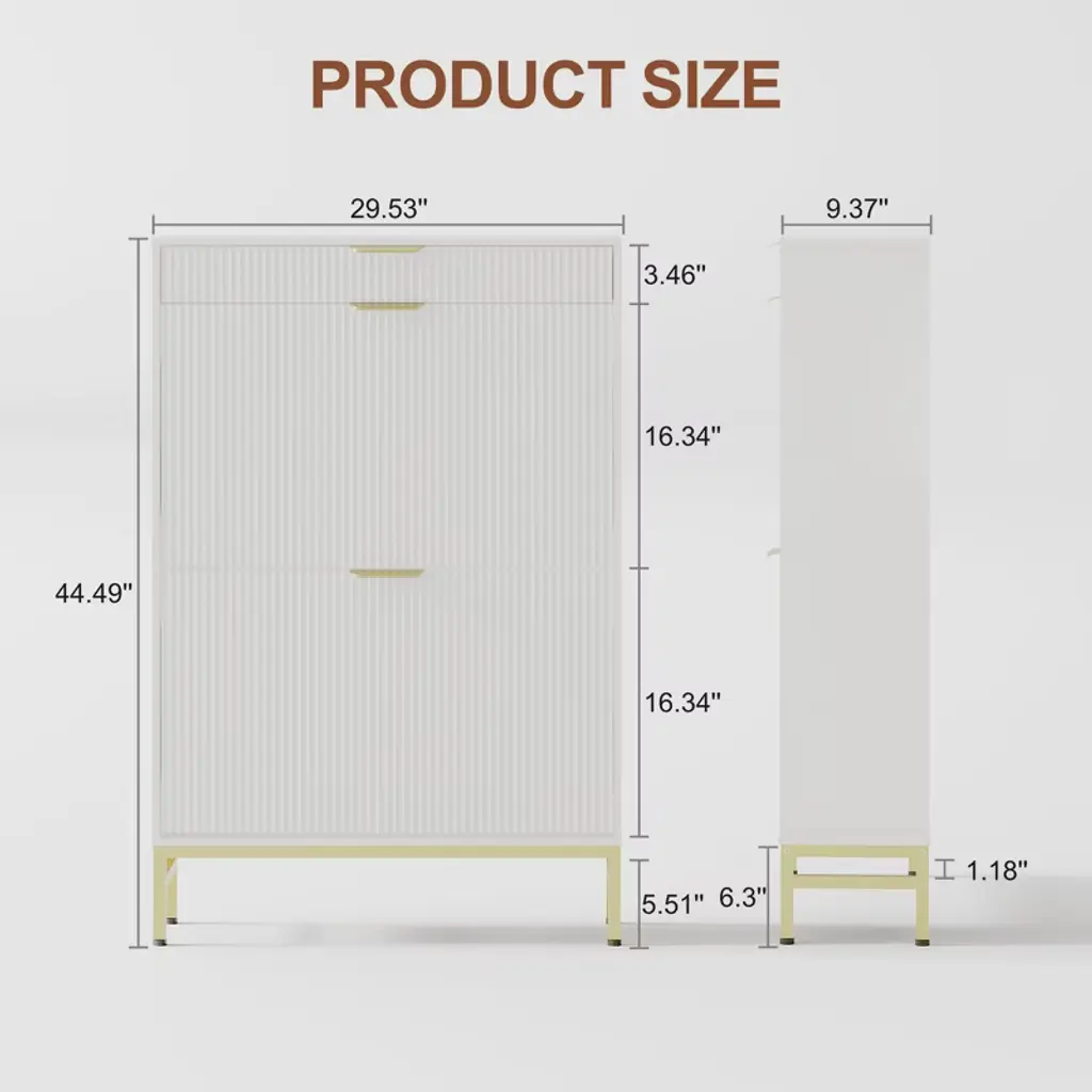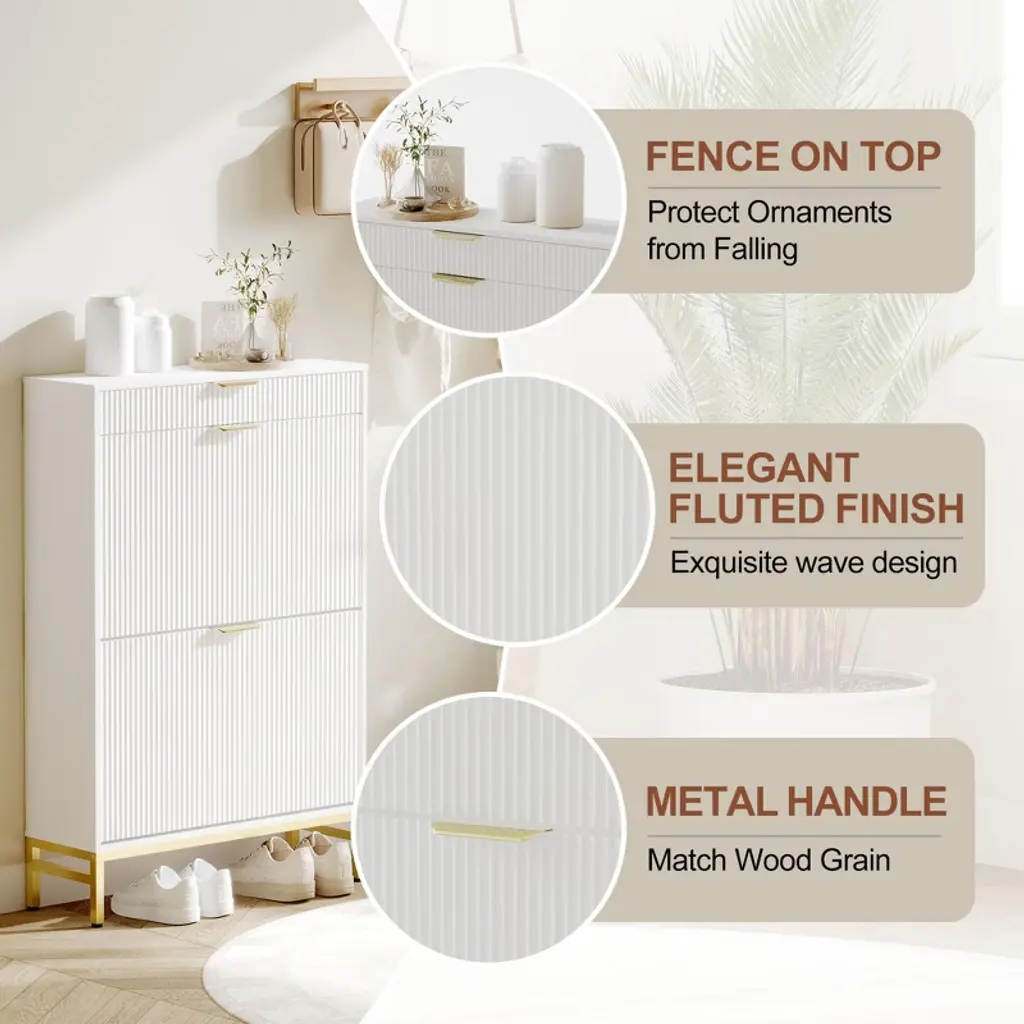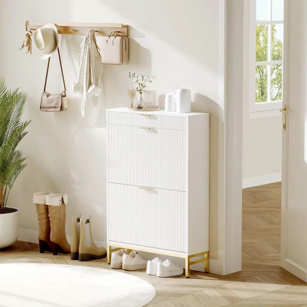 Maximize style and function in small spaces with this fluted shoe storage cabinet. Measuring just 29.5" wide, it fits perfectly in narrow entryways or apartments while offering hidden storage for 6¨C8 pairs of shoes in 2 dual-layer flip drawers. A pull-out drawer keeps keys and sunglasses handy, while a side hook holds bags or accessories. Crafted from sturdy engineered wood with metal legs, it¡¯s built to last and stay stable. Easy to assemble and elegantly designed, this slim shoe organizer keeps your hallway neat and welcoming.