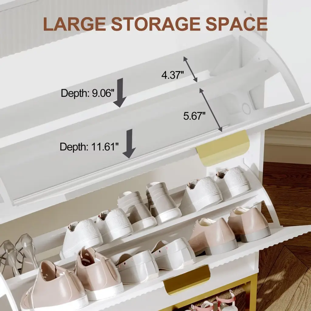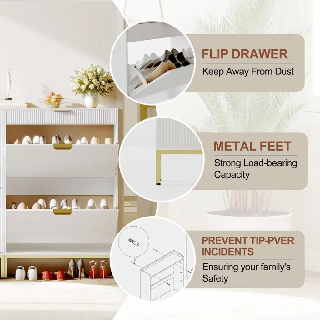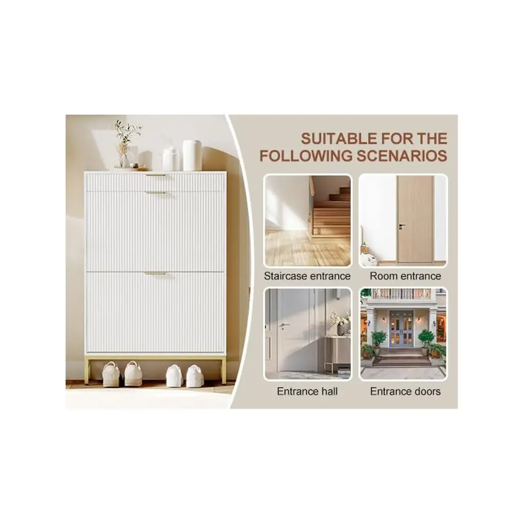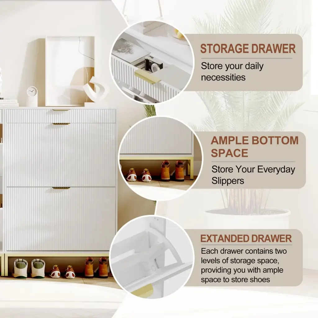 Maximize style and function in small spaces with this fluted shoe storage cabinet. Measuring just 29.5" wide, it fits perfectly in narrow entryways or apartments while offering hidden storage for 6¨C8 pairs of shoes in 2 dual-layer flip drawers. A pull-out drawer keeps keys and sunglasses handy, while a side hook holds bags or accessories. Crafted from sturdy engineered wood with metal legs, it¡¯s built to last and stay stable. Easy to assemble and elegantly designed, this slim shoe organizer keeps your hallway neat and welcoming.
