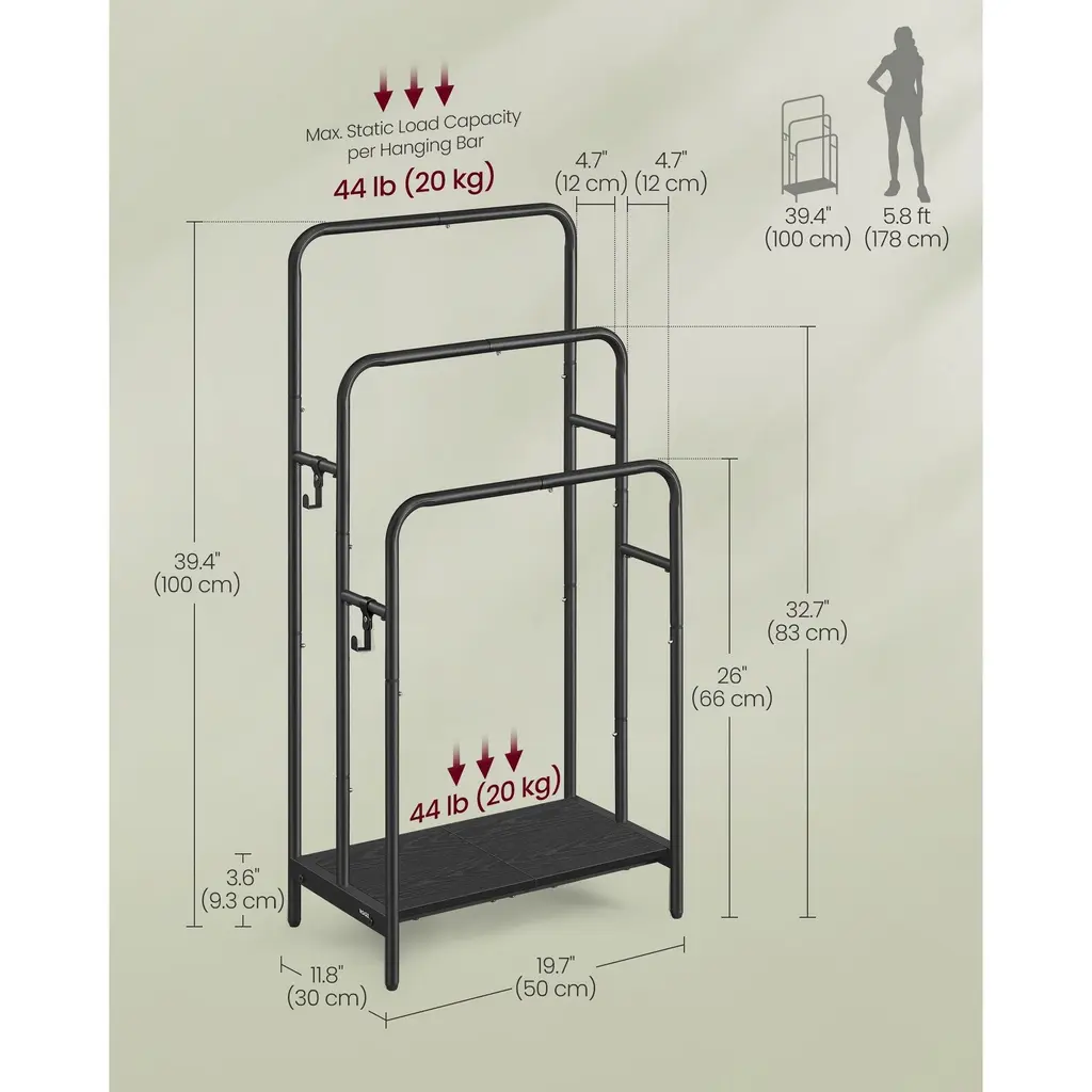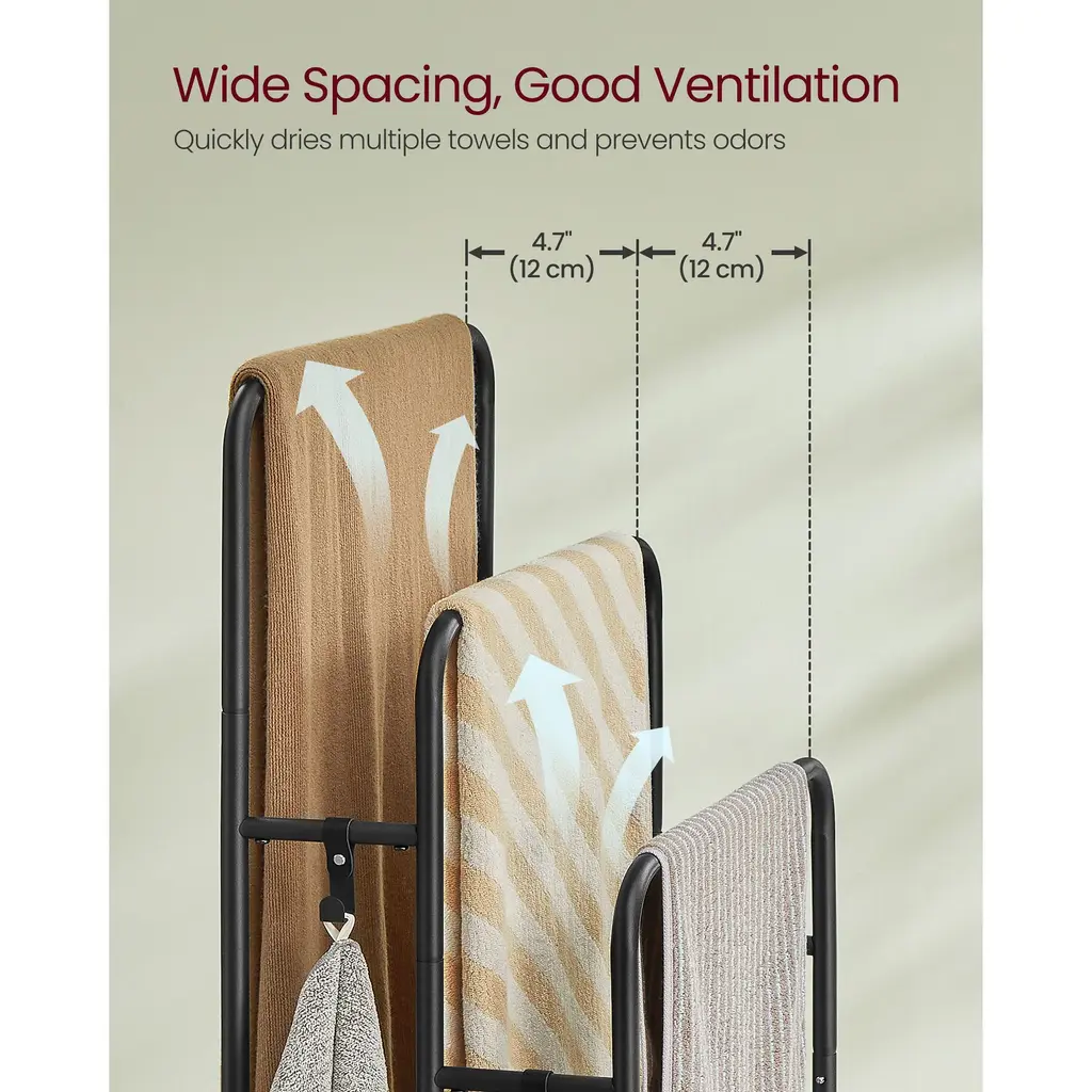 Specifications:Product Size: 27.6"L x 11.8"W x 39.4"HProduct Size: 19.7"L x 11.8"W x 39.4"HKey Features:Description: This versatile 3-tier towel rack is designed for efficient towel storage and drying. Featuring durable steel and particleboard construction, it offers two size options: 27.6"L x 11.8"W x 39.4"H and 19.7"L x 11.8"W x 39.4"H, with a weight of 10.4 lbs and 8.8 lbs, respectively. The rack's spacious hanging bars allow you to dry multiple towels, including large bath towels, while the open design ensures fast drying and prevents odor buildup. Equipped with 2 hooks and a bottom shelf for additional storage, it keeps your bathroom neat and organized. With adjustable feet for stability and easy assembly, this rack offers both practicality and convenience for your bathroom storage needs. Available in Ink-Black-Ebony-Black and Cloud-White-Natural-Beige color options.