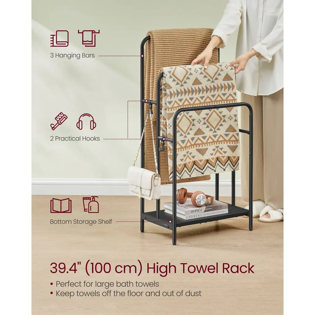 Freestanding 3-Tier Blanket Holder With Storage Shelf And 2 Hooks - 19.7"l X 11.8"w X 39.4"h - Ink-Black-Ebony-Black