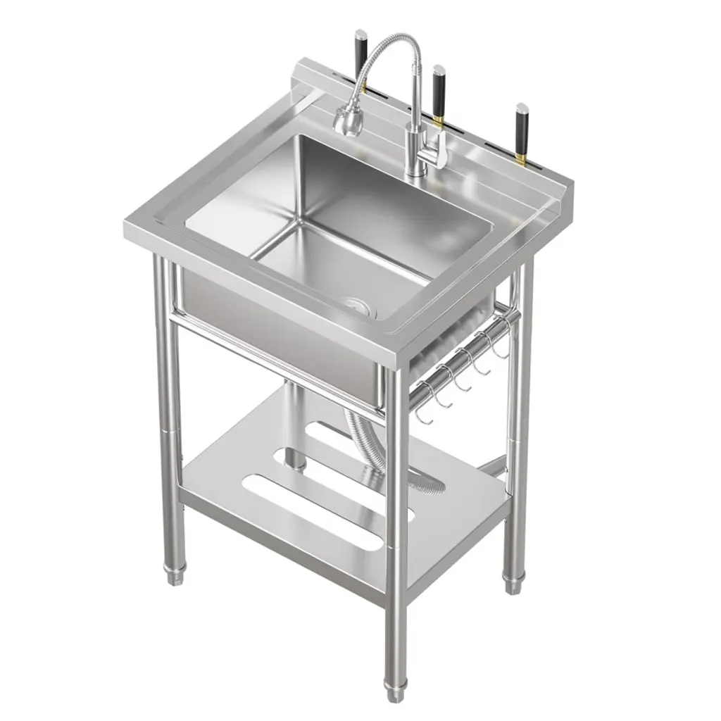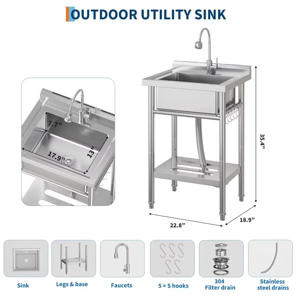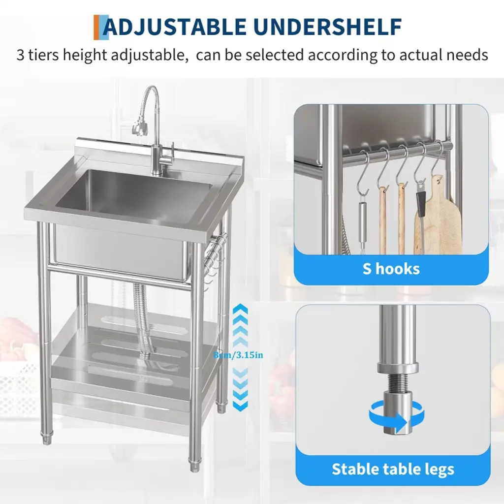 Product Details: Material: Durable rust-resistant stainless steel Dimensions: 23" L x 19" W Basin Size: Spacious single bowl suitable for various washing tasks Faucet: 304 stainless steel hot and cold water faucet with 360¡ã swivel for flexible temperature control Storage: Open work surface and five S-shaped hooks for neat organization of tools, utensils, and cleaning supplies Drainage: Multifunctional multilayer sealed undermount with removable strainer basket to prevent clogging and simplify cleaning Legs: Adjustable feet with anti-slip leveling to maintain stability on uneven floors Installation: Easy assembly with included toolkit; splash guard protects walls with no drilling required Color: Stainless Steel Suitable For: Laundry rooms, garages, basements, kitchens, and other utility spaces Description: Optimize your workspace with this compact freestanding stainless steel utility sink measuring 23"x19". The design includes an open work surface and five S-shaped hooks, providing ample organized storage for cleaning supplies, tools, and utensils. The 304 stainless steel hot and cold faucet swivels 360 degrees, allowing flexible temperature control and easy maneuverability. The sink features a multifunctional multilayer sealed undermount with a removable strainer basket that prevents clogs and simplifies maintenance, ensuring smooth drainage. Adjustable feet with anti-slip leveling provide excellent stability on uneven floors, adapting to different environments with ease. With a 3.5-inch backsplash that protects walls from splashes and requires no drilling for installation, this sink is well-suited for laundry rooms, garages, basements, kitchens, and other versatile utility spaces. Easy to assemble with the included toolkit, this durable sink enhances organization, functionality, and efficiency in any workspace. After-Sales Service: Customer support available for installation guidance, maintenance advice, and warranty service. What You Will Receive: Freestanding stainless steel utility sink (23"x19") with single bowl 304 stainless steel hot and cold 360¡ã swivel faucet Five S-shaped hooks Open work surface Multifunctional multilayer sealed undermount with removable strainer basket Adjustable anti-slip feet Splash guard backsplash Assembly toolkit and instructions Applicable Scenarios: Perfect for laundry rooms, garages, basements, kitchens, and other small utility spaces needing an organized, durable, and multifunctional sink.