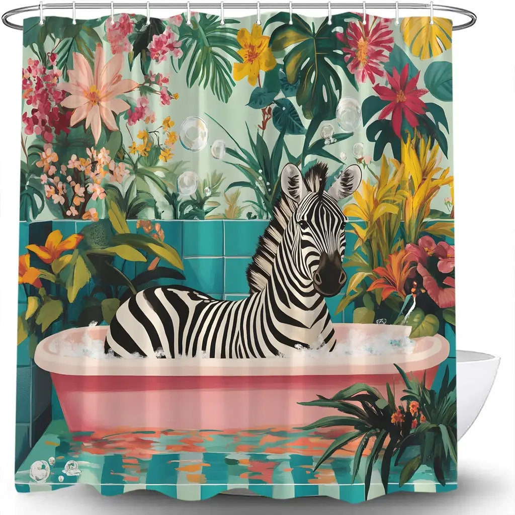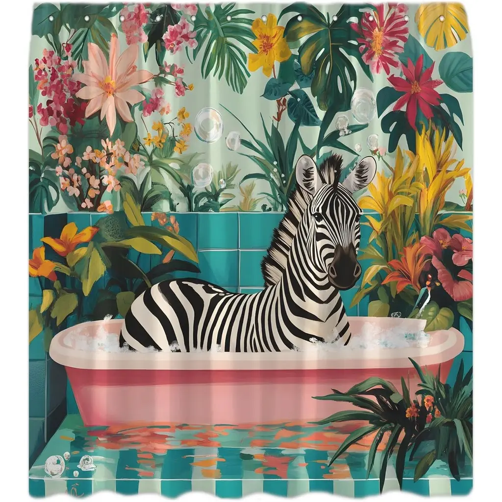 Add a playful touch to your bathroom with the Funny Zebra Shower Curtain, featuring a safari jungle design. This charming curtain showcases a whimsical zebra in a lively jungle setting, bringing a fun and lighthearted vibe to your space. Made from high-quality, water-resistant fabric, it ensures durability while maintaining a soft, flowing drape. Measuring standard size, it provides full coverage for most showers and tubs. Complete with hooks for easy installation, this shower curtain is perfect for animal lovers and anyone looking to add a bit of humor and personality to their décor.