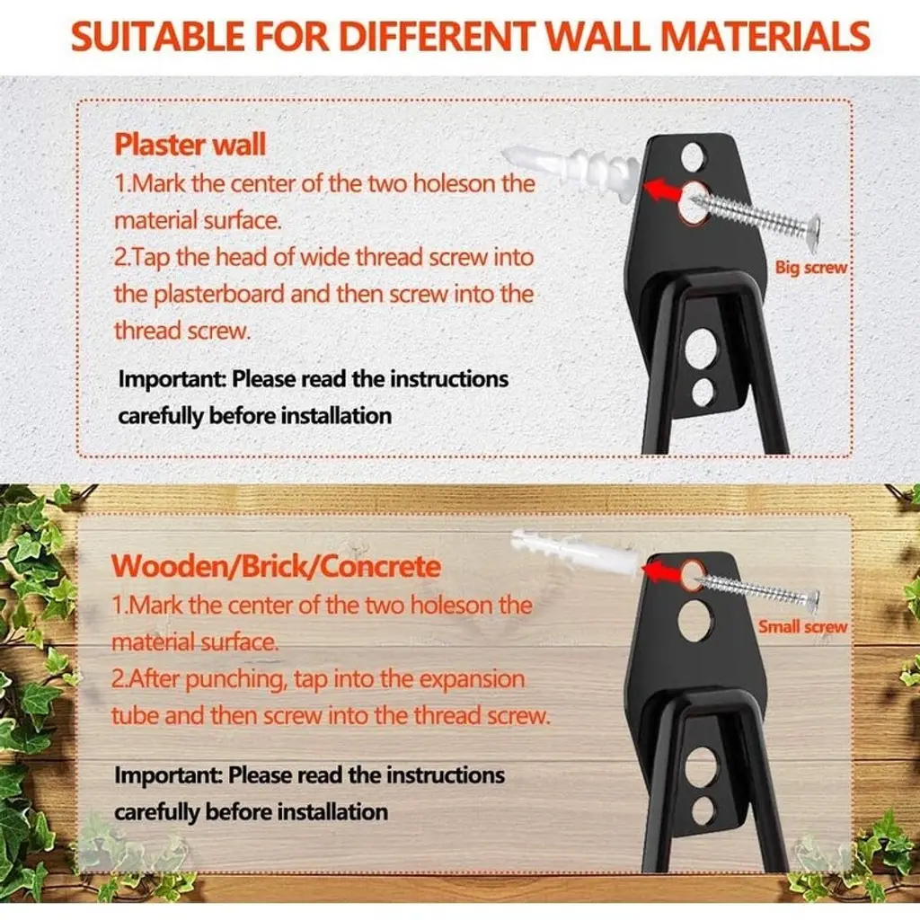 14 wall-mounted trapezoidal hooks of 5 different sizes: 4 * Small J Hook, 1 * Big J Hook, 5 * Small L-shaped Hook, 2 * Medium L-shaped Hook, 2 * Large L-shaped Hook. It is also equipped with 56 * Steel screws, 28 Pcs wide threaded plugs and 28 Pcs anchors. The lengths are 1.18", 1.3" and 1.18" respectively, 2 load-bearing belts are 9.5" and 6" respectively. The garage wall hook is suitable for plaster walls, wooden walls and brick walls. Different walls use different wide threaded plugs and plastic anchors. The expansion board design can evenly distribute the weight, thus providing excellent fixing force. It has a strong PVC non-slip coating, which can easily hold the item and fix it firmly for many years and protect the surface of the product from being scratched. Don't worry about your tools dropping again! Heavy-duty solid steel hooks can create efficient storage space for your garage, garden, shop, basement or warehouse. With the aid of the double hook design, things that need to be hung and held can be completely hung to free up space in the garage. The garage hook is very durable, ensuring a lifetime experience.
