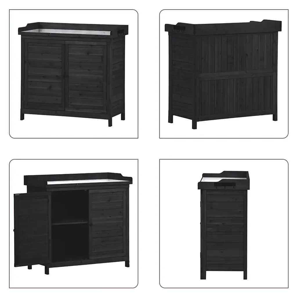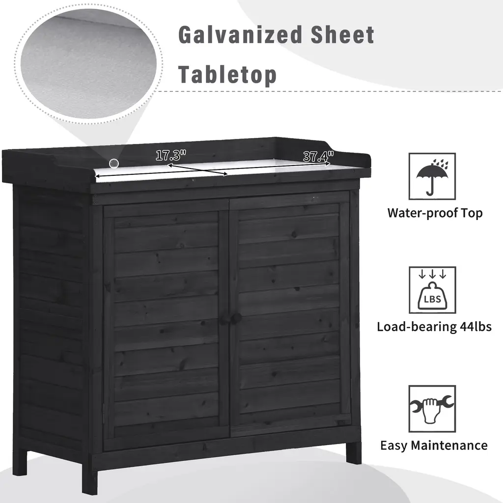 Description:Welcome spring with the Outdoor 39" Potting Bench Table, a rustic garden workstation designed to make your gardening experience more enjoyable and efficient. Constructed from 100% fir wood, this potting bench offers both strength and durability, ensuring it will be a reliable addition to your garden for years to come. The stable structure can hold up to 44lbs on the tabletop and 22lbs on the cabinet shelves, providing ample support for all your gardening activities. Upgrade your gardening setup with the Outdoor 39" Potting Bench Table and enjoy a more organized and efficient gardening experience. Features:【Premium Fir Wood Construction】- Made from 100% fir wood, this potting bench offers exceptional dimensional strength and durability, perfect for your gardening needs. The stable structure can support up to 44lbs on the tabletop and 22 lbs on the cabinet shelves. 【Galvanized Spacious Tabletop】- The galvanized zinc tabletop is waterproof and easy to maintain, making it ideal for gardening. Its versatile design also allows it to be used as a buffet table on your patio or deck. 【Ample 2-Tier Storage Cabinet】- With a total height of 37.4 inches, this potting bench features two spacious storage shelves that keep your tools organized and within reach. The removable shelf provides additional space for small tools, extra soil, pots, and other gardening supplies. 【Handy Side Hooks】- For added convenience, the potting bench includes three side hooks that can be assembled in different locations. These hooks are perfect for hanging gloves, towels, and small tools, keeping them easily accessible. 【Dimensions & Warranty】- Overall size: 39x19.1x37.4 inches (LxWxH); Tabletop: 37.4x17.3 inches (LxW); Shelf: 35.6x15.7 inches (LxW). Please refer to the dimension image for more details. A warranty is included, and we are always available to assist with any issues.Weight&Dimensions&Specifications:Maintenance&Notice