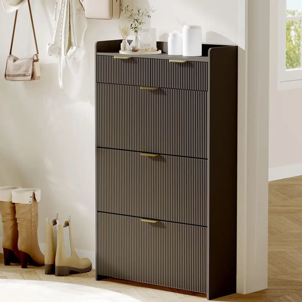 Garvee Modern Shoe Cabinet - 3 Flip Drawers + 2 Small Drawers & Hook, Slim Fluted Entryway Organizer, Narrow Storage, Black