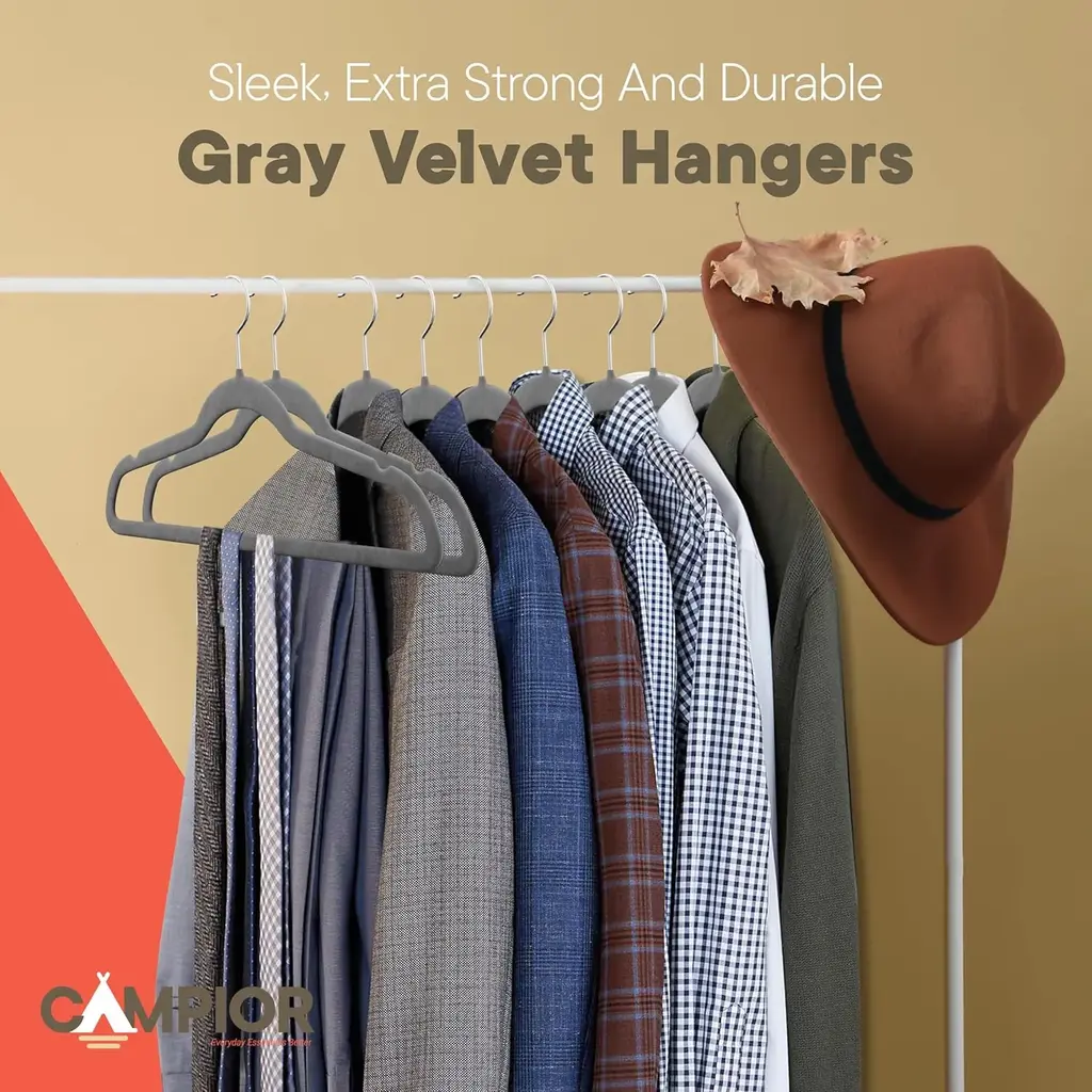 Discover the ultimate solution to your closet organization with our hangers. Engineered with a robust recycled ABS construction, a smooth gray velvet finish, and a sturdy metal hook, these hangers are designed to handle up to 10 lbs effortlessly—perfect for both everyday wear and heavy-duty garments. The non-slip velvet surface ensures your clothes remain securely in place, preserving their shape and eliminating unwanted creases. With a 360° swivel hook for effortless access and adjustment, you'll enjoy quick and easy organization every morning. Our ultra-thin, space-saving hangers maximize your closet capacity, making it easier than ever to achieve a neat and organized wardrobe. The sleek, modern design not only elevates the aesthetic of your space but also contributes to an efficient, frustration-free hanging experience. Whether you’re refreshing your closet at home or outfitting a dorm room, these versatile velvet hangers provide the perfect blend of durability, functionality, and style for all your clothing needs.