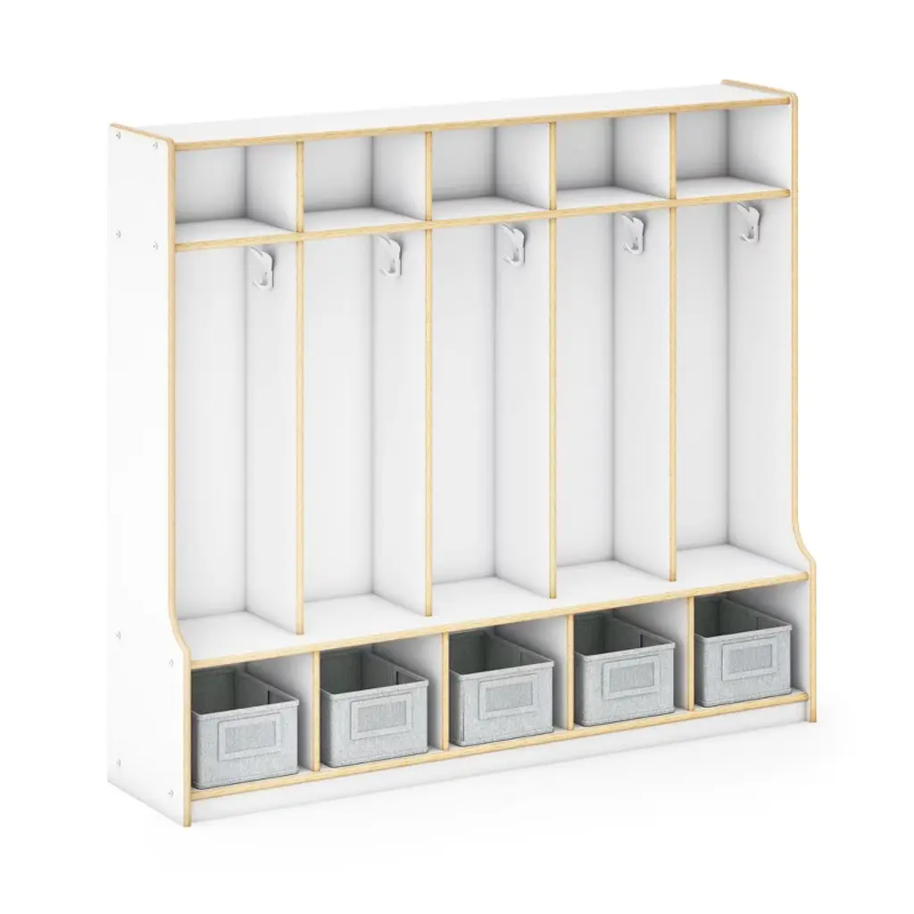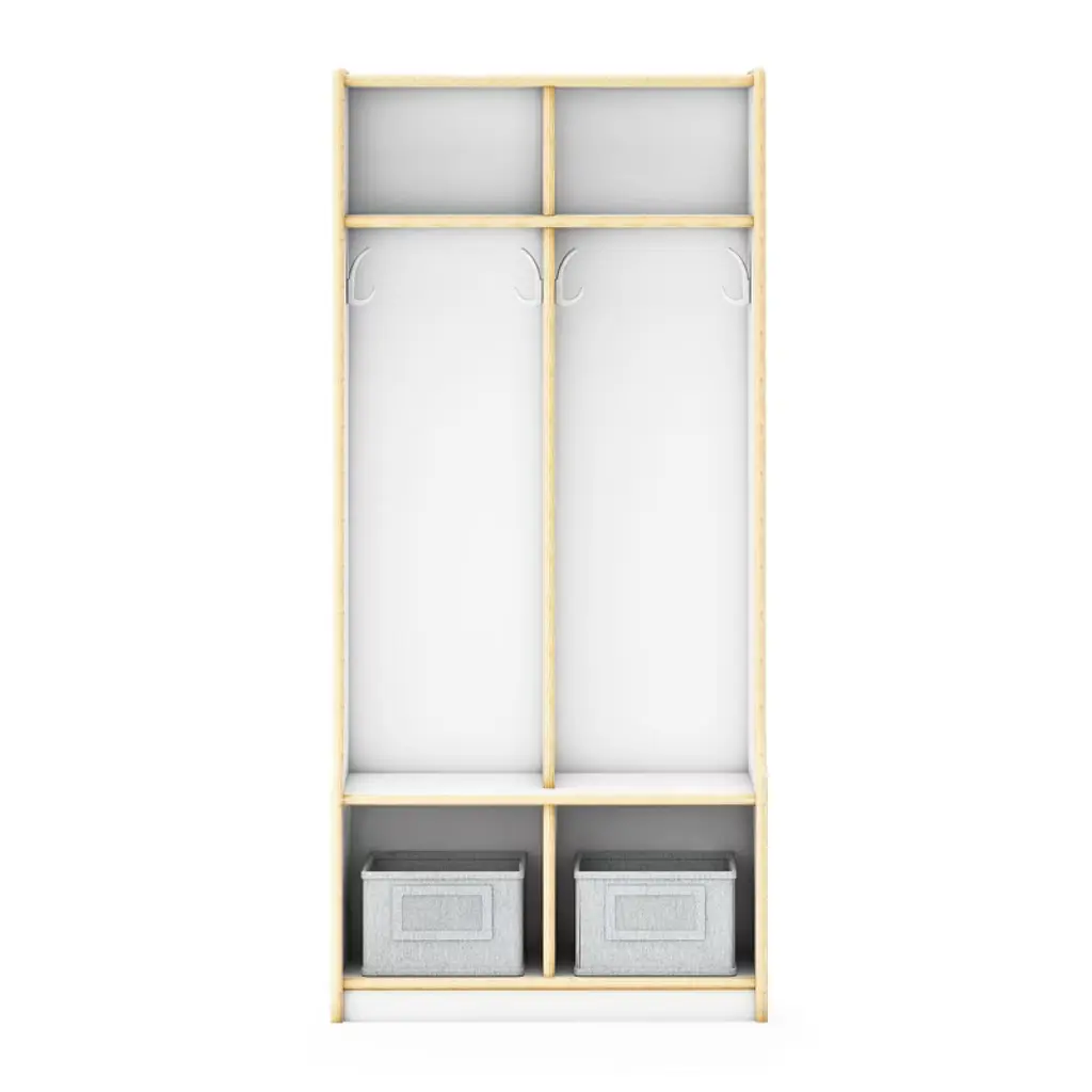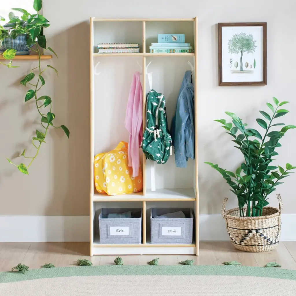Guidecraft's EdQ Collection offers a full range of versatile furniture to satisfy all of the unique needs of early childhood classrooms, homeschools and kids' play areas. Complete your learning environment with an EdQ 2-Section Locker with Bench. Available in white or natural finishes to coordinate with any space, these easy-to-clean premium birch plywood lockers are the perfect way to organize your room or to create an inviting entryway into the classroom. A bottom bench seat encourages independence and good habits, allowing children to put shoes on by themselves, or take a rest before leaving the classroom. Specially designed with divided cubbies, heavy-duty plastic hooks, and shelves with bins, children can easily store and organize all of their belongings. Entire unit measures 22in W x 13in D x 48in H. Assembly required.