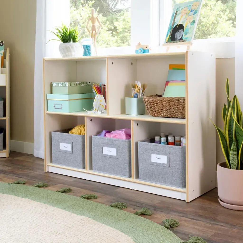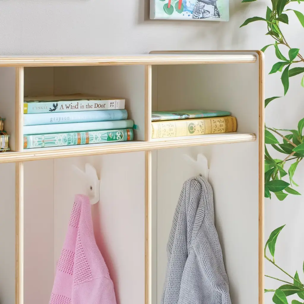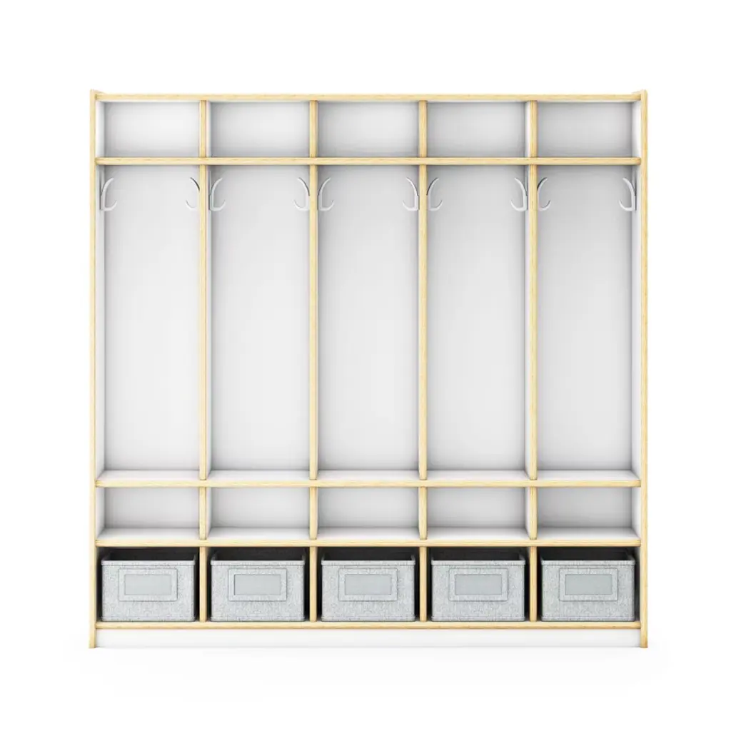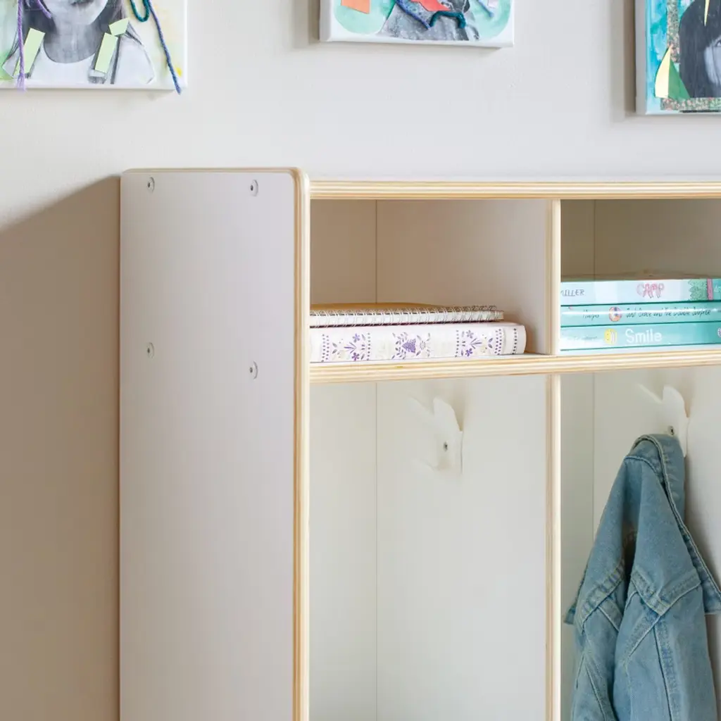 Guidecraft's EdQ Collection offers a full range of versatile furniture to satisfy all of the unique needs of early childhood classrooms, homeschools and kids play areas. Complete your learning environment with an EdQ 5-Section Locker. Available in white or natural finishes to coordinate with any space, these easy-to-clean premium birch plywood lockers are the perfect way to organize your room. Specially designed with divided cubbies, heavy-duty plastic hooks, and shelves with bins, children can easily store and organize all of their belongings. Entire unit measures 48in W x 13in D x 48in H. Locker set is just the right height for children ages 3 and up. Assembly required.