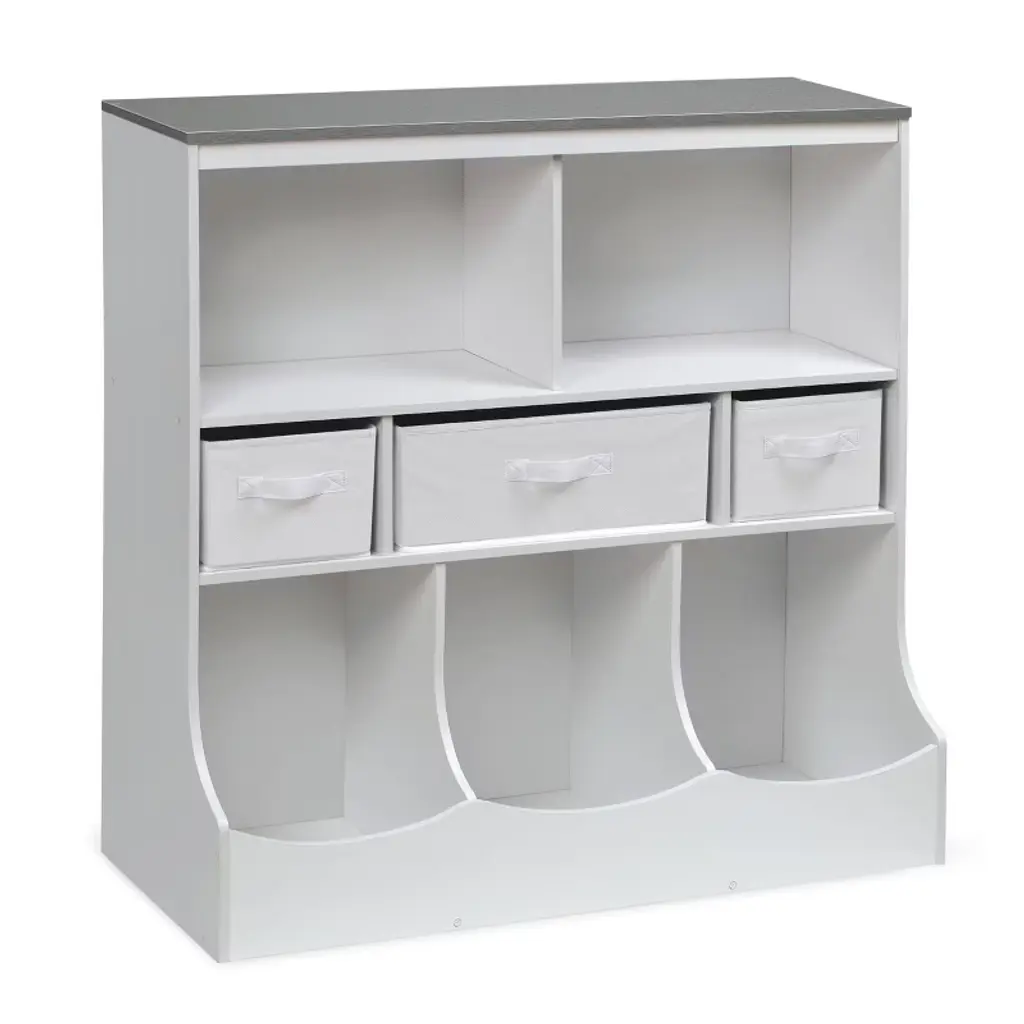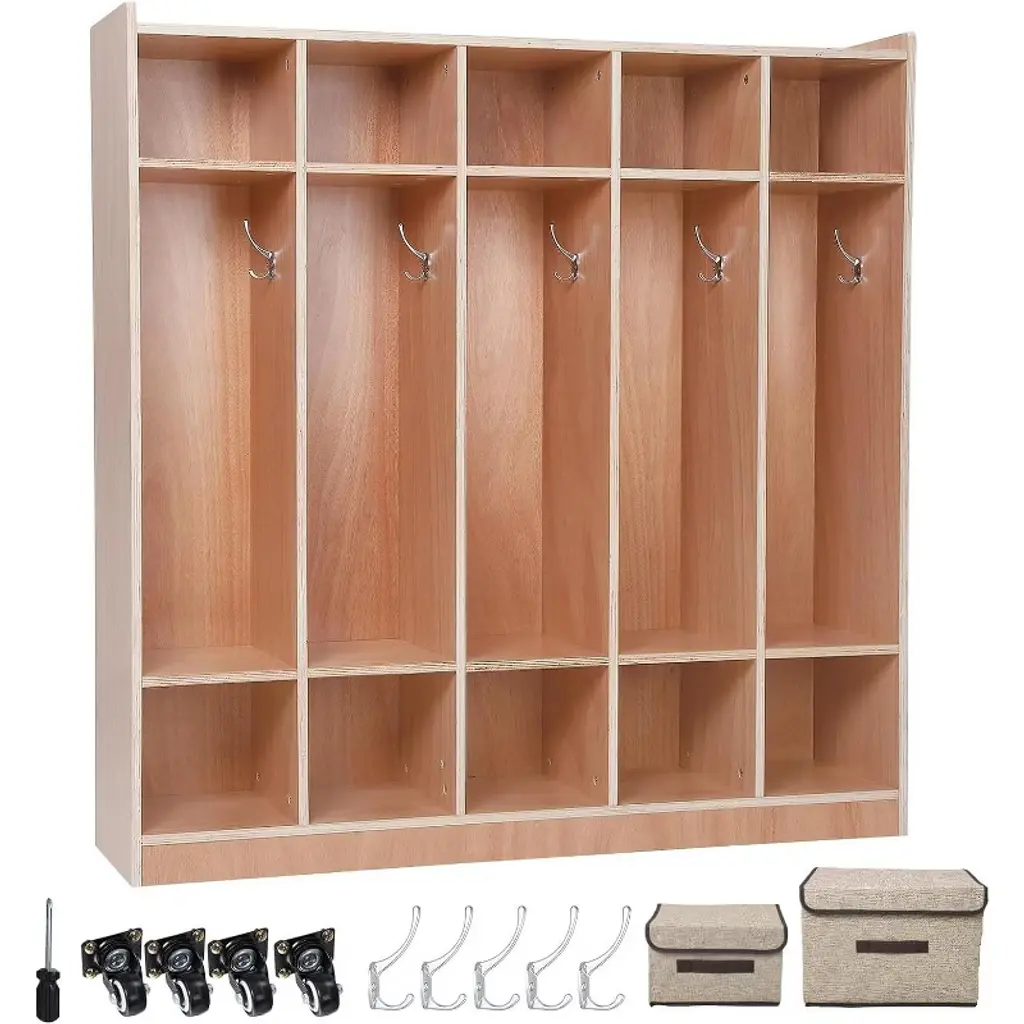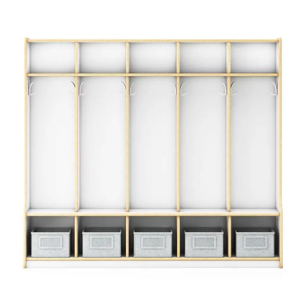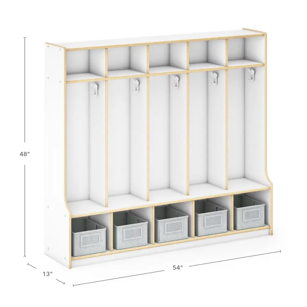 Guidecraft's EdQ Collection offers a full range of versatile furniture to satisfy all of the unique needs of early childhood classrooms, homeschools and kids' play areas. Complete your learning environment with an EdQ 5-Section Locker with Bench. Available in white or natural finishes to coordinate with any space, these easy-to-clean premium birch plywood lockers are the perfect way to organize your room or to create an inviting entryway into the classroom. A bottom bench seat encourages independence and good habits, allowing children to put shoes on by themselves, or take a rest before leaving the classroom. Specially designed with divided cubbies, heavy-duty plastic hooks, and shelves with bins, children can easily store and organize all of their belongings. Entire unit measures 54in W x 13in D x 48in H. Assembly required.