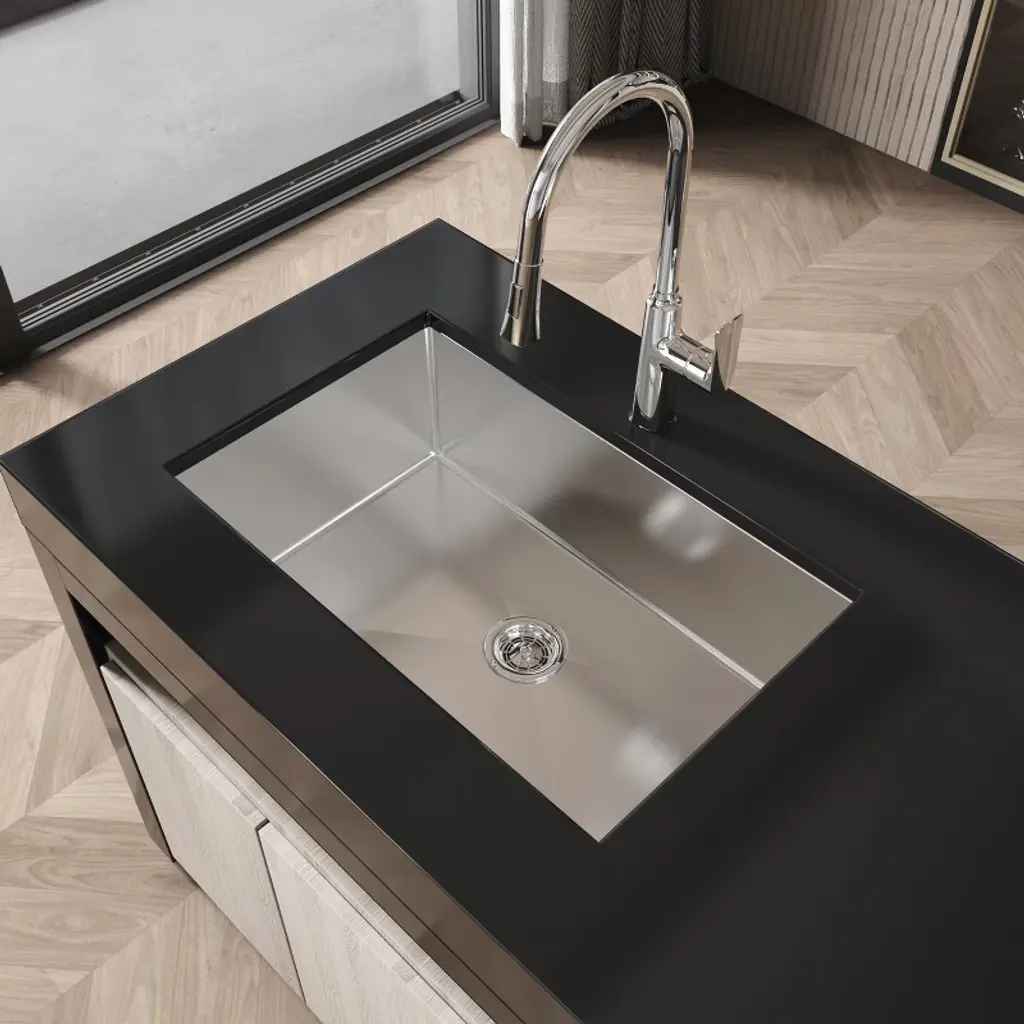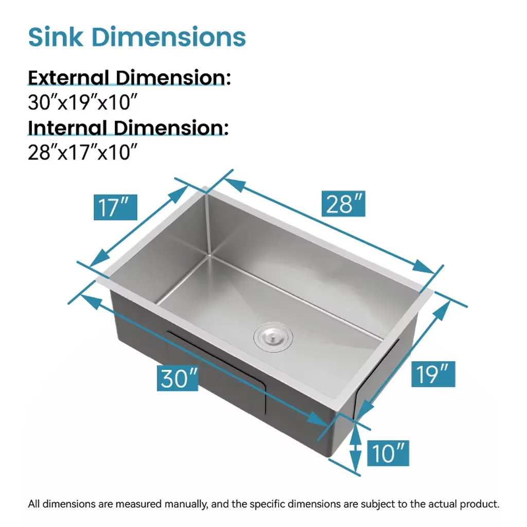 Gulches 30"x19" Kitchen Sink: 304 stainless steel (20 gauge) with brushed nickel finish scratch-resistant, easy to clean. Single bowl design offers ample space for dishes/prep. Undermount/drop-in install for a sleek look; drain grooves, coating layer, and sound insulation enhance functionality. Includes US-standard drain and hooks.