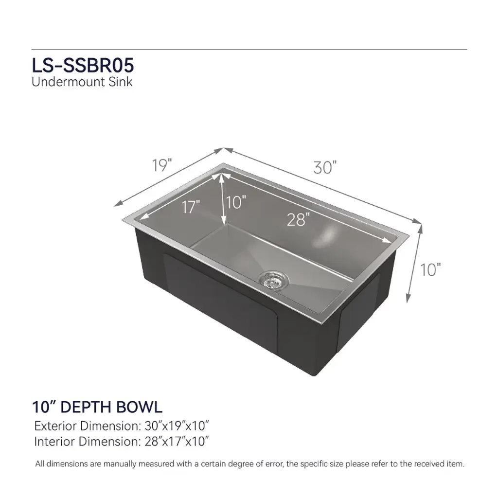 Gulches 30"x19" Stainless Steel Kitchen Sink, Drop In/undermount Single Bowl, Brushed Nickel, With Us Standard Drain & Hook