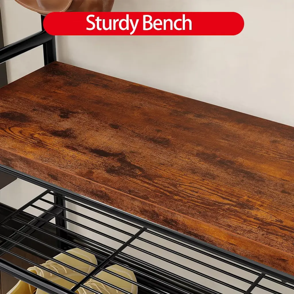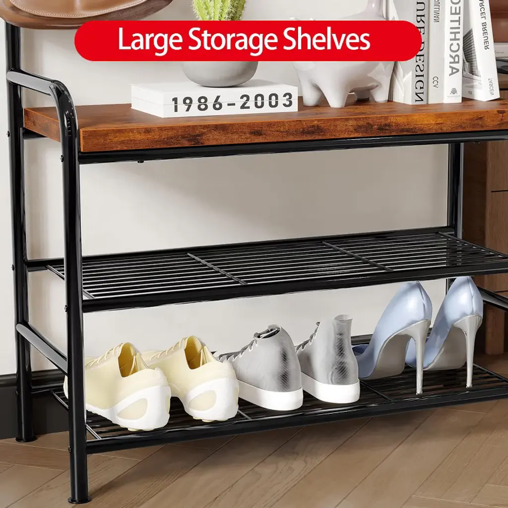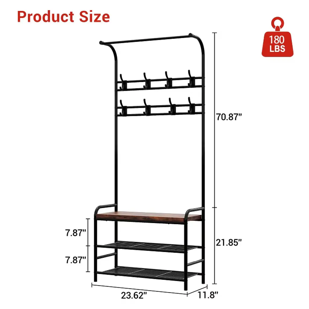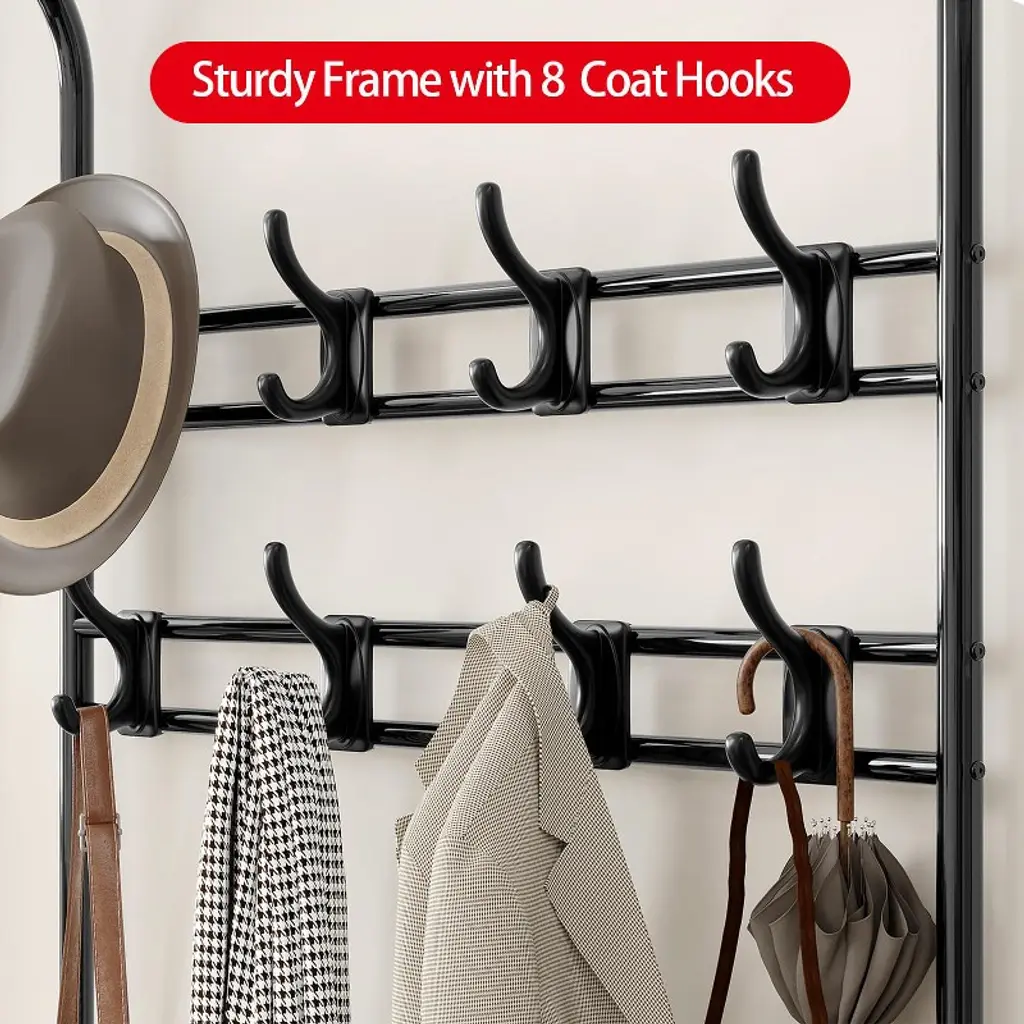 Hall Tree Shoe Bench, 4-in-1 Industrial Entryway Storage Bench with 8 Sturdy Hooks, Freestanding Coat Rack for Small Spaces, Apartments