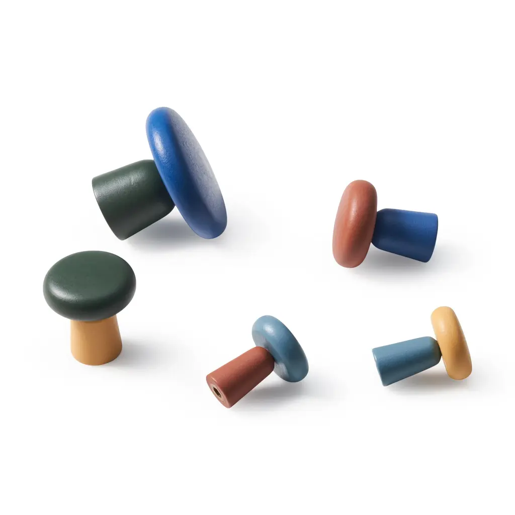 This set of eclectic Harbor Wall Hooks—they’re a mix of different sizes and color combinations—are like happy, useful mushrooms sprouting from your wall. The colors of the hooks are inspired by the wooden houses that dot the coasts of Scandinavia. Use them to hang a wide variety of items in your home: coats, scarves, umbrellas, dog leashes, ballet slippers—the possibilities are endless. The Harbor Wall Hooks are made from solid painted wood with metal hardware for attaching to your wall. Set of five includes three small, one medium and one large. Small:: 1.8h x 1.5”diam. Medium: 1.9h x 1.8”diam. Large: 2.3h x 3”diam.