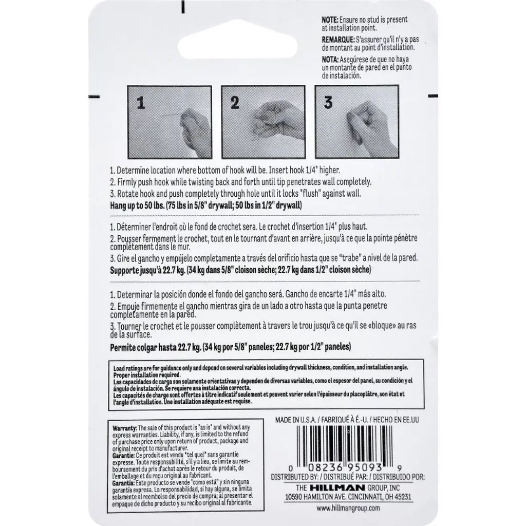 Hillman Monkey Hook Picture Hangers are a tool-free hanging solution that hangs your pictures in seconds! Simply use end of hanger to puncture wall, twist so hook is facing out, and push into wall until only hook is seen. Gorilla Grade Hooks are designed for heavy duty hanging of 50lbs. No pilot hole necessary.