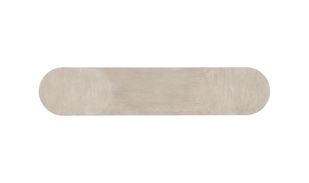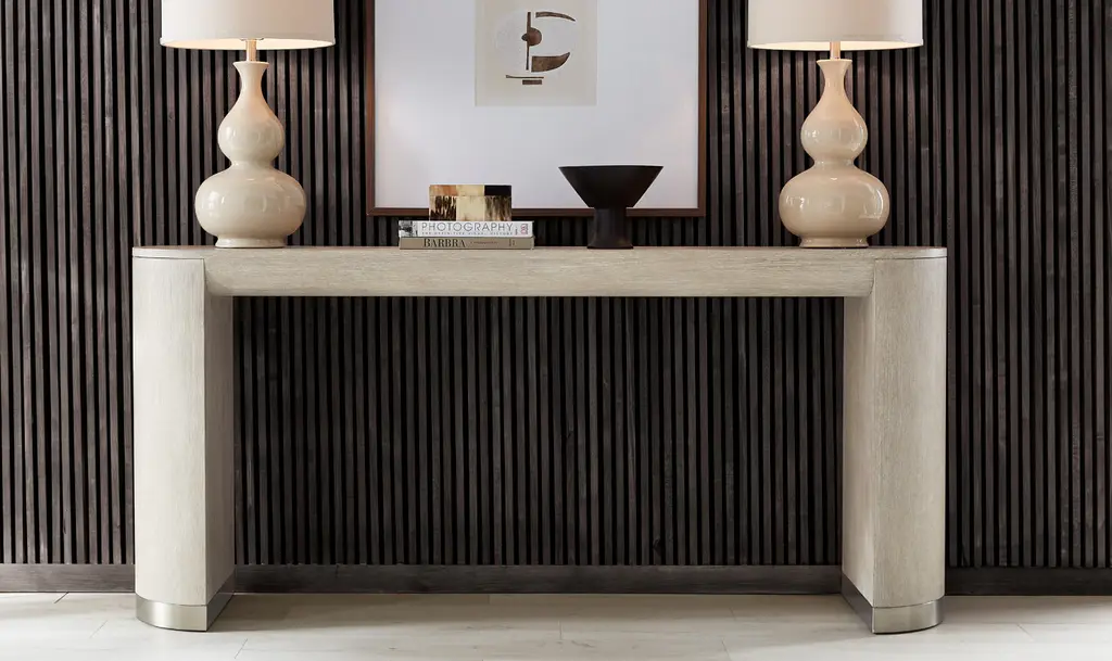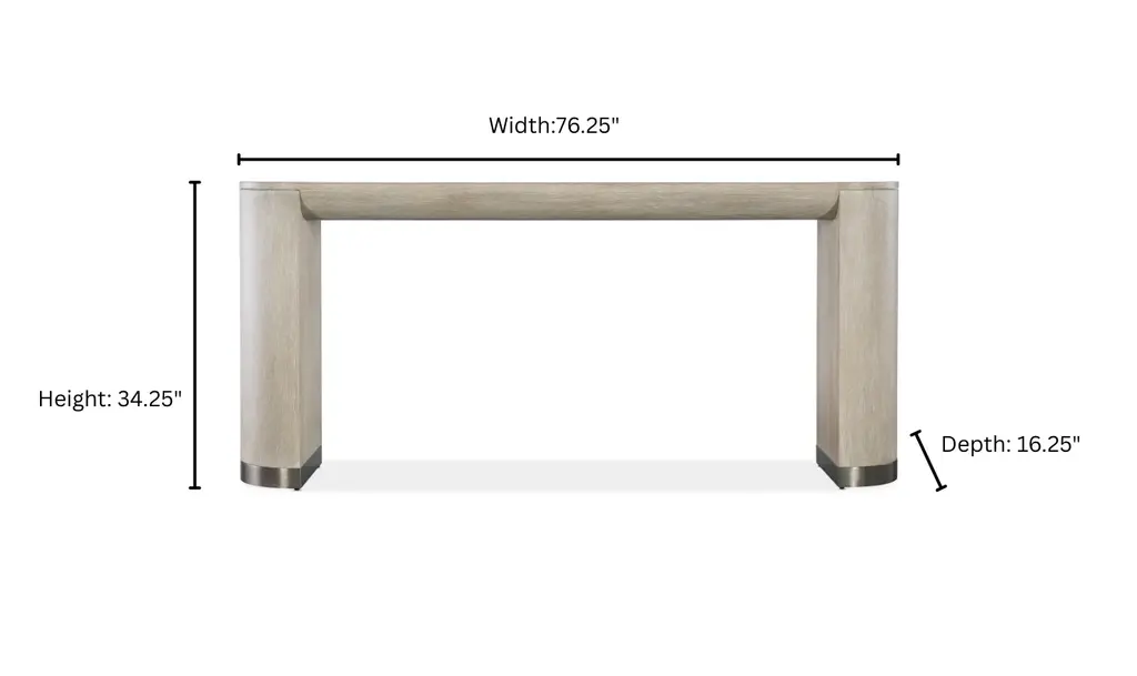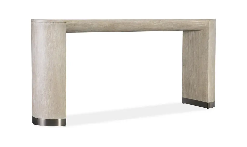 The Modern Mood Console Table from Hooker Furniture blends architectural form with a refined material palette. Crafted from flat cut quartered oak veneers in a light Diamond finish, it offers a soft mix of alabaster and pewter hues enhanced by subtle wire-brushed detailing. Its narrow, rounded rectangle silhouette, metal-wrapped leg bands, and matched veneer tabletop create a cohesive, finished look from every angle. At just over 16 inches deep, this piece fits comfortably into tight spaces while still making a distinctive visual statement. Every detail reflects the Modern Mood collection’s dedication to balanced proportions and enduring craftsmanship. The table’s rounded apron and legs soften its contemporary shape, while warm pewter metal accents bring a quiet sophistication. Built with a multiple-step finishing process for lasting clarity and durability, the console is both aesthetically versatile and structurally stable—suitable for living rooms, entryways, or open-plan spaces that call for a functional yet elevated furnishing.