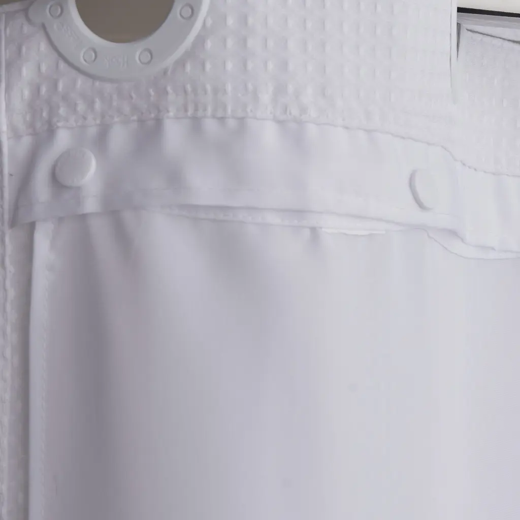 Extend the lifespan of your Hookless shower curtain effortlessly with our It’s A Snap! Fabric Snap-In Liner. This innovative liner is designed for quick and easy replacement, snapping on and off in seconds for seamless maintenance. Specially sewn hems ensure effective water repellence and enhance water run-off, minimizing mildew formation for a cleaner, more hygienic bathroom. Crafted from Water Resistant 100% Polyester, this liner is specifically designed for use with Hookless Shower Curtains featuring a sheer window. After each use, simply shake off the water and let the liner hang freely outside the tub, allowing it to air dry. For convenient care, machine wash the liner in warm water on a gentle cycle, and line dry for long-lasting use. The snap installation ensures a hassle-free setup, while the care instructions advise against ironing.