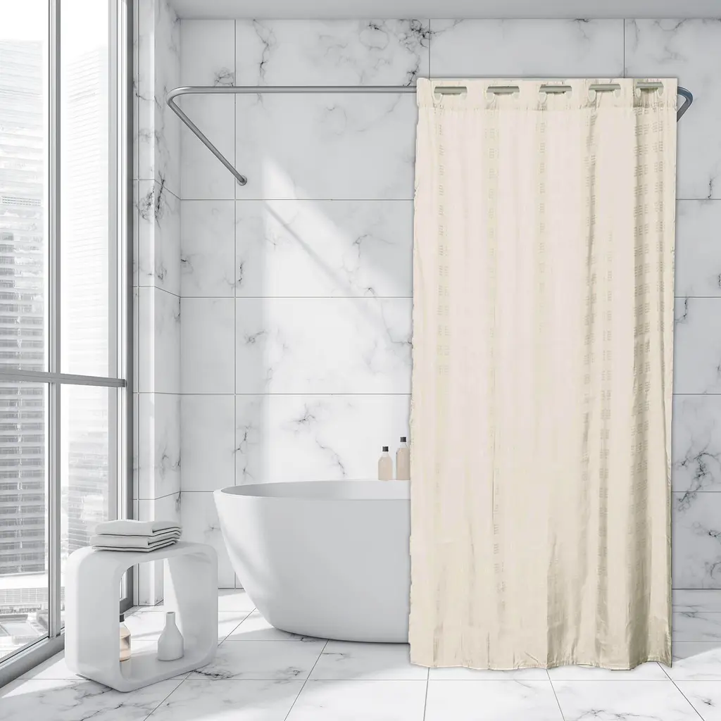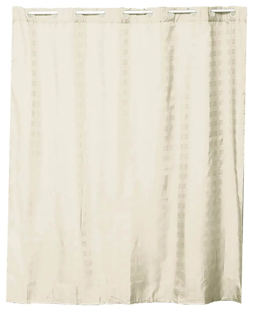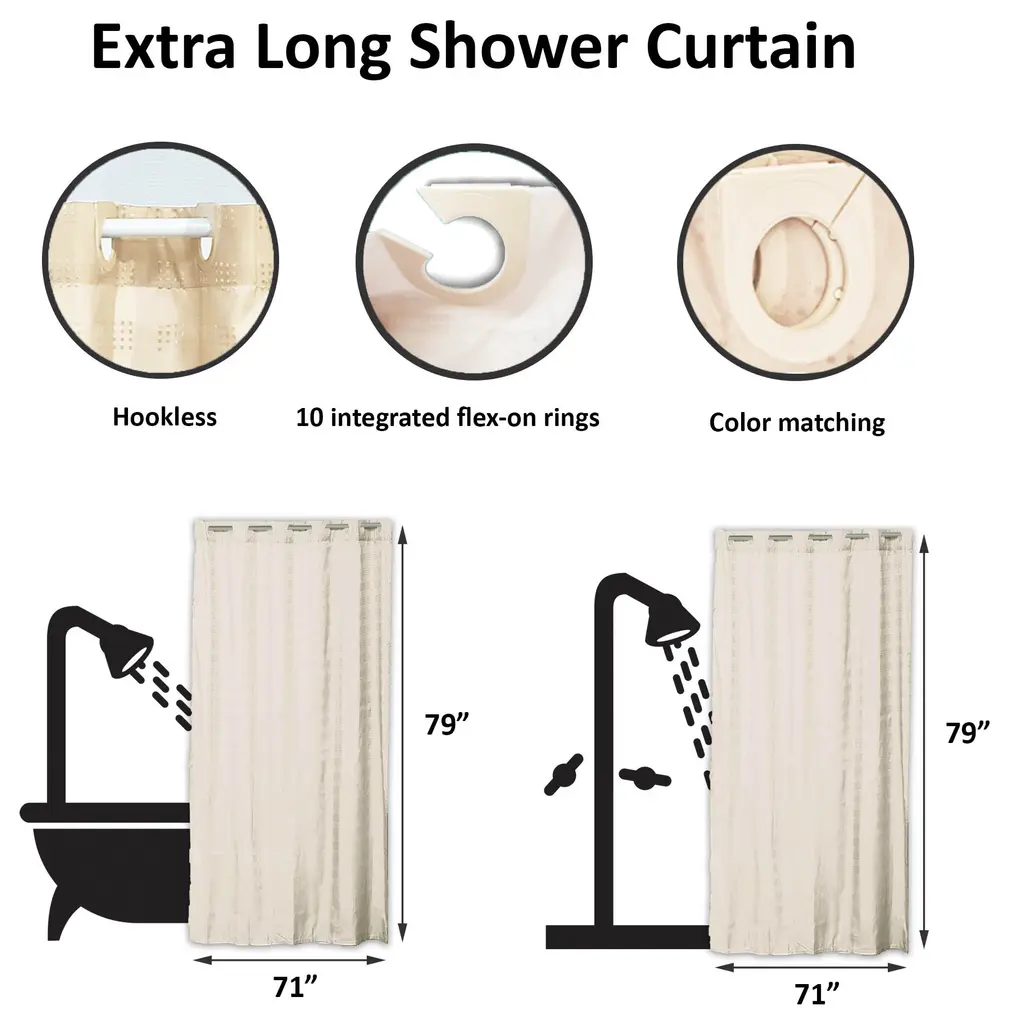 EXTRA LENGTH: With a regular width (71 inches) but a large height (79 inches)-180 x 200cm, this natural shower curtain fits also special shower heightINTEGRATED FLEX-ON RINGS: 10 color matching rings are integrated with the curtain which guarantee a clean design with no hidden ridges or unhygienic hook notches that can easily build up residue. So much easier to hang and to keep cleanLARGE COLOR CHOICE: With more than 8 colors, from the classic white to a modern almond green or taupe, decorate your bathroom in minutes and add a personal and unique touch to your shower!ELEGANT DESIGN: This hook less fabric shower curtain features a small cubic design, your bathroom will look upscale and clean cut. 100% polyesterWATERPROOF: Made of premium polyester, it keeps water in and the cold air out, small water beads from across the curtain, allowing gentle water removal and swift curtain drying. Machine washable with cold water, no dryer, no ironOrganize and design your bathroom with this natural extra long polyester cubic design shower curtain.Shower curtains are highly functional when you want to keep your bathroom clean. Accentuate your bath space and also add a French touch to your bathroom decor. Pick from beautiful tones, floral, stripes, geometric or abstract prints, solid colors, transparent and other eye-catching designs.Evideco offers shower curtains made of premium plastic (EVA), or of high quality polyester. You really don't need a liner anymore!Moreover, 3 dimensions are available: 71L x 71W (180 x 180 cm), 79L x 71W (200 x 180cm), 72L x 48W (180 x 120cm). Our bathroom curtains come with hook holes, reinforced grommets, headers, matching colored rings or hook less to offer an easy installation.This shower curtain will beautifully enclose your tub to keep the water off the floor and give you added privacy. Bath shower curtains also adds the right blend of functionality and style so you can enjoy your hot shower.After months of use, these plastic bathroom shower curtains will still look as good as new. Moreover, our bathroom curtains come with various textures and will stand out in the bathroom.This natural extra long polyester cubic design shower curtain comes with dimensions of 79L x 71W (200 x 180cm). So easy to add more character to your bathroom!
