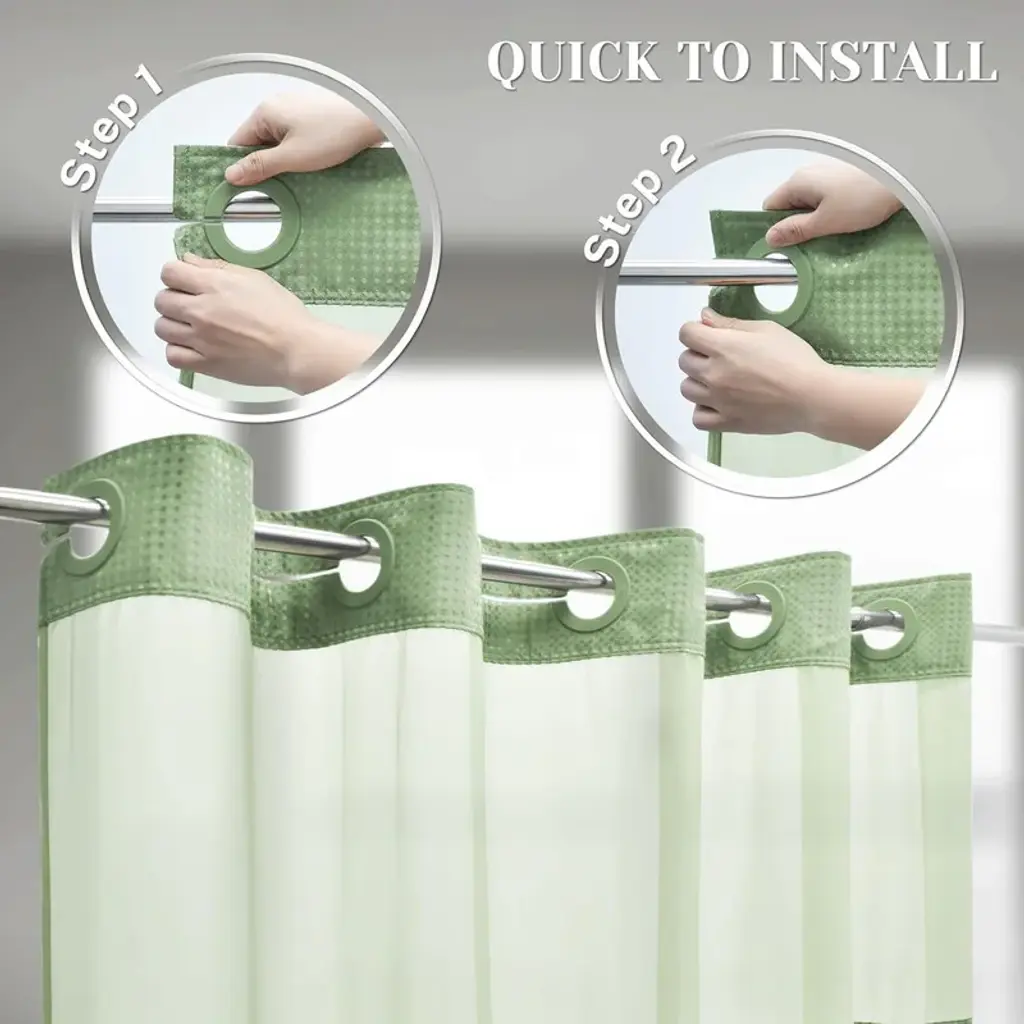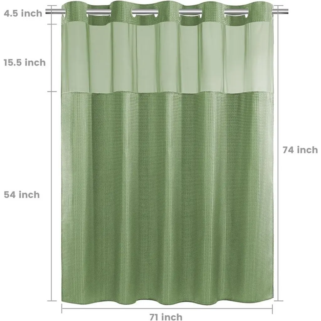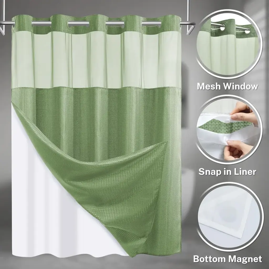 Hookless Shower Curtain With Snap-In Liner Set Waffle Shower Curtain For Bathroom Hotel Style Fabric Waterproof Liner - 71" W X 74" H, Green