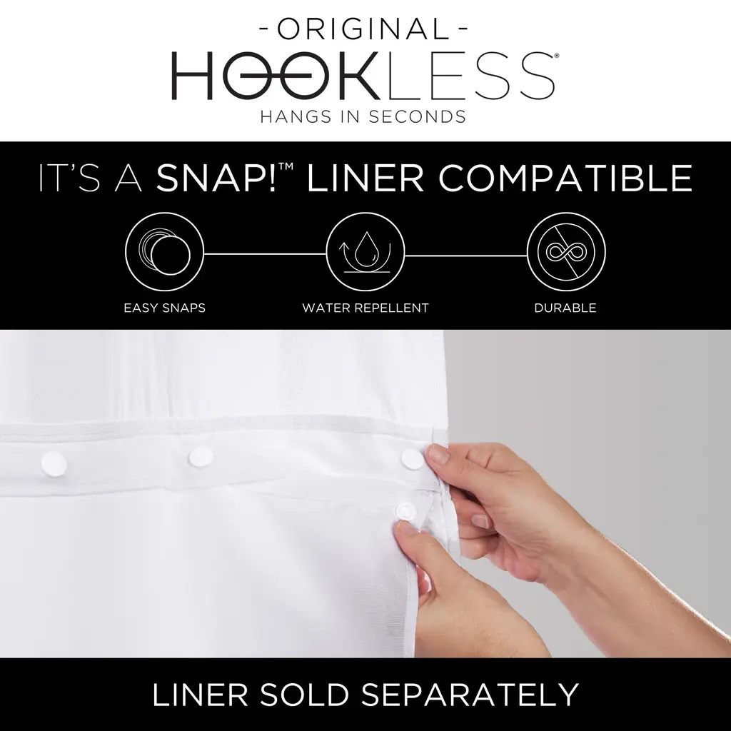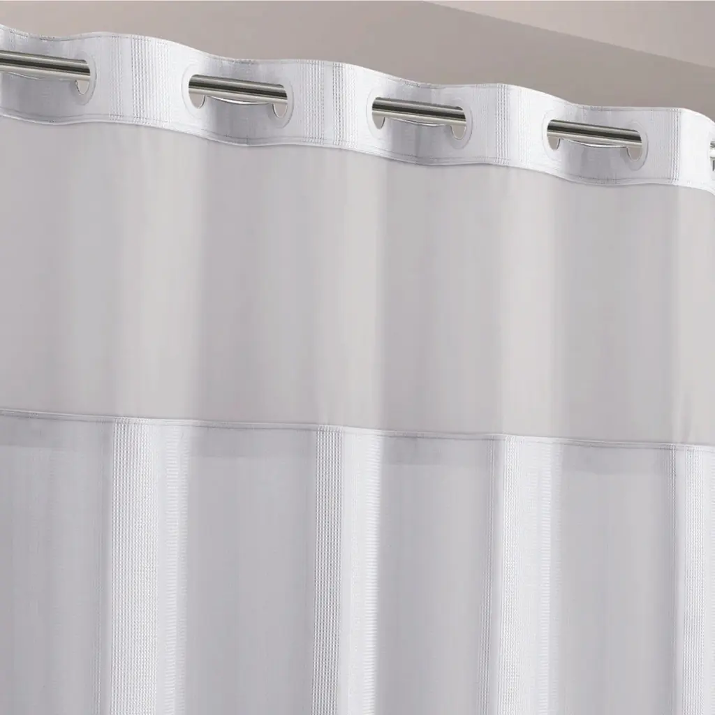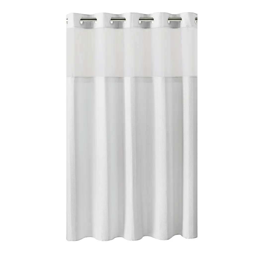 Add a classic look to your bath with the Hookless Waffle Stripe Shower Curtain! Crafted from durable 100% polyester Dobby weave, the fabric shower curtain offers both style and reliability. With the FLEX-ON rings, installation is a breeze - no need to take down your shower curtain rod or purchase separate hooks. The standout feature of this set is the sheer top window, allowing natural light to filter through while maintaining your privacy. This thoughtful addition also helps reduce humidity and moisture buildup in your bathroom. The Waffle Stripe curtain is compatible with Hookless It’s a Snap! Liner, sold separately. Cleaning and maintenance are simple tasks. Our OEKO-TEX certified Hookless shower curtains, are crafted with safety in mind. After each use, just shake off the water and let it air dry. For deeper cleaning, the shower curtain is machine washable on a gentle cycle. The Hookless Waffle Shower Curtain is a 100% polyester fabric shower curtain, with rust resistant FLEX-ON built-in rings for easy hanging