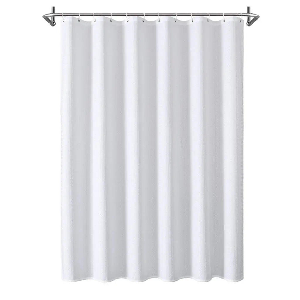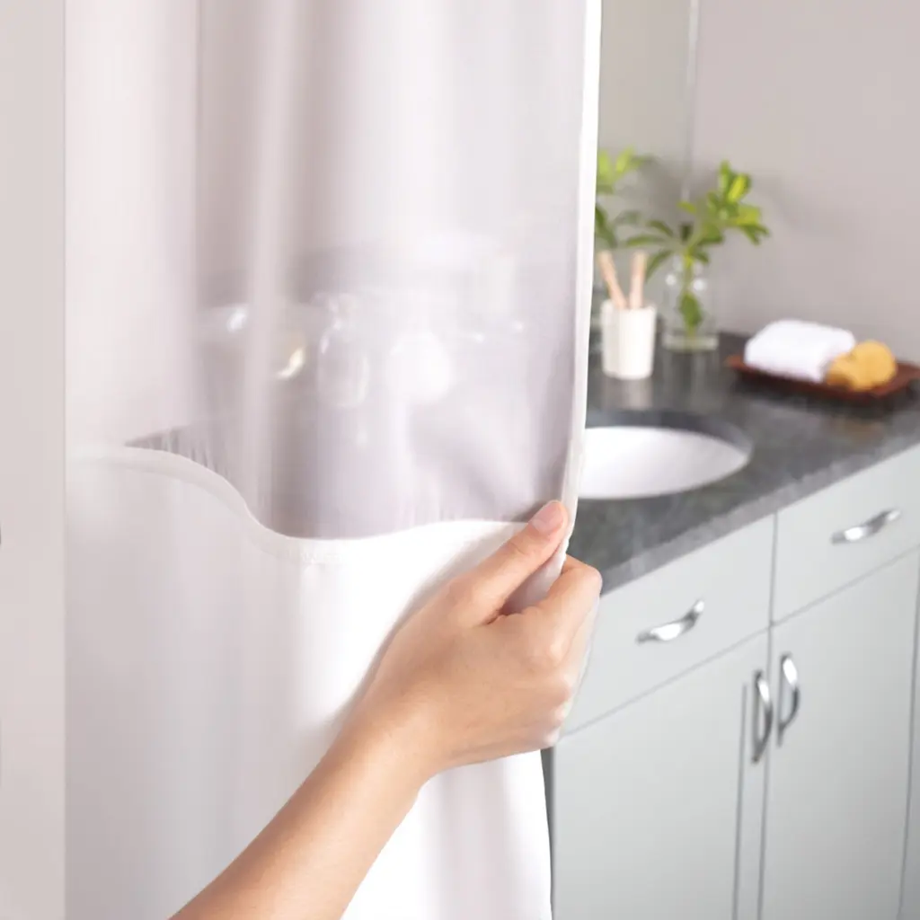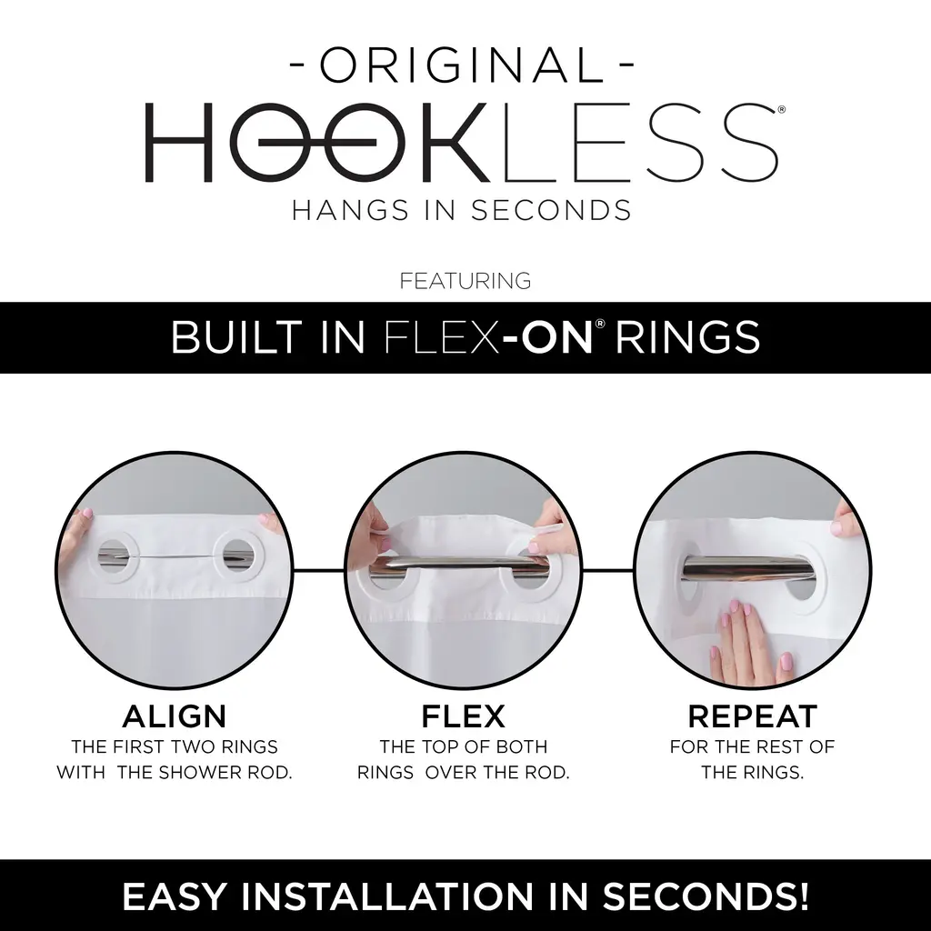 Add a classic look to your bath with the Hookless Waffle Stripe Shower Curtain! Crafted from durable 100% polyester Dobby weave, the fabric shower curtain offers both style and reliability. With the FLEX-ON rings, installation is a breeze - no need to take down your shower curtain rod or purchase separate hooks. The standout feature of this set is the sheer top window, allowing natural light to filter through while maintaining your privacy. This thoughtful addition also helps reduce humidity and moisture buildup in your bathroom. The Waffle Stripe curtain is compatible with Hookless It’s a Snap! Liner, sold separately. Cleaning and maintenance are simple tasks. Our OEKO-TEX certified Hookless shower curtains, are crafted with safety in mind. After each use, just shake off the water and let it air dry. For deeper cleaning, the shower curtain is machine washable on a gentle cycle. The Hookless Waffle Shower Curtain is a 100% polyester fabric shower curtain, with rust resistant FLEX-ON built-in rings for easy hanging